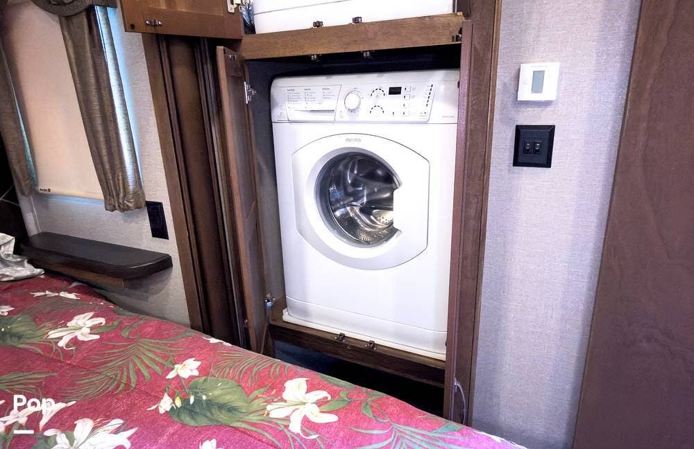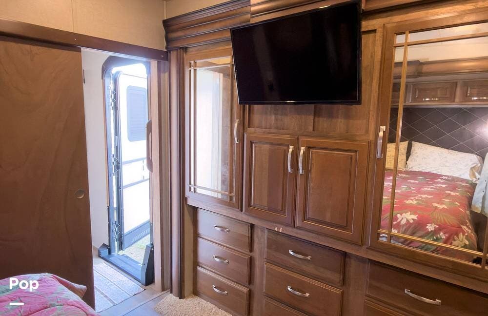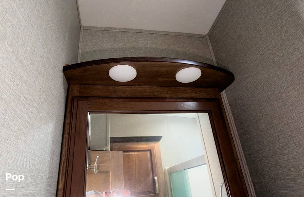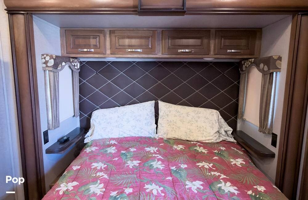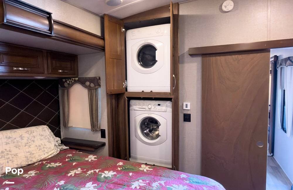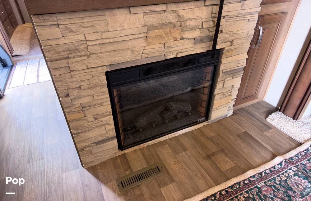 Beautiful 5th wheel with the best features! Enjoy a living area in center with 2 sofa beds & recliners, satellite TV, fireplace, washer/dryer & more!