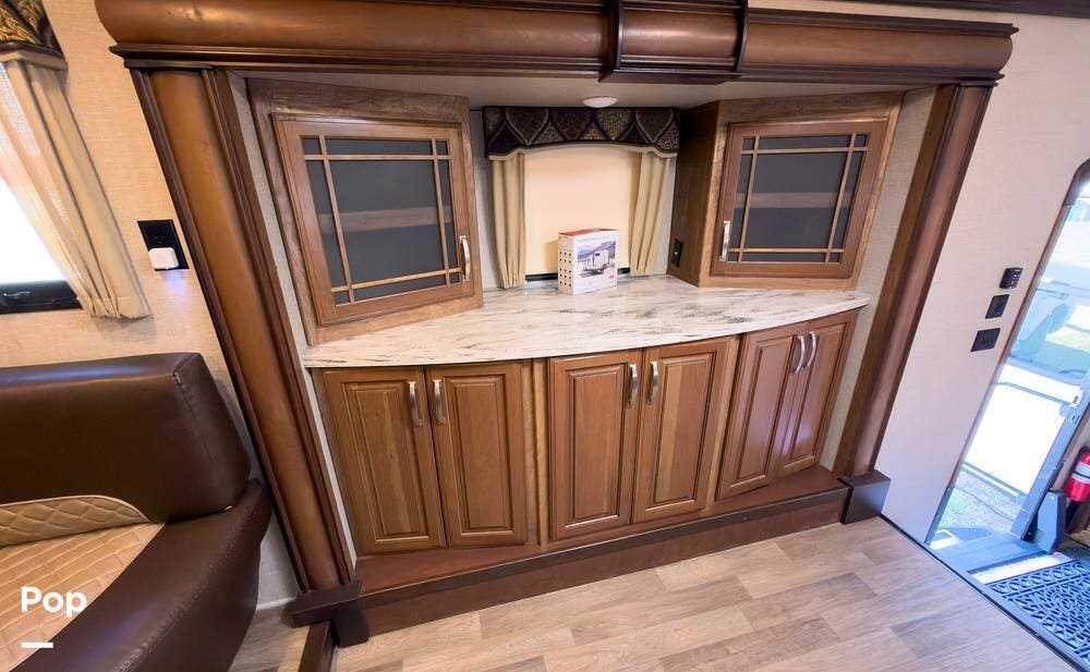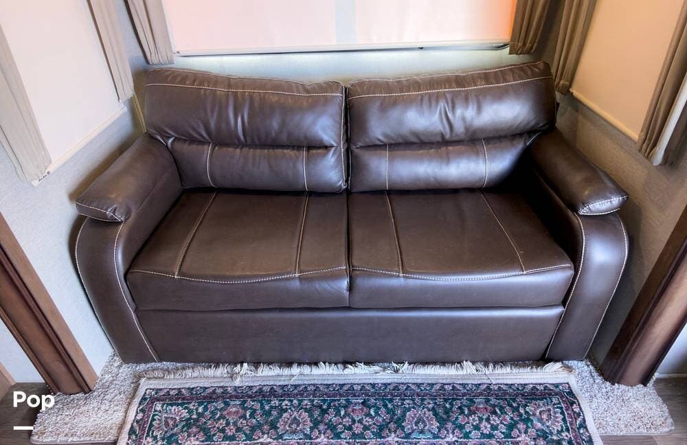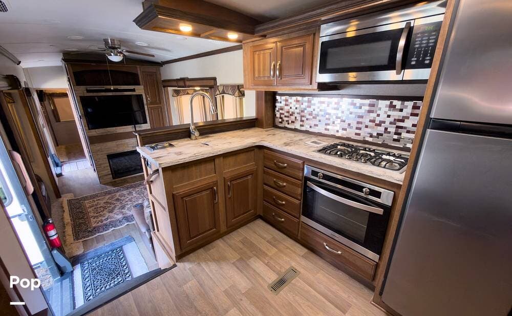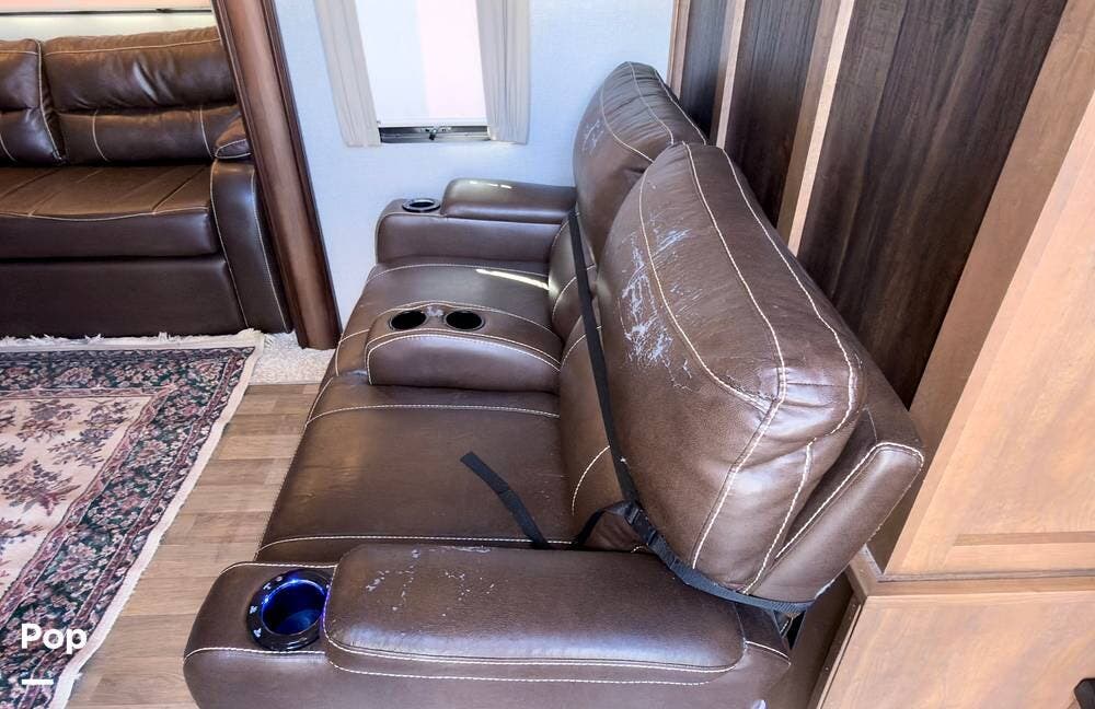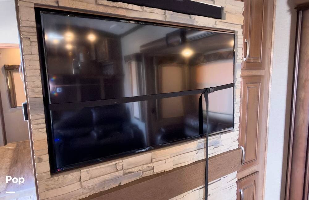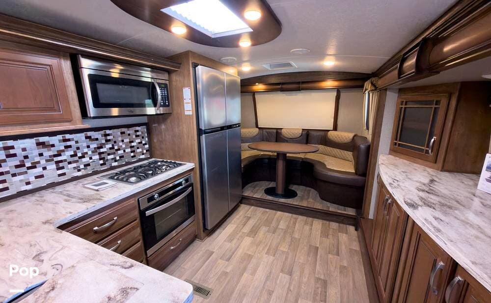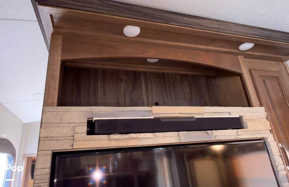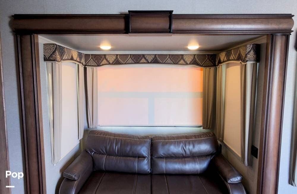 Inside, the front living area includes two sleeper sofas, power stadium seating, touch controls, and a removable armrest. The entertainment center features a TV, electric fireplace, stereo, and storage, all accented by soft mood lighting. One standout is the panoramic front window- a unique design that brings in natural light and great views to the elevated front kitchen.