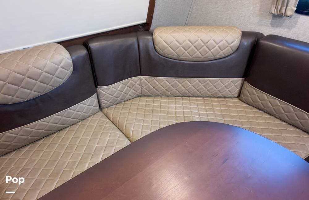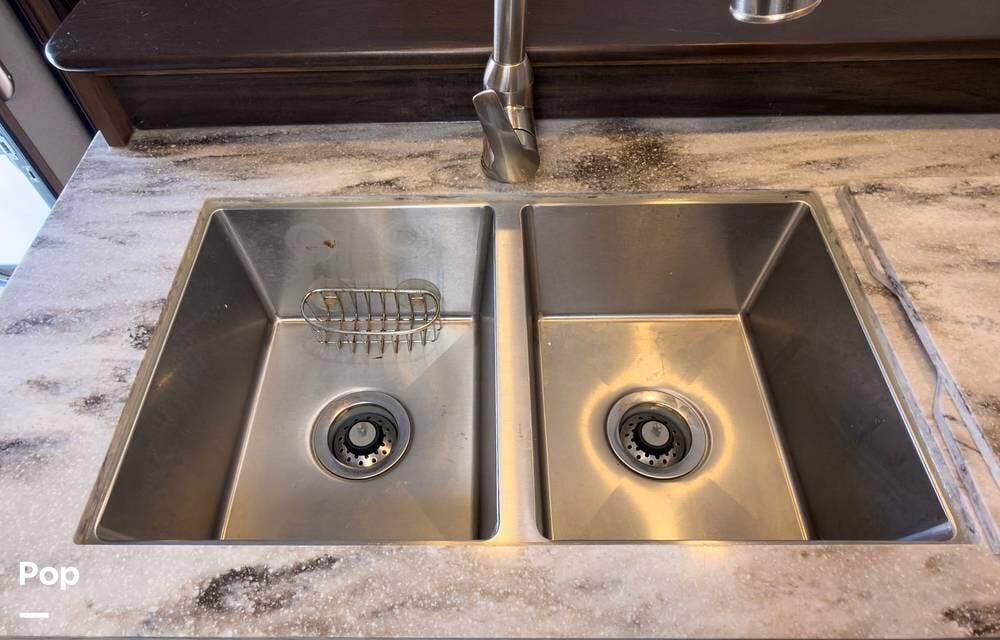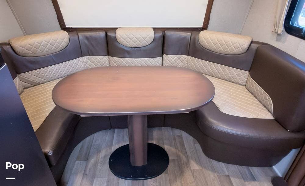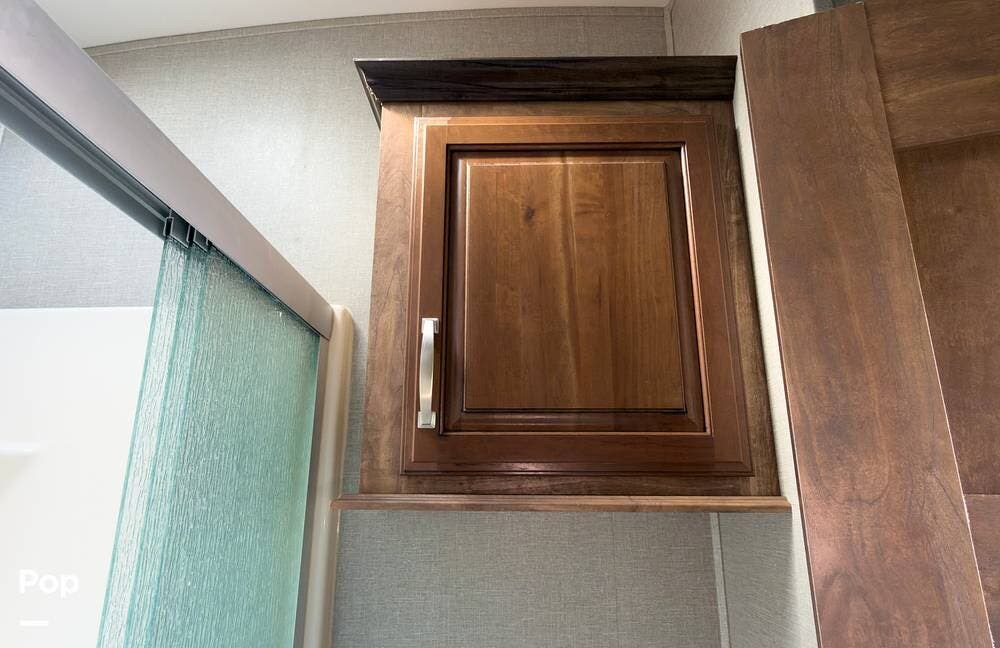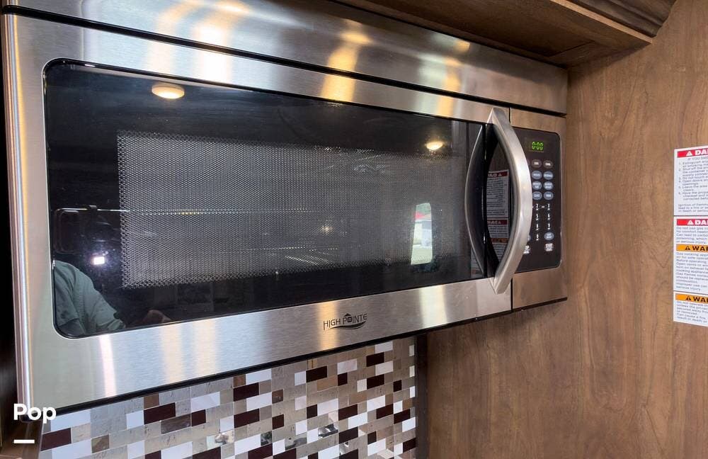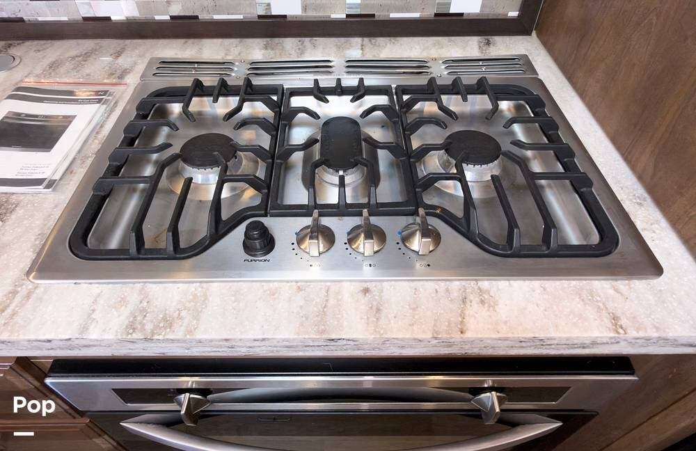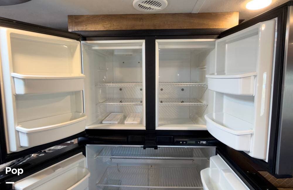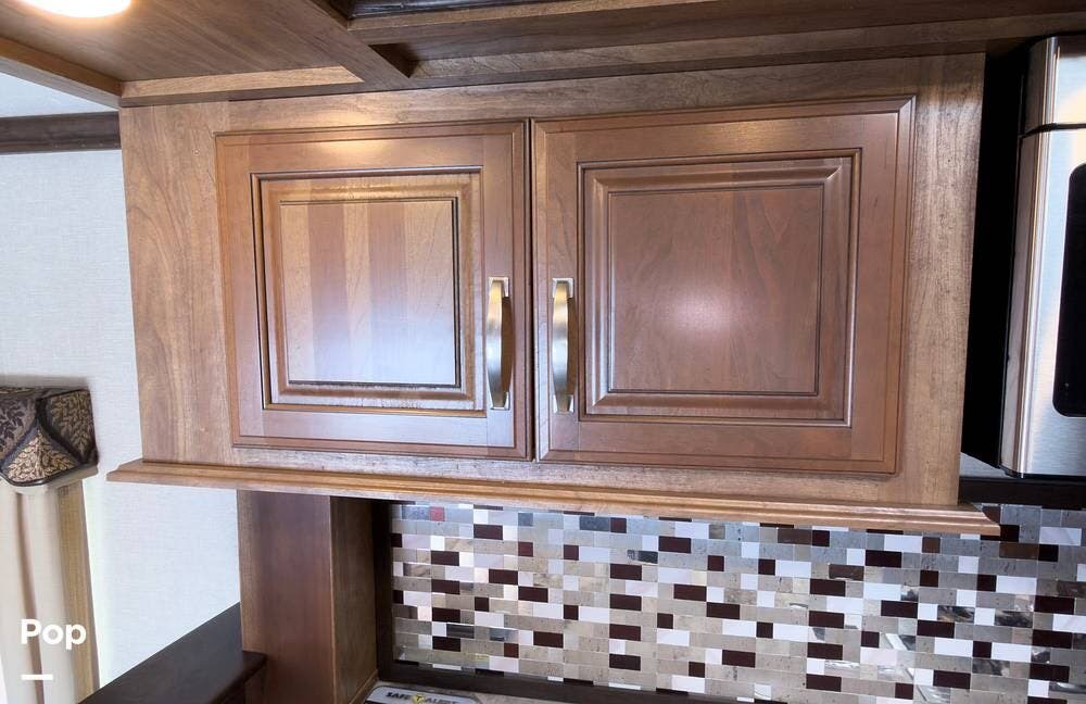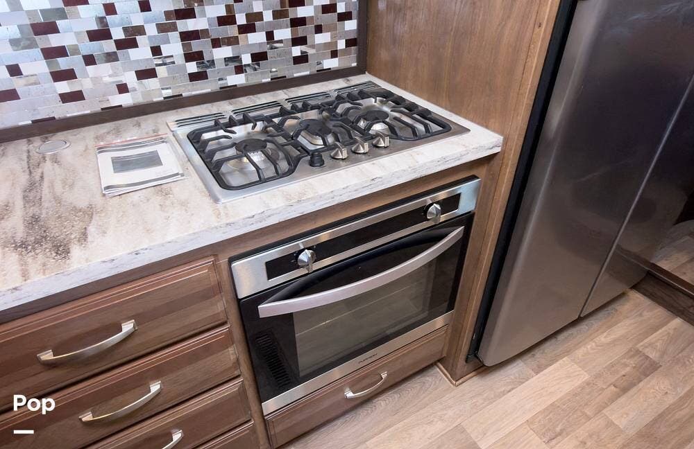 Inside, the front living area includes two sleeper sofas, power stadium seating, touch controls, and a removable armrest. The entertainment center features a TV, electric fireplace, stereo, and storage, all accented by soft mood lighting. One standout is the panoramic front window- a unique design that brings in natural light and great views to the elevated front kitchen.