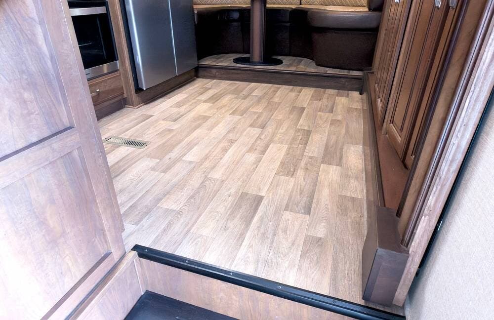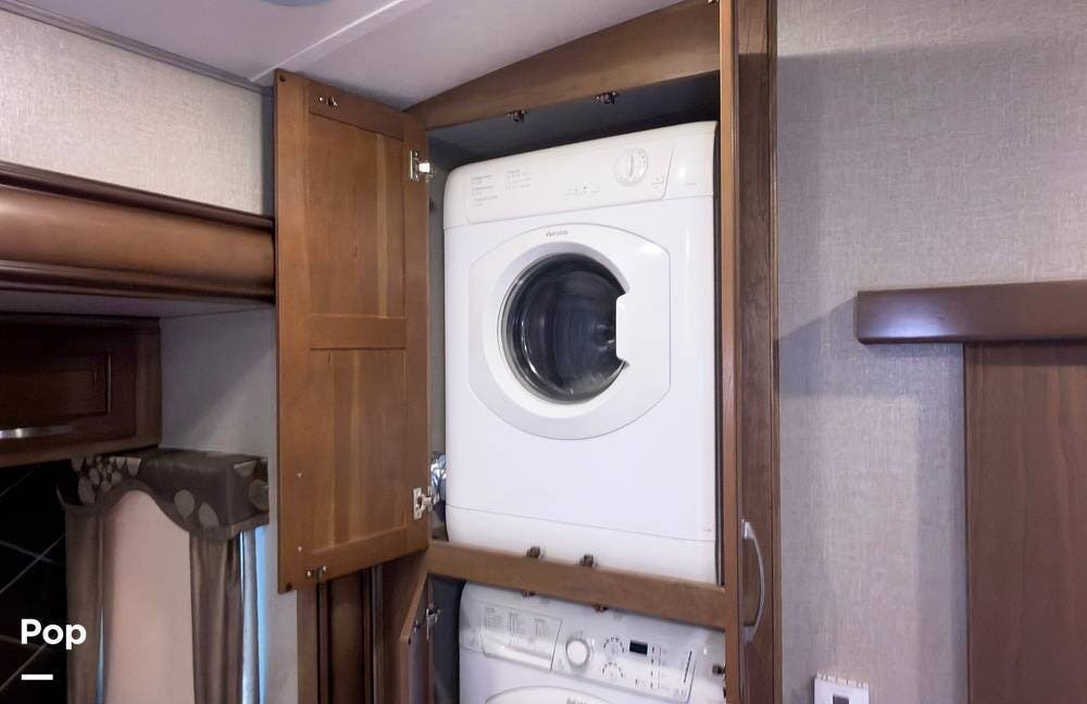 At the rear, the king-size bed lifts for under-bed storage, and the bedroom is fitted with a large wardrobe, an entertainment area, and a washer/dryer combo. Carpeting adds comfort here, while durable vinyl flooring runs through the main areas.