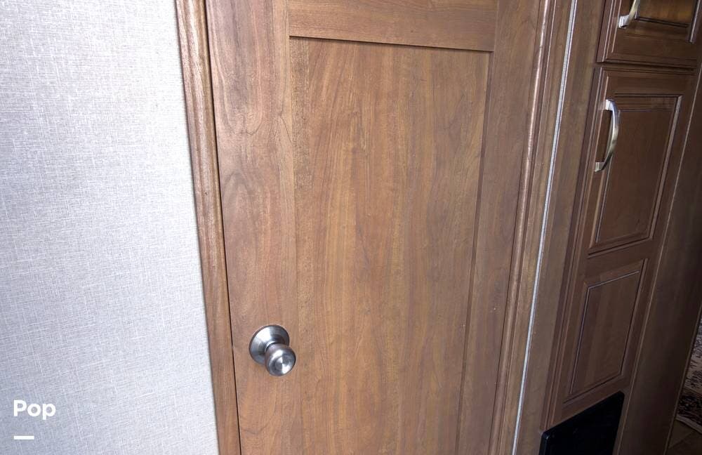 Outside, you'll find a spacious pass-through compartment with a docking station and central vacuum control, hydraulic leveling jacks, an outdoor shower, and a large awning that covers both entry doors. With five slides, it offers generous interior space, convenient exterior-access storage, and a spare tire holder.