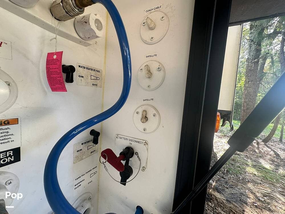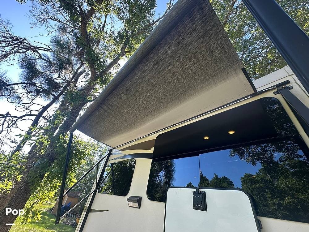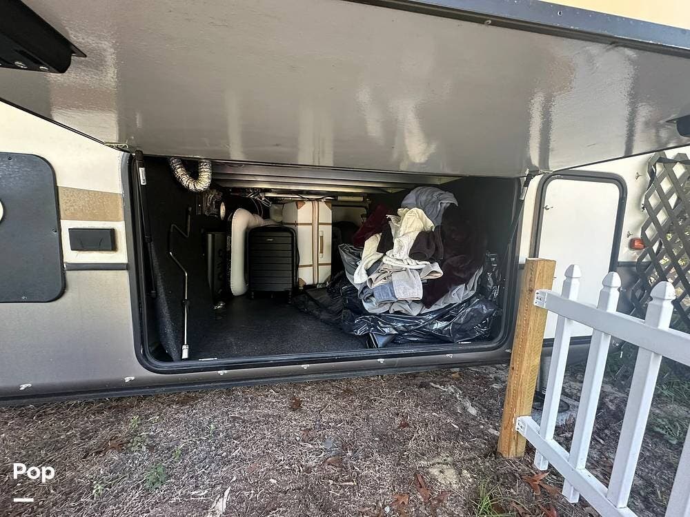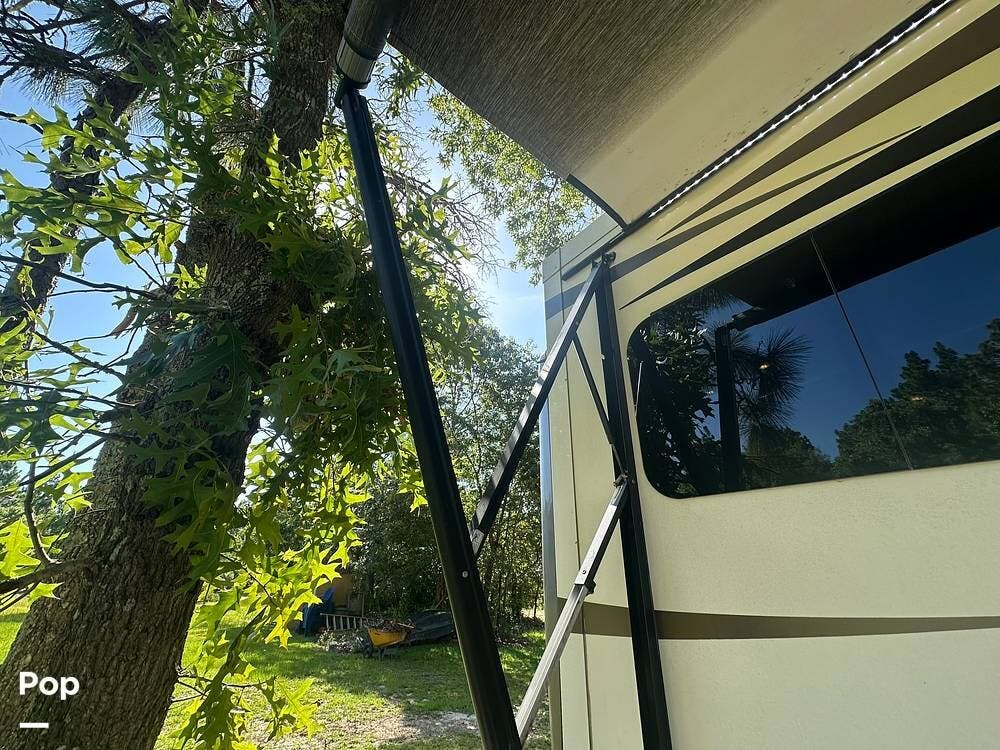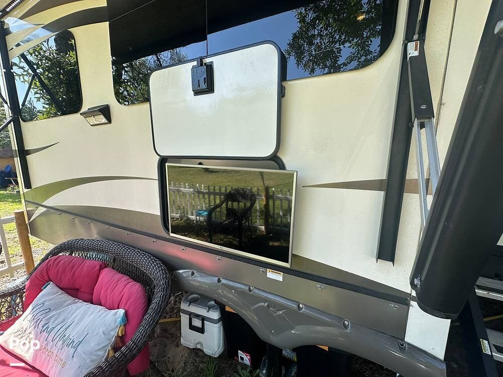 The outside living space is equipped with an outdoor TV and stereo speakers. Two large awnings protect you from the environment. Plenty of storage, including a large pass-through.