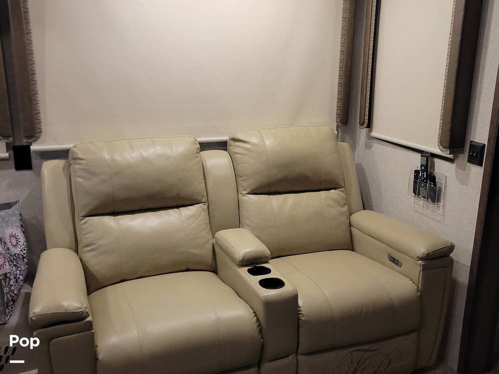 The living area is thoughtfully designed with practicality in mind. It includes an entertainment center, a large LED HDTV, and a fireplace. The seating area features a sofa and theater-style recliners.
