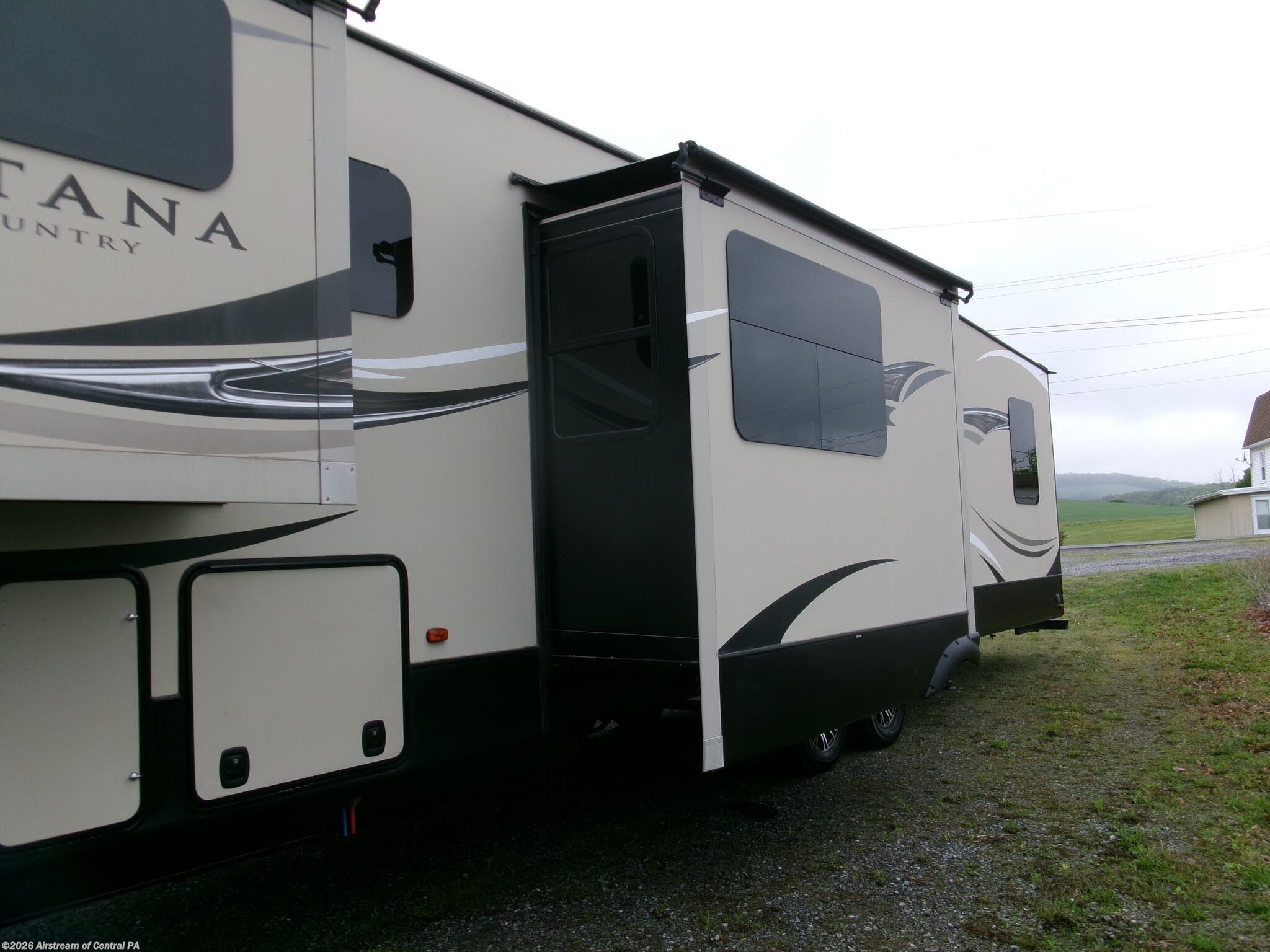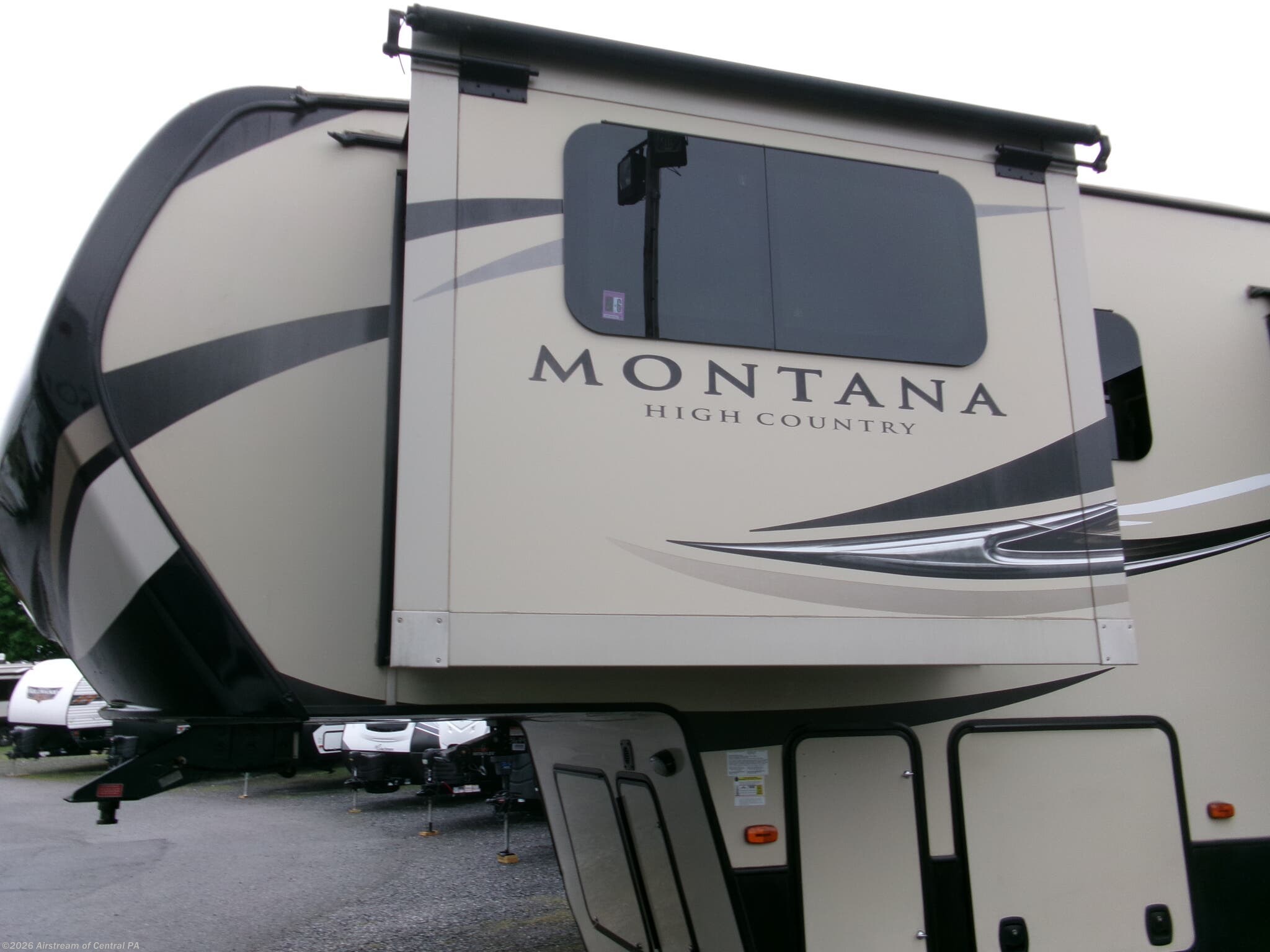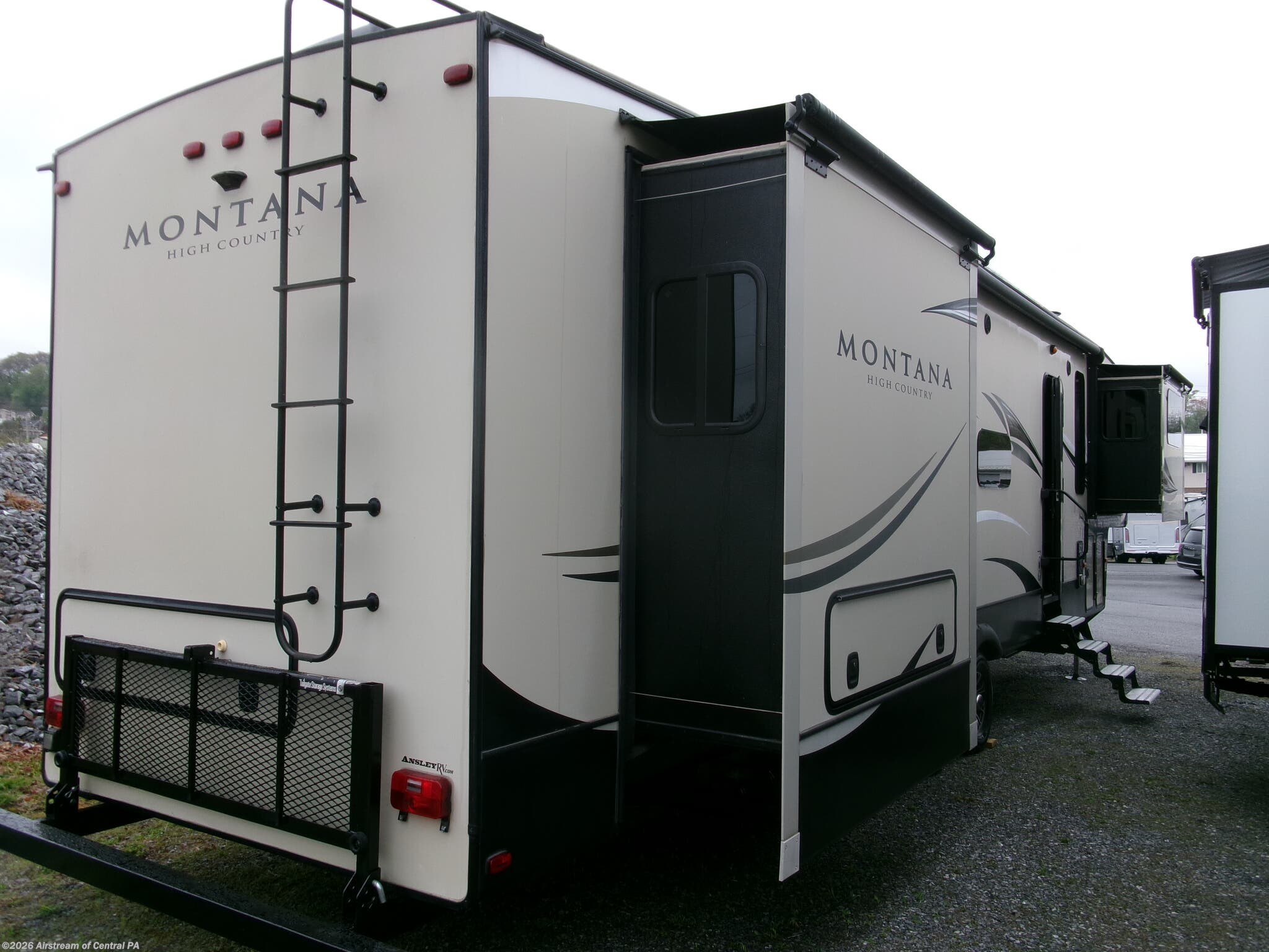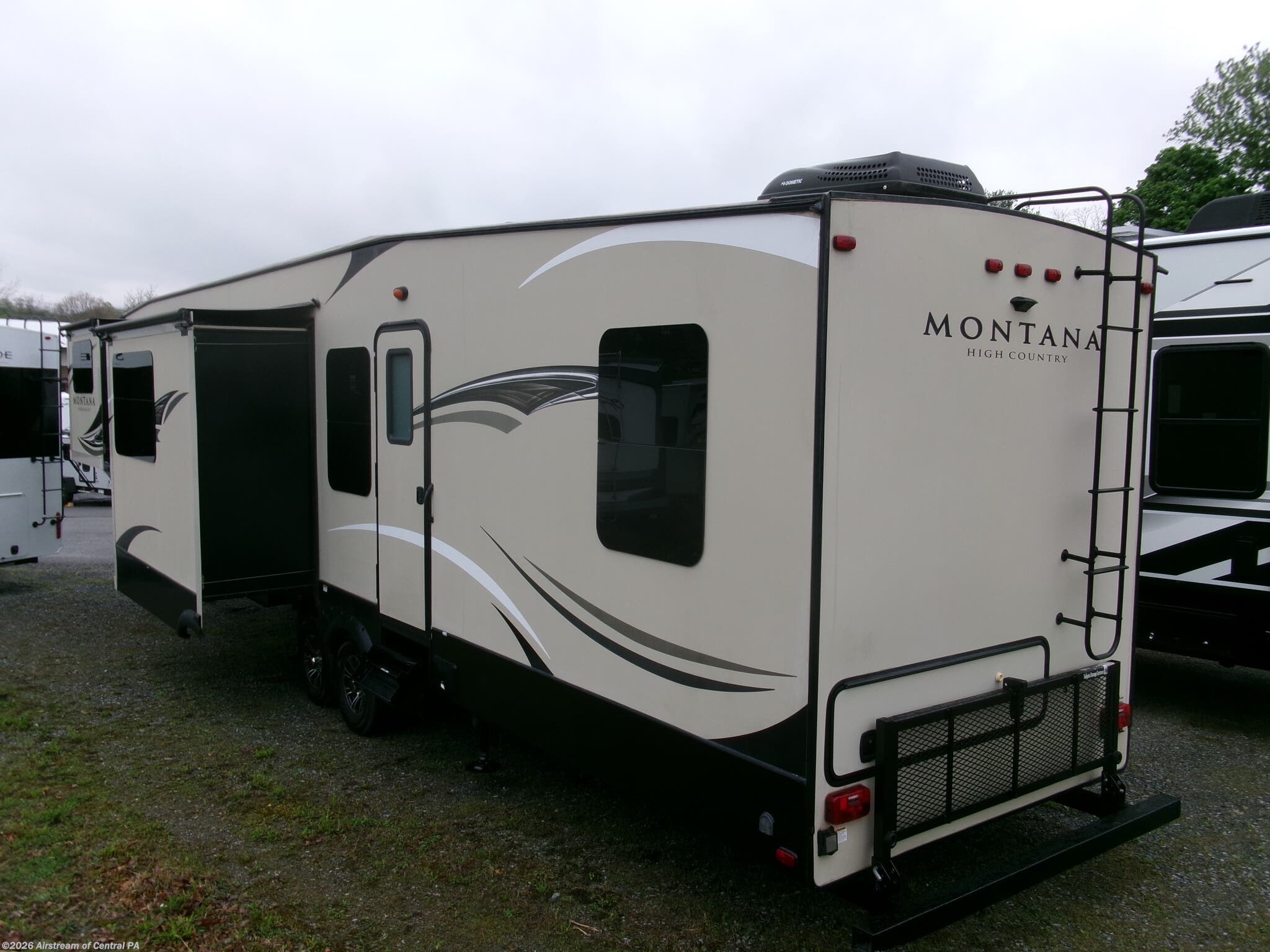 If you like uniqueness with luxury and convenience then it's time to take it up a notch in this Montana High Country fifth wheel. Model 375FL offers a patent-pending front windshield design and unique dual entry, one main entrance along the curbside and one entry across from the bathroom along the roadside. You will enjoy great traffic patterns from this floorplan design. The front living area offers plenty of seating choices plus a HD LED TV above an electric fireplace controlled by a remote to keep you warm during the chilly nights. The rear bedroom allows you to relax and rest on a queen bed with a shiplap design headboard, and watch a 32" HD LED TV before bedtime. You will find plenty of storage throughout the interior as well as outside, and a 2" receiver hitch on the rear, plus much more!