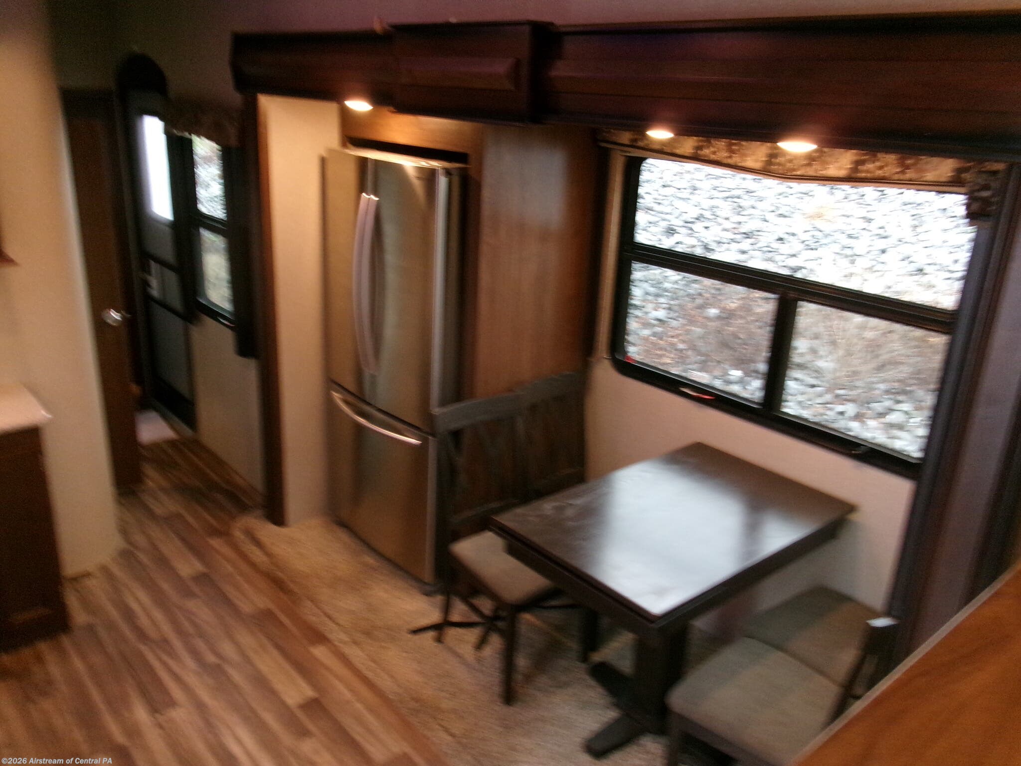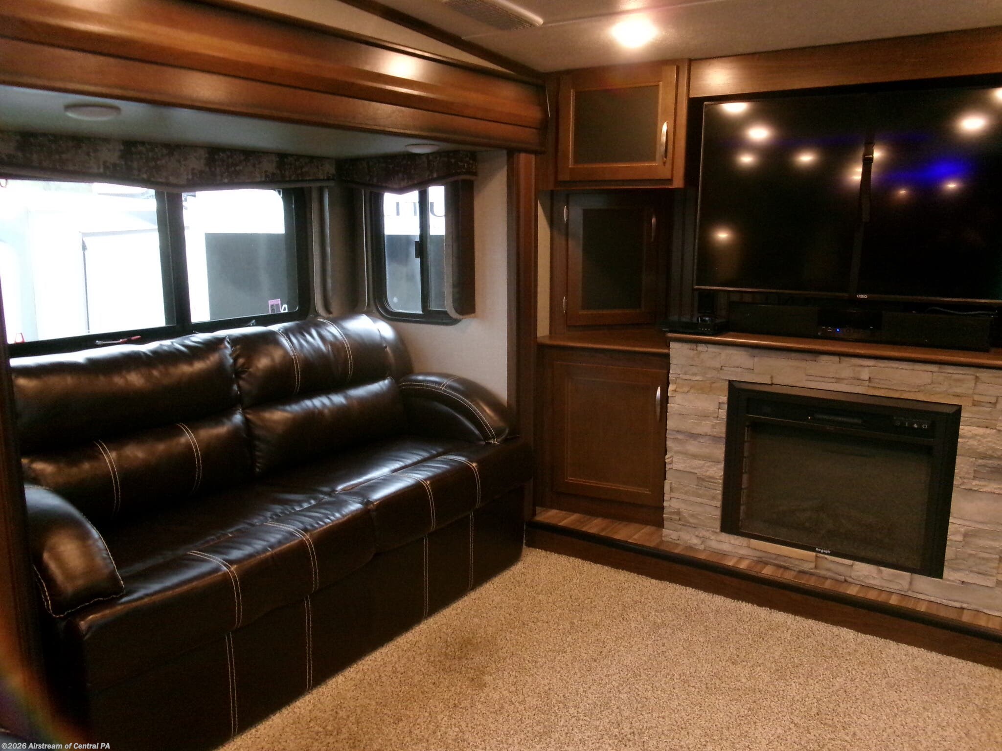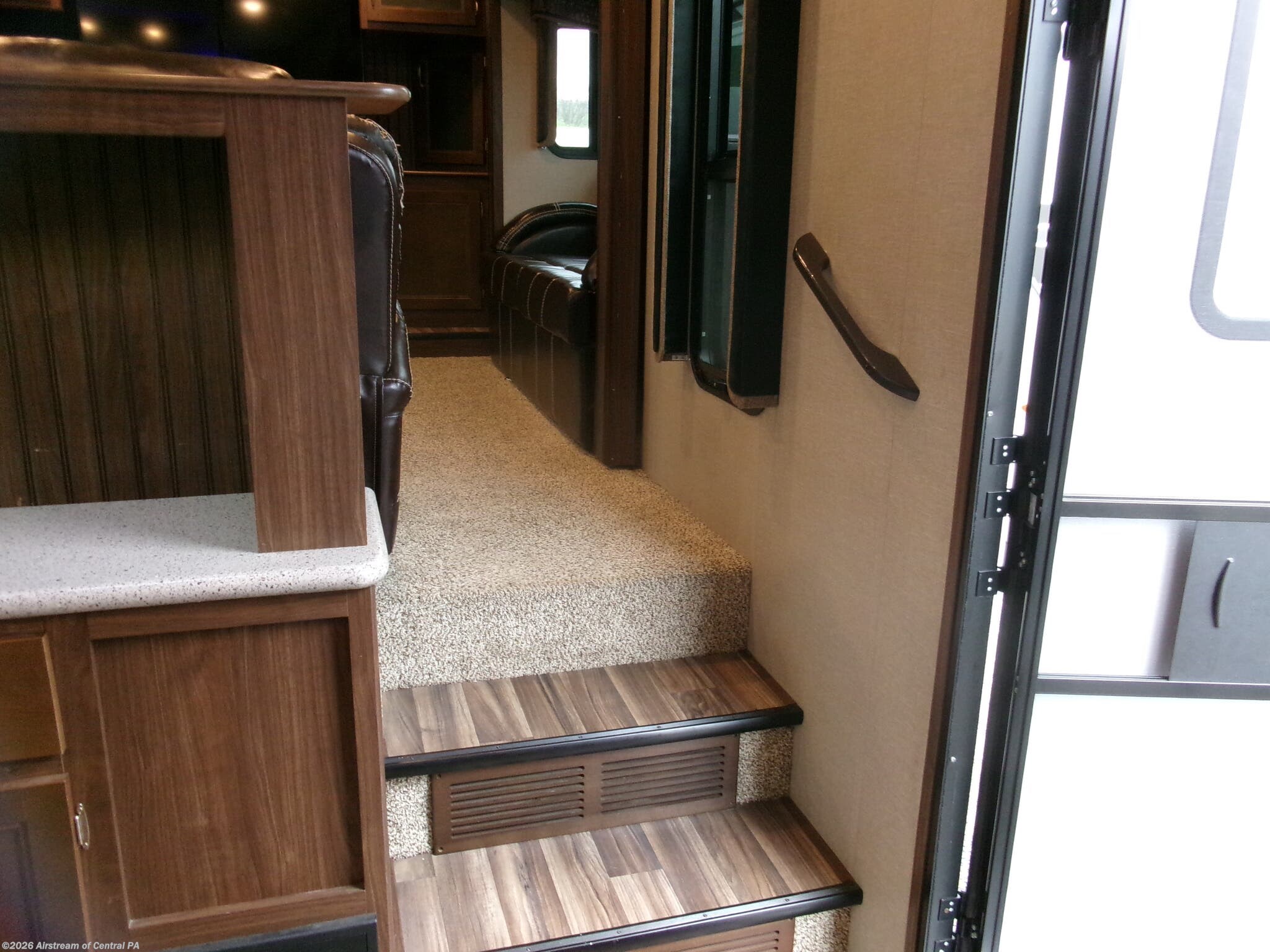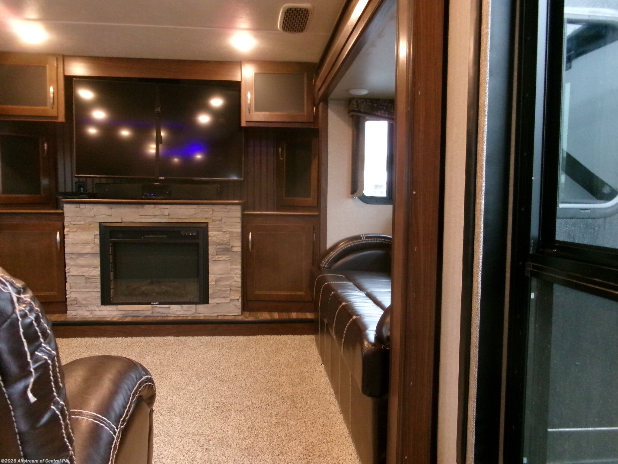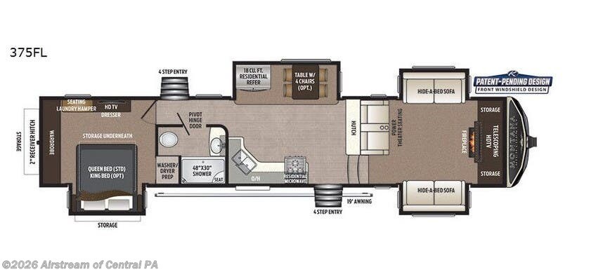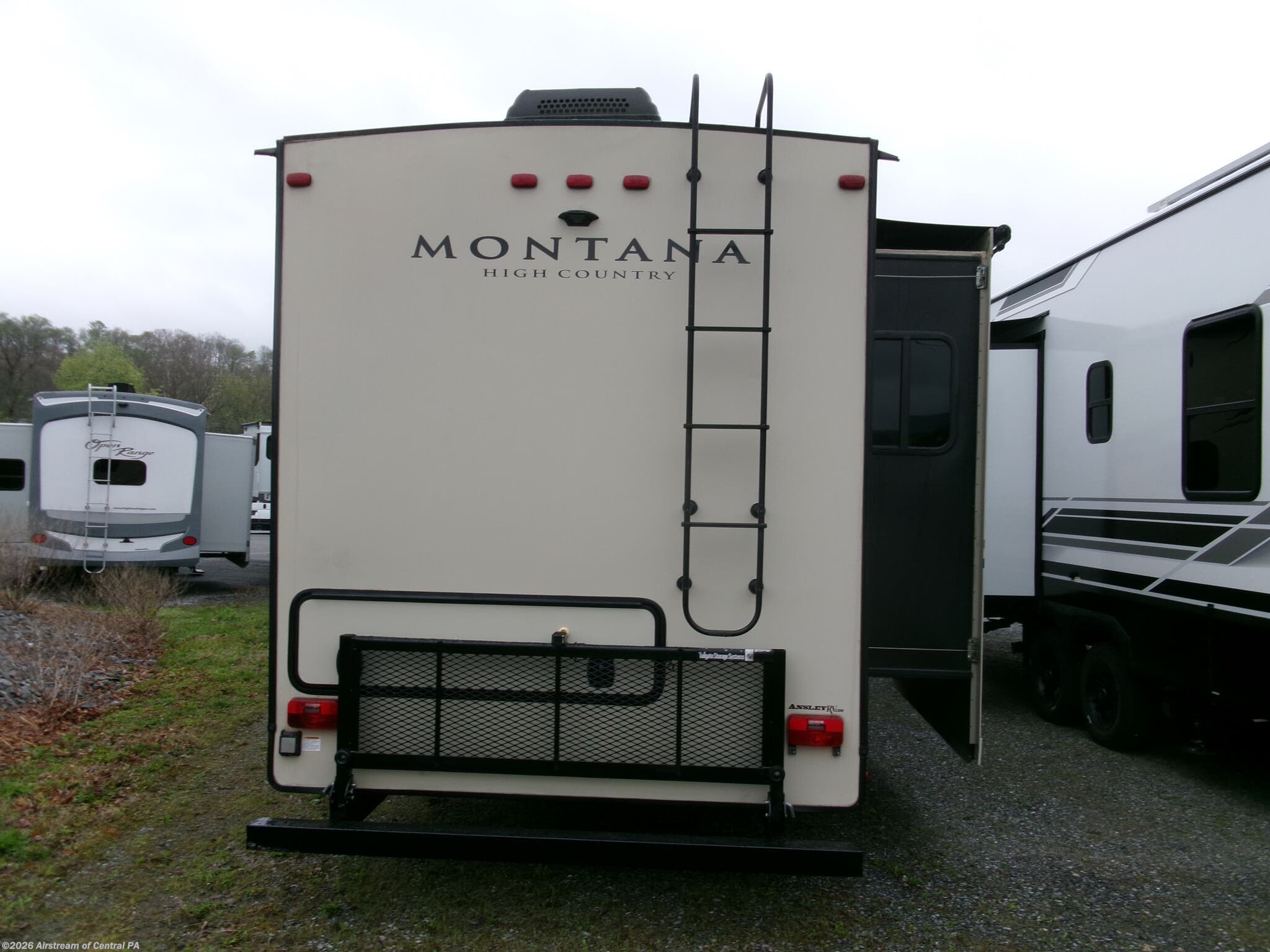 If you like uniqueness with luxury and convenience then it's time to take it up a notch in this Montana High Country fifth wheel. Model 375FL offers a patent-pending front windshield design and unique dual entry, one main entrance along the curbside and one entry across from the bathroom along the roadside. You will enjoy great traffic patterns from this floorplan design. The front living area offers plenty of seating choices plus a HD LED TV above an electric fireplace controlled by a remote to keep you warm during the chilly nights. The rear bedroom allows you to relax and rest on a queen bed with a shiplap design headboard, and watch a 32" HD LED TV before bedtime. You will find plenty of storage throughout the interior as well as outside, and a 2" receiver hitch on the rear, plus much more!