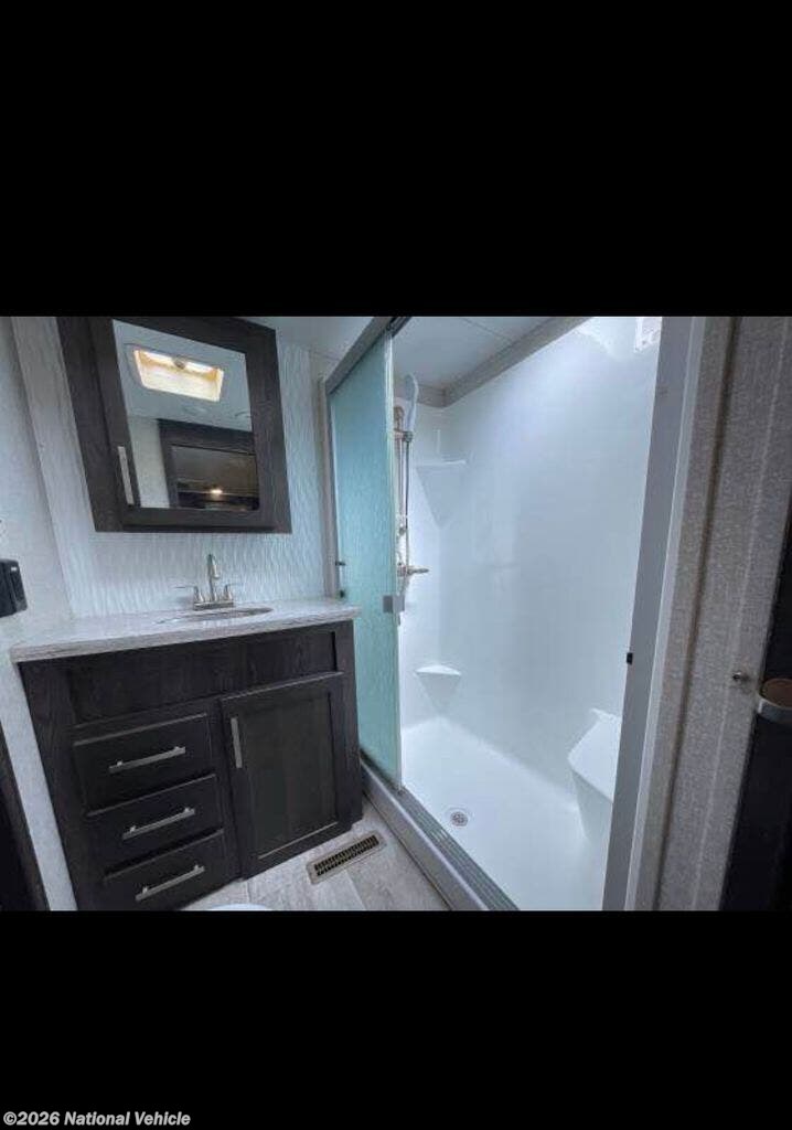 The private front master suite includes a king bed and generous wardrobe space, while the bath-and-a-half layout adds convenience for guests and everyday living. Built with large holding tanks and dual A/C systems, this unit is designed for comfort whether you?re at a campground or off the grid.