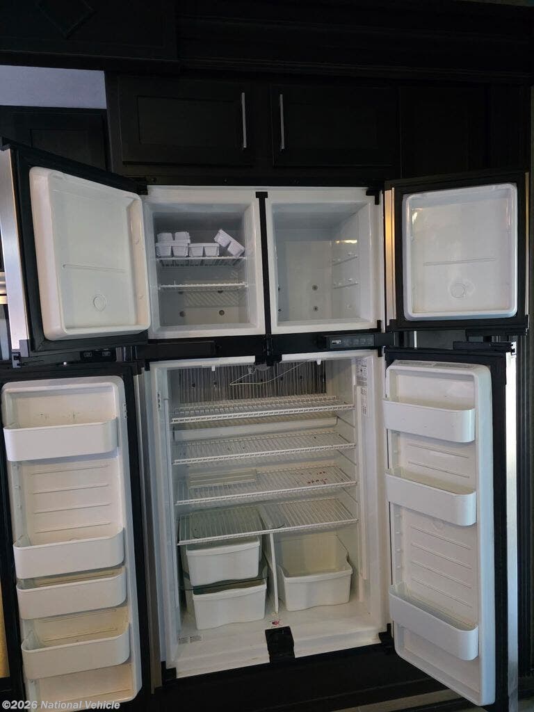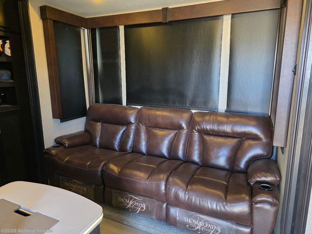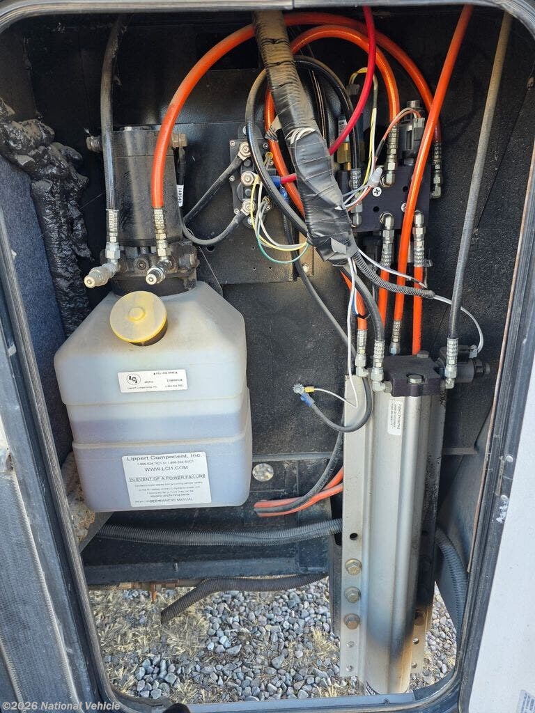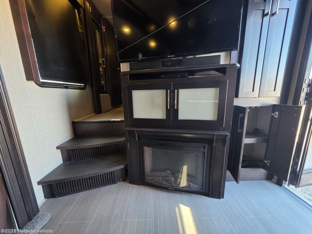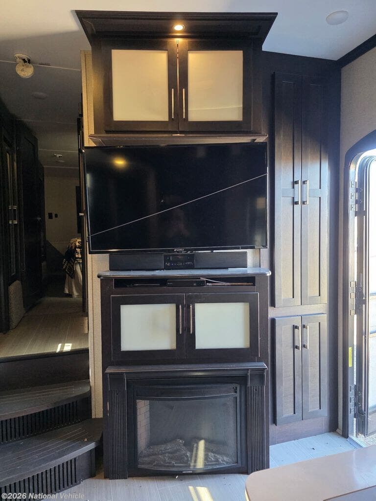 Inside the main living area, you?ll find a beautifully appointed interior with solid surface countertops, residential-style cabinetry, premium furnishings, and a large entertainment center with a flat-screen TV and fireplace. The open-concept kitchen is equipped with stainless steel appliances, a large refrigerator, 3-burner range with oven, microwave, and generous pantry storage-perfect for extended trips.