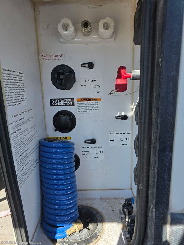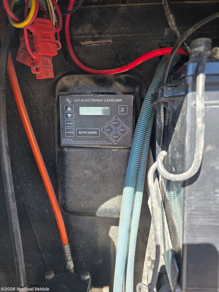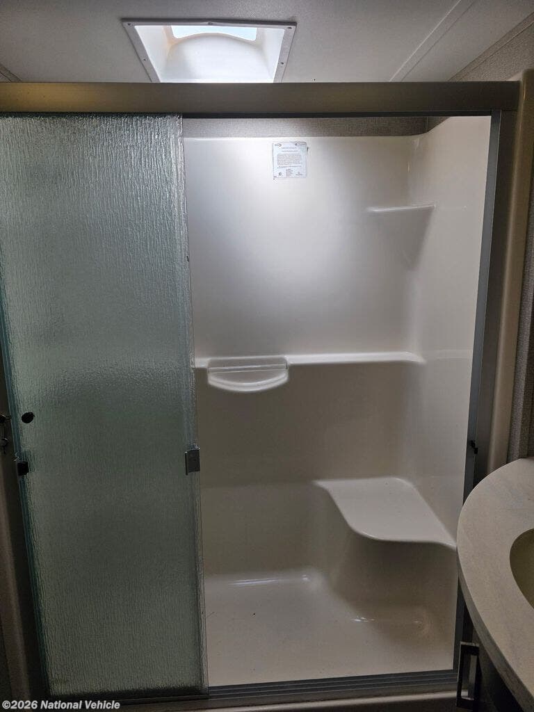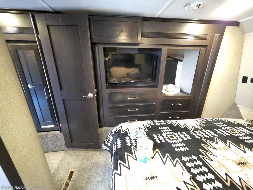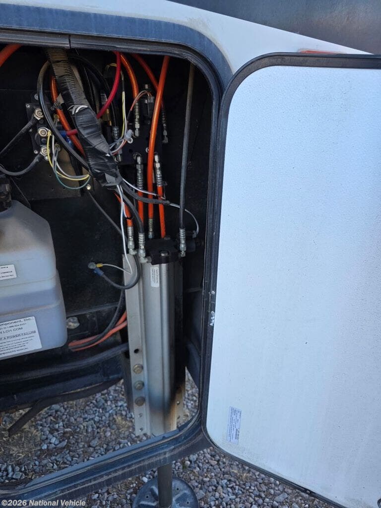 Inside the main living area, you?ll find a beautifully appointed interior with solid surface countertops, residential-style cabinetry, premium furnishings, and a large entertainment center with a flat-screen TV and fireplace. The open-concept kitchen is equipped with stainless steel appliances, a large refrigerator, 3-burner range with oven, microwave, and generous pantry storage-perfect for extended trips.