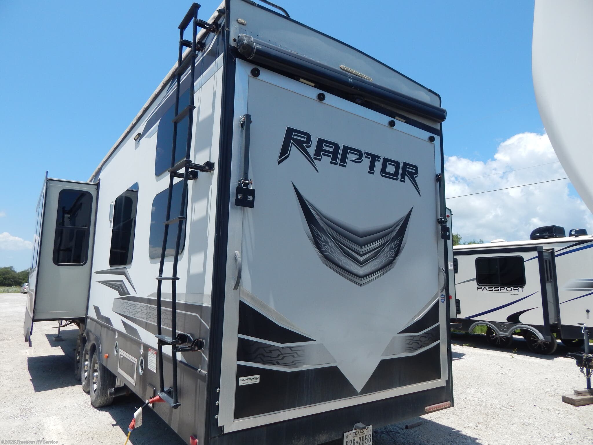 Safety is prioritized with detectors for CO, LP, and smoke, ensuring peace of mind during your travels. The Raptor also includes a backup monitor, leveling jacks, ladder, and an external compartment for extra storage. Insulation enhances comfort during all seasons, while the heavy-duty hitch ensures secure towing.