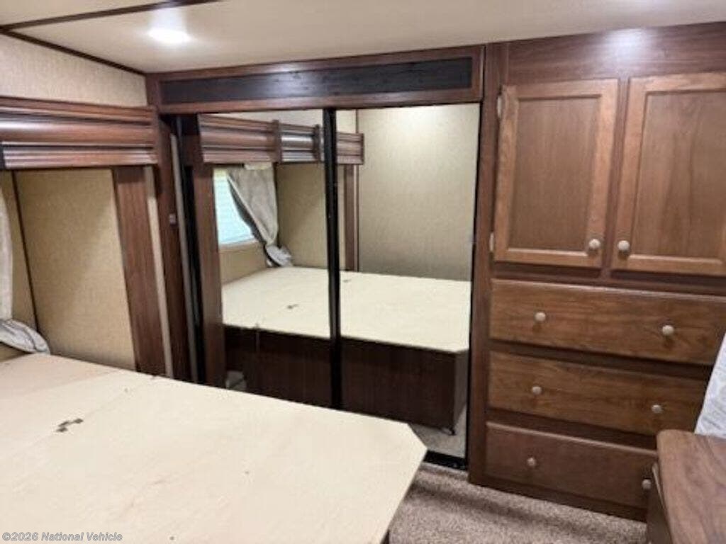Up the steps to your right through the same entry door you will find a bathroom through the first door on your left. Inside enjoy the convenience of a residential shower, toilet, and sink. There is also a linen cabinet for your towels and other bath products. At the head of the hall find a spacious master bedroom featuring a slide out queen size residential bed, a dresser opposite along the curb side wall, and a front wardrobe for your clothing.