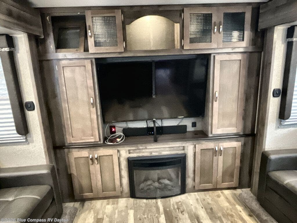 This Keystone Sprinter fifth wheel is great for entertaining family and/or friends. Model 3531FWDEN offers a rear entertainment area including a 55" HDTV, a fireplace, 2 opposing tri-fold sofa slide outs, and theater seats. There is a spacious kitchen with seating for six, a third slide out providing more interior floor space, a residential refrigerator, and plenty of at-home conveniences as well! The fourth slide out is located in the bedroom where you also have access to a closet that has been prepped for a washer and dryer, plus more!