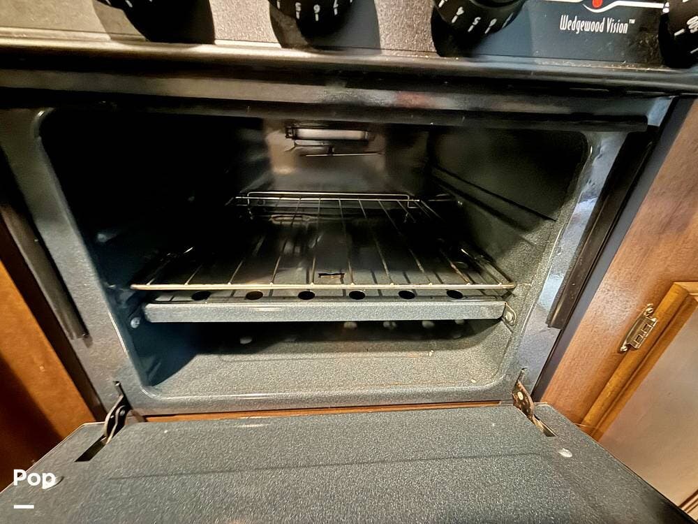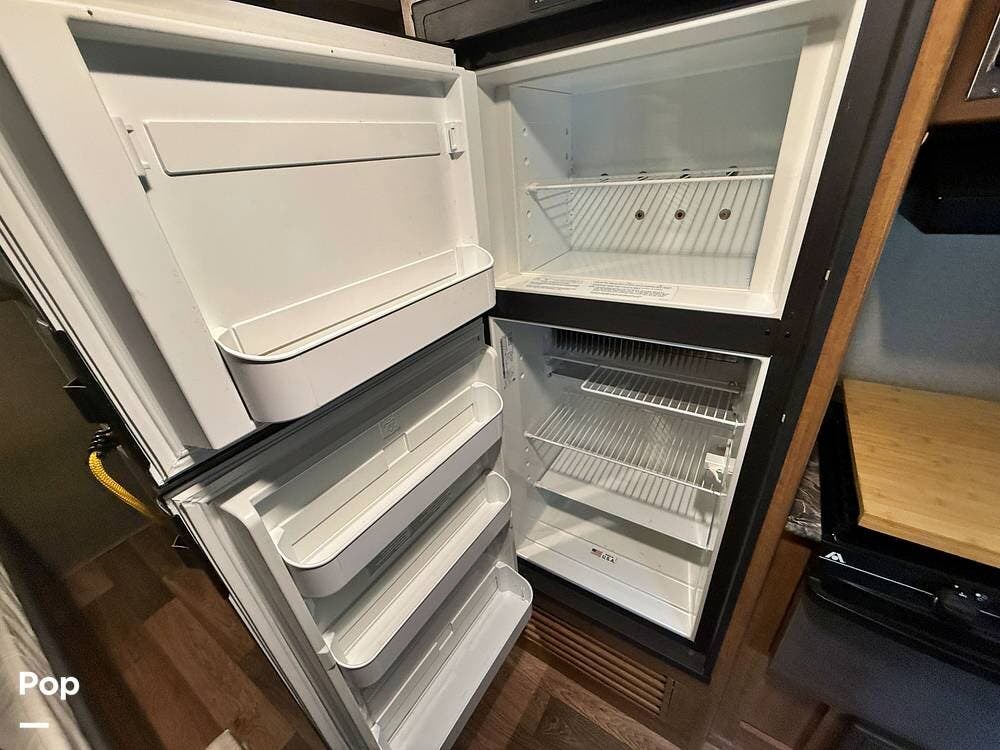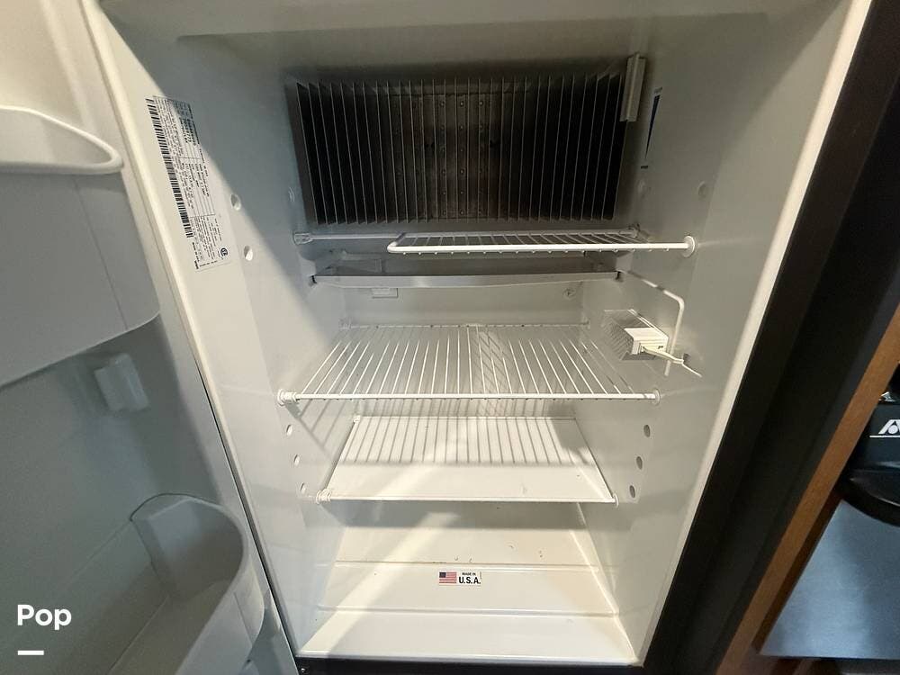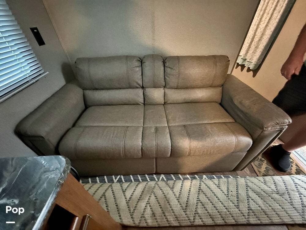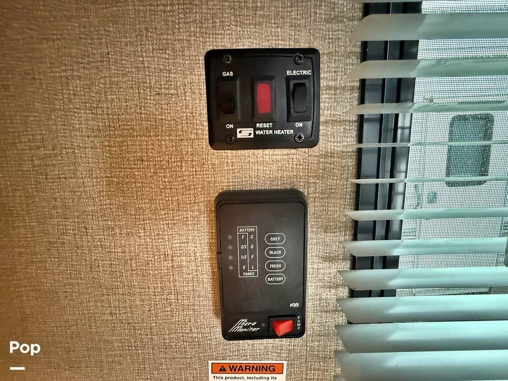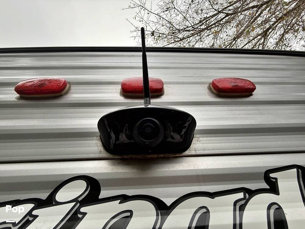 It features a private master bedroom in the front with a queen-sized bed, providing a separate space for parents to relax. The kitchen is fully equipped with a three-burner stove, an oven, and a mid-sized refrigerator for all your meal prep needs. Don't forget, the seller added a rear back up camera.