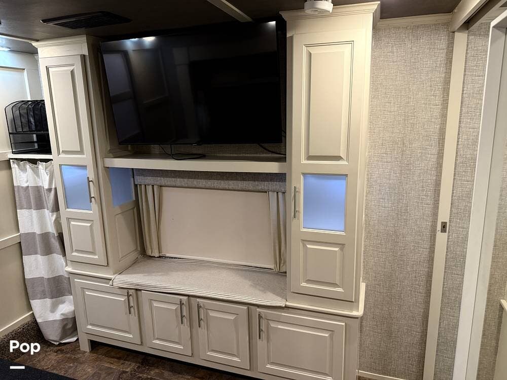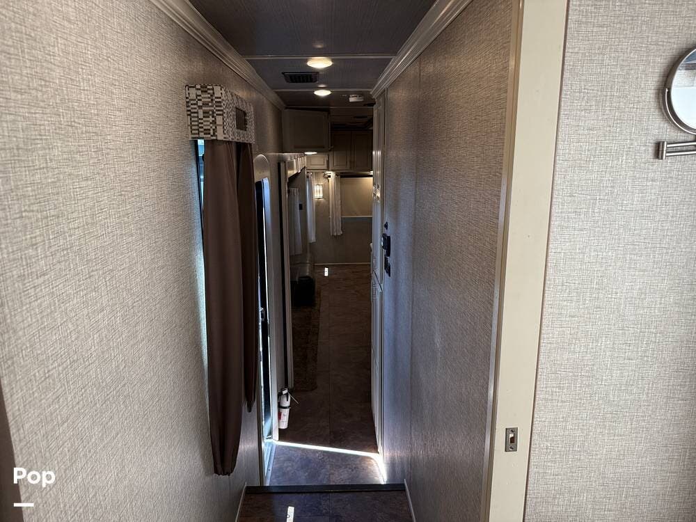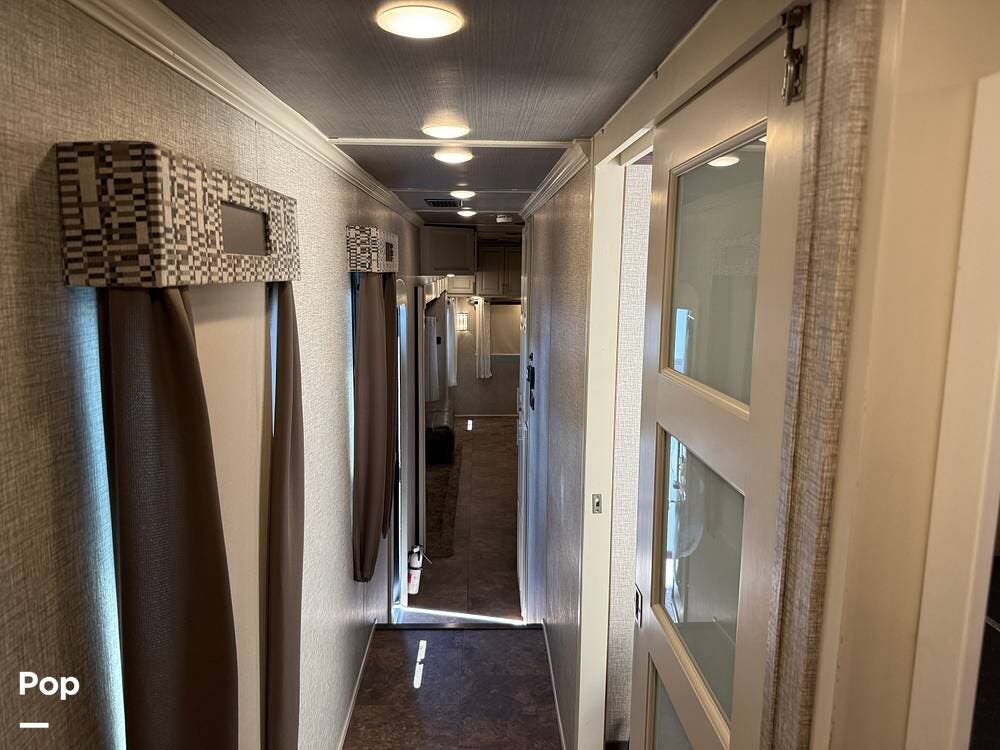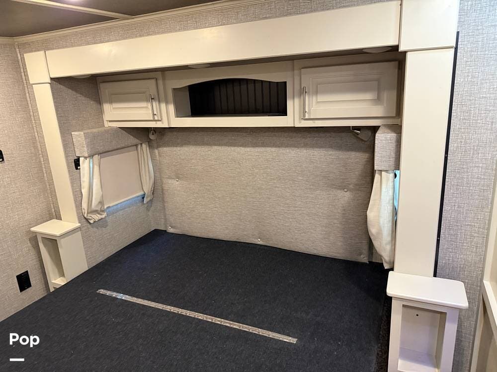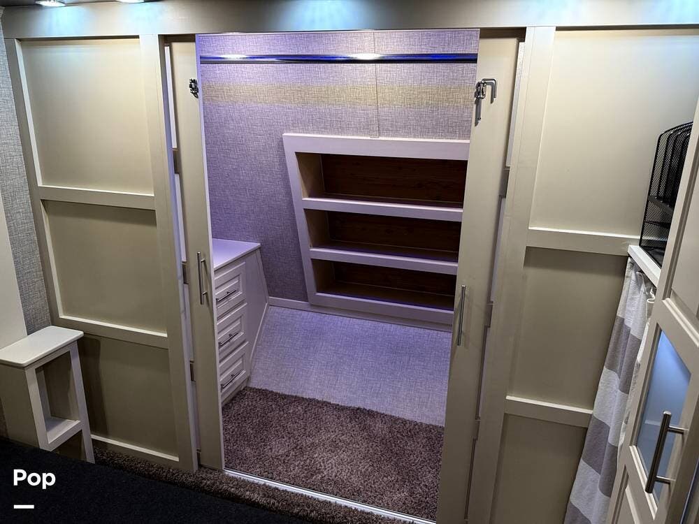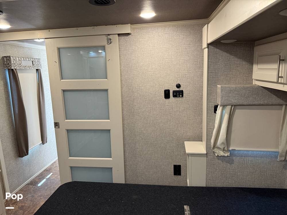 The seller had ordered the unit as a custom build, including the Amish-made millwork throughout. The seller opted to customize with an interior with curtains and their own customized furnishings - not included.
