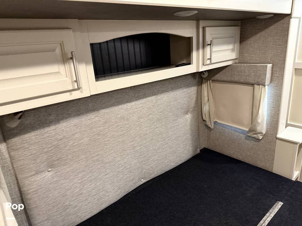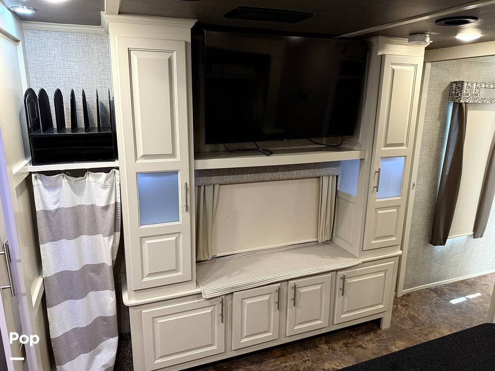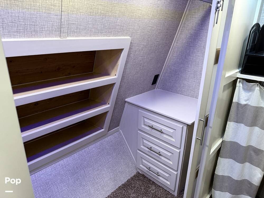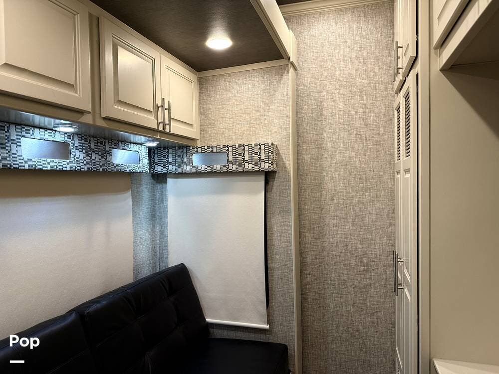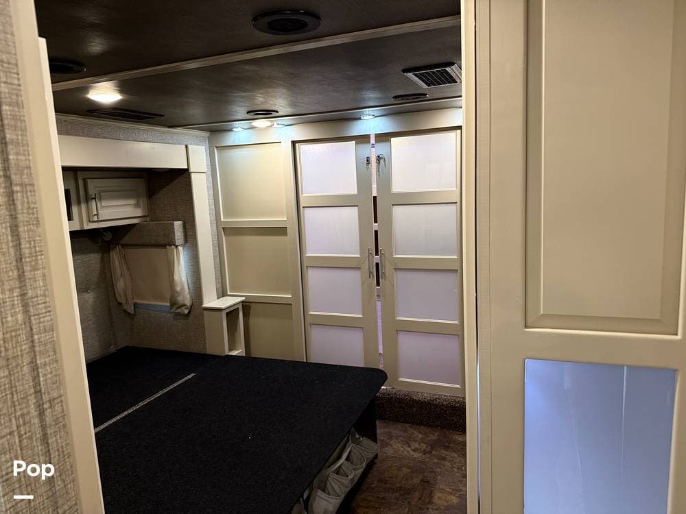 The seller had ordered the unit as a custom build, including the Amish-made millwork throughout. The seller opted to customize with an interior with curtains and their own customized furnishings - not included.