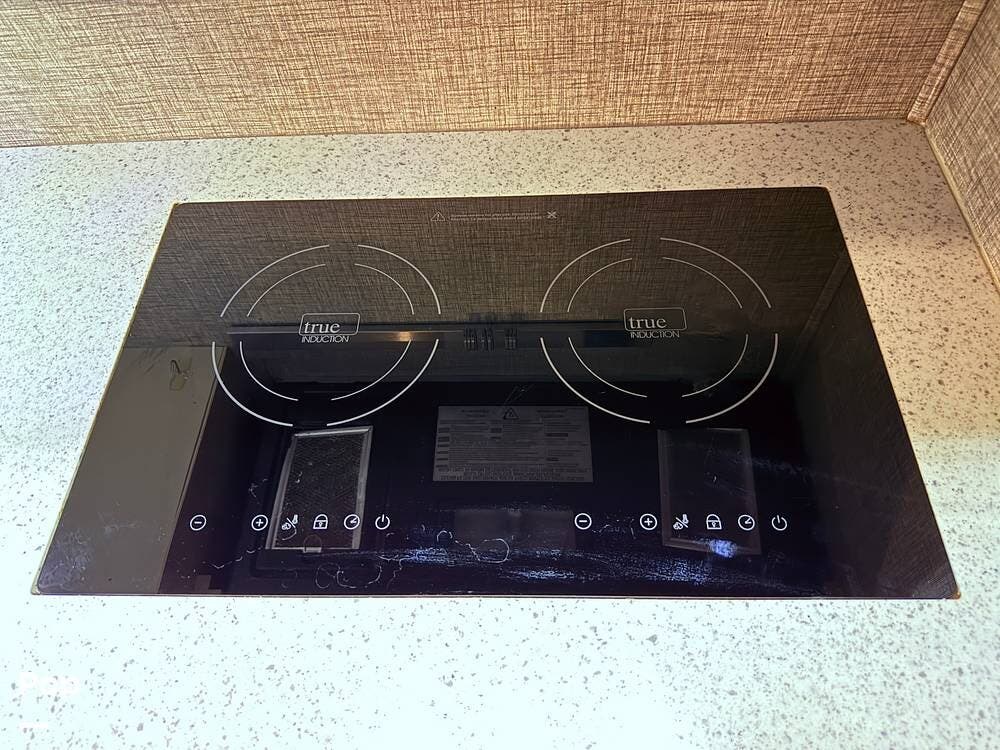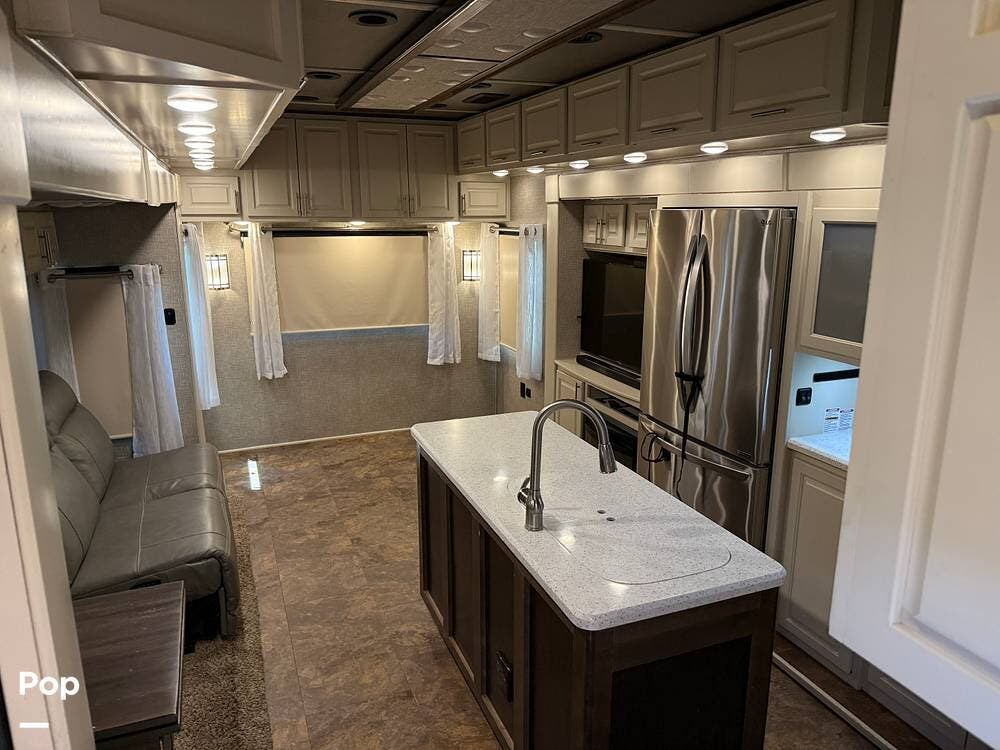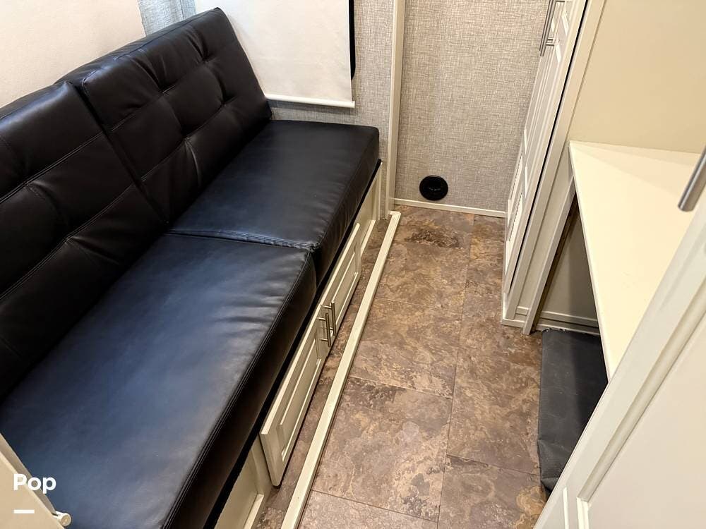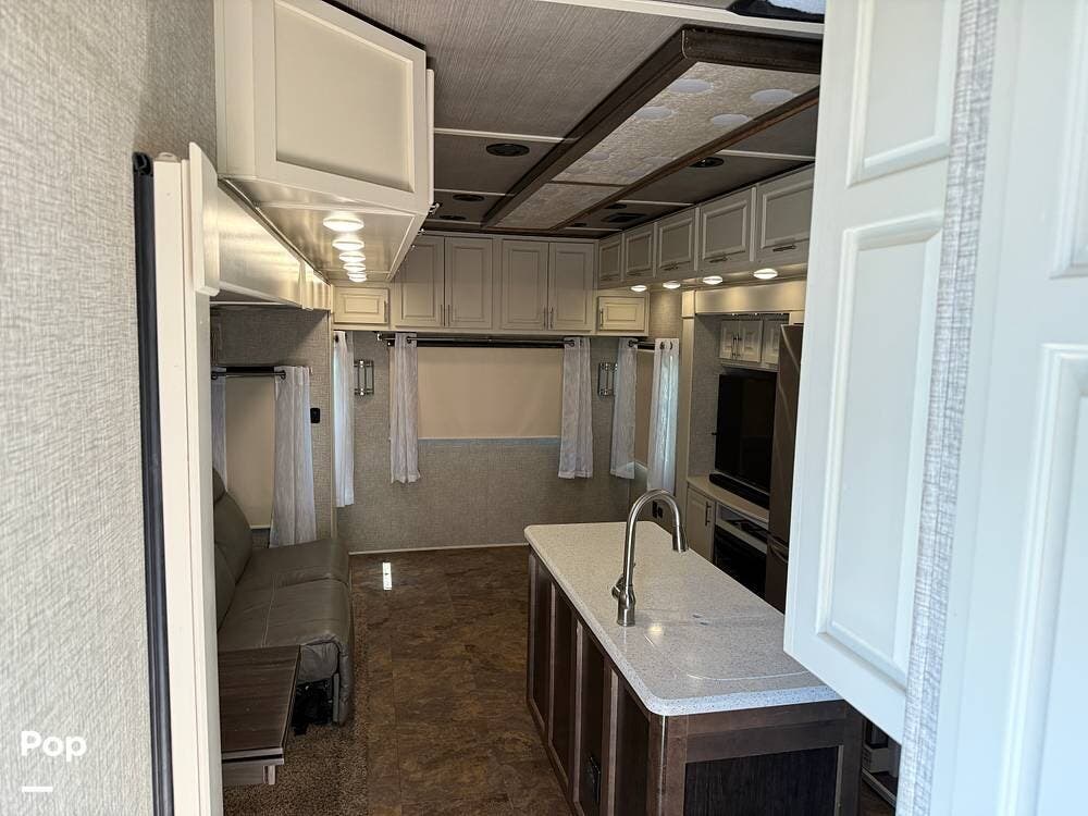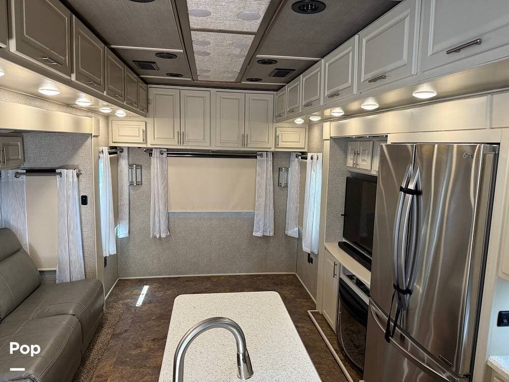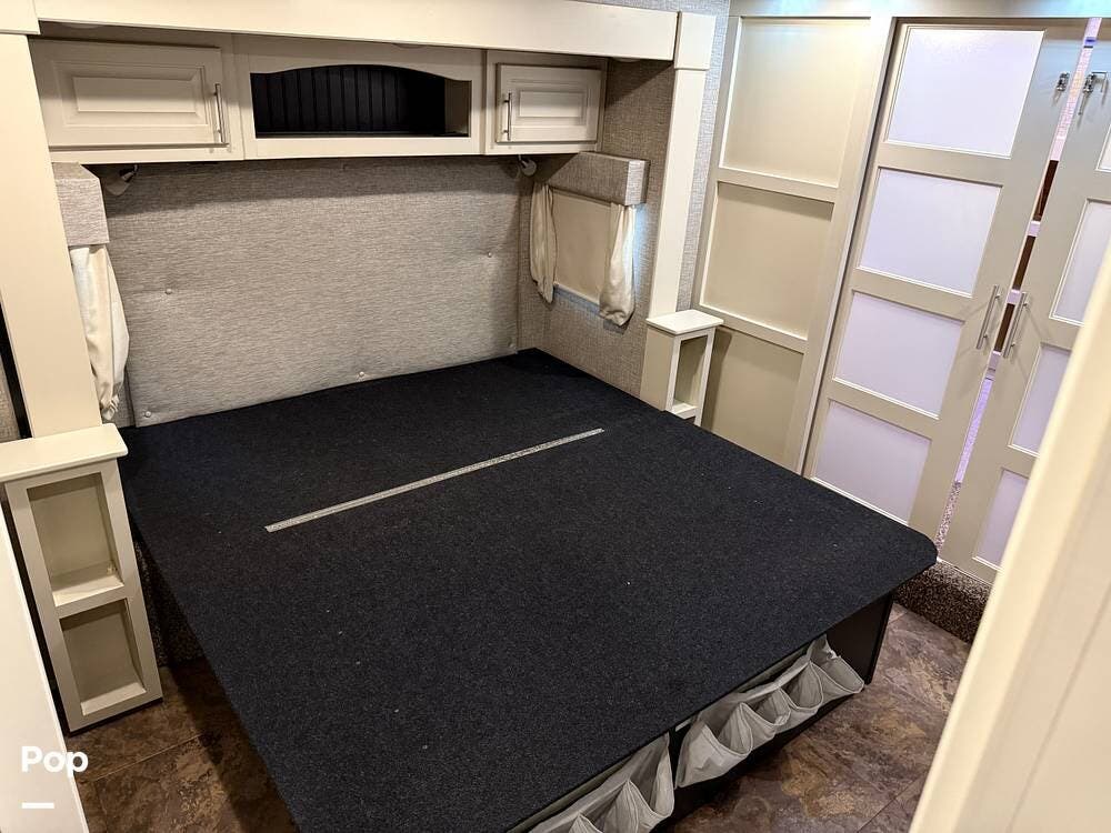 The seller had ordered the unit as a custom build, including the Amish-made millwork throughout. The seller opted to customize with an interior with curtains and their own customized furnishings - not included.