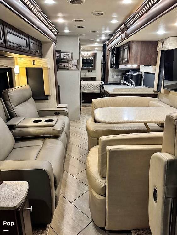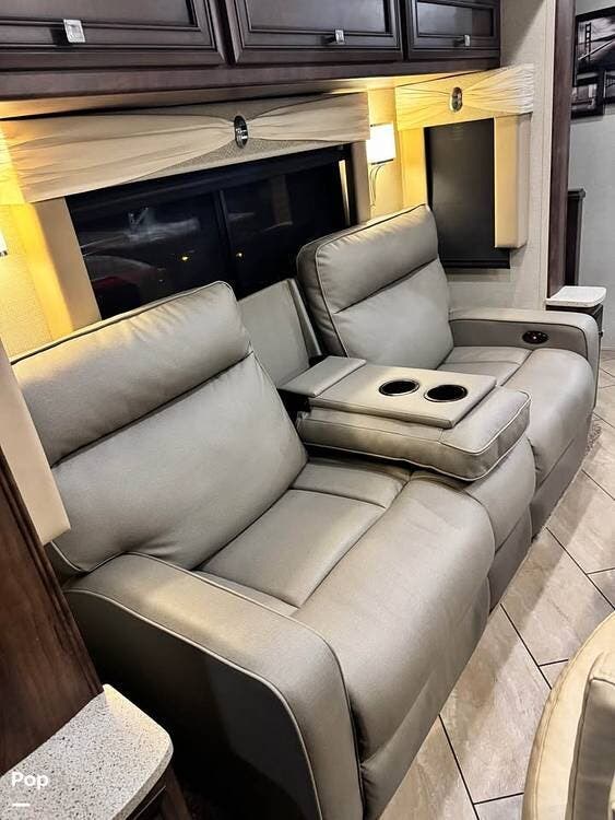 Boasting three power slide-outs, the interior opens into an expansive living area designed for both comfort and style. The "Calypso" interior decor is perfectly complemented by "Astoria" Glazed Maple cabinetry. High-end finishes abound, including solid-surface countertops throughout the galley, premium Flexsteel furniture, and a large "Comfort Lounge" sofa that provides additional sleeping capacity when needed. The kitchen is fully equipped with a 3-burner recessed stove, a convection microwave, and a spacious Norcold refrigerator.