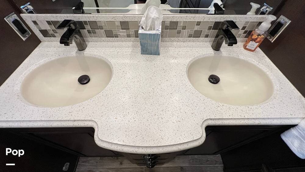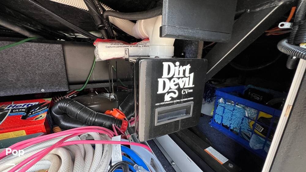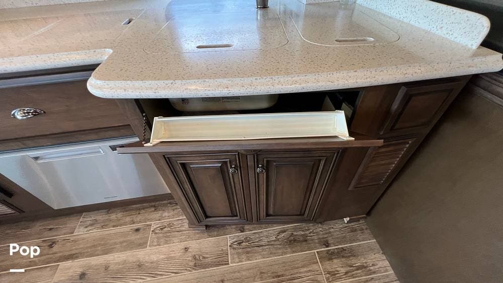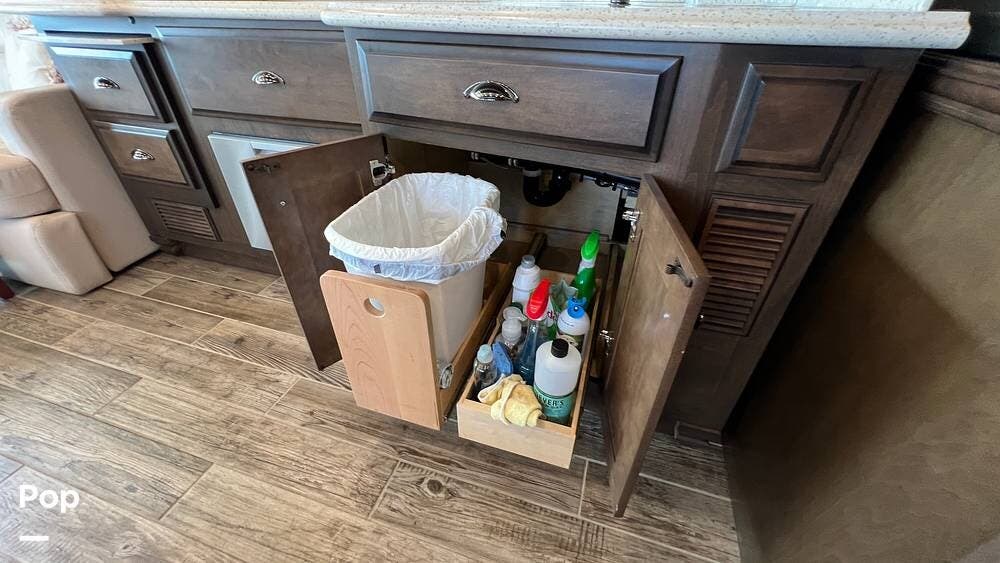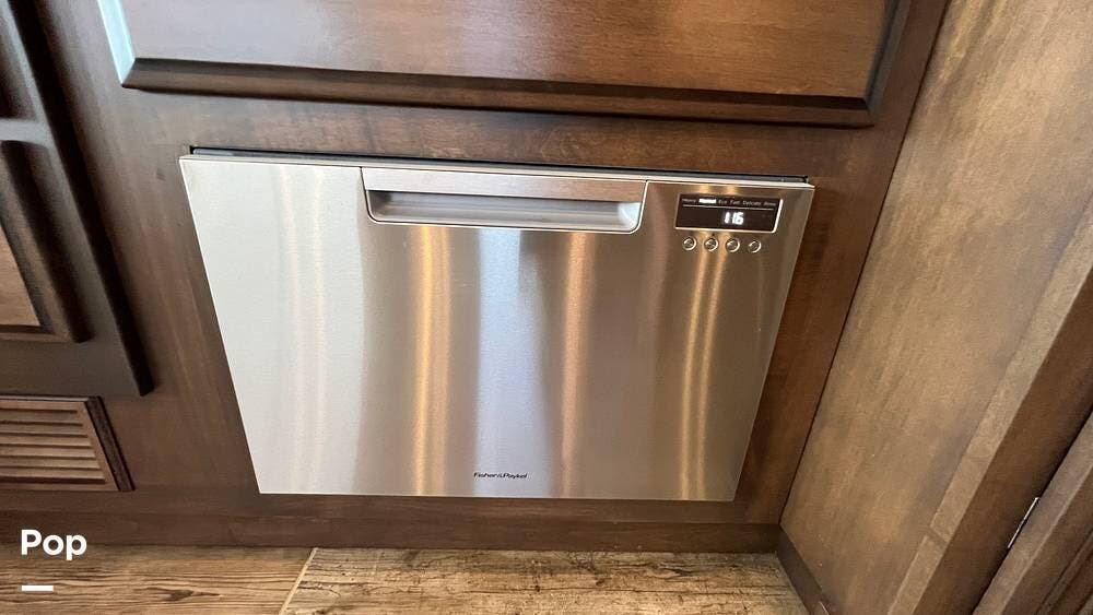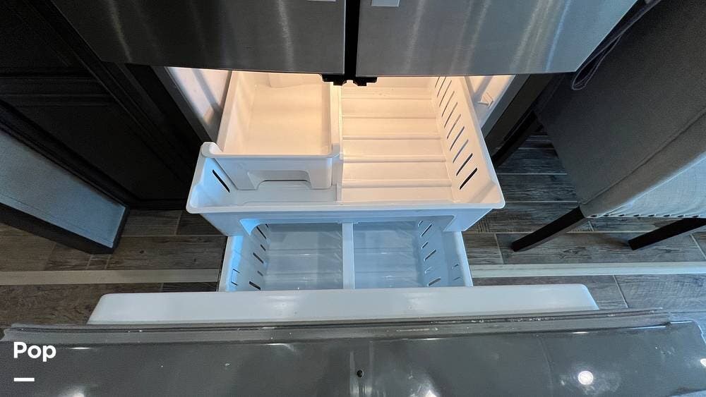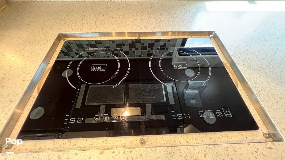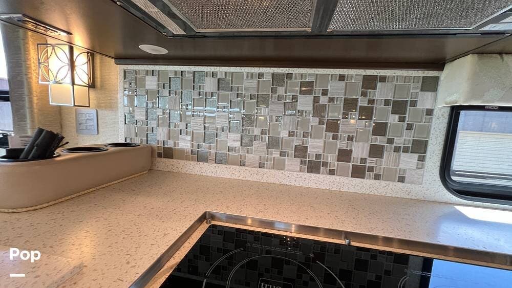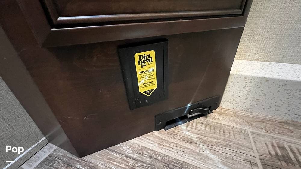 The fully equipped kitchen allows you to cook your favorite meals with ease. It boasts a residential-sized refrigerator, a microwave/convection oven, a two-burner induction cooktop, a dishwasher, and solid-surface cooktop covers with cutting board backsides. The ample counter space and stylish backsplash make meal prep a pleasure. The kitchen also features a large lighted slide-out pantry and Red Devil central vacuum system.