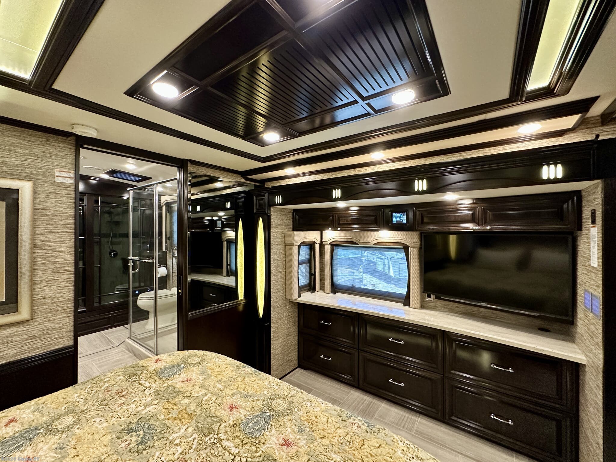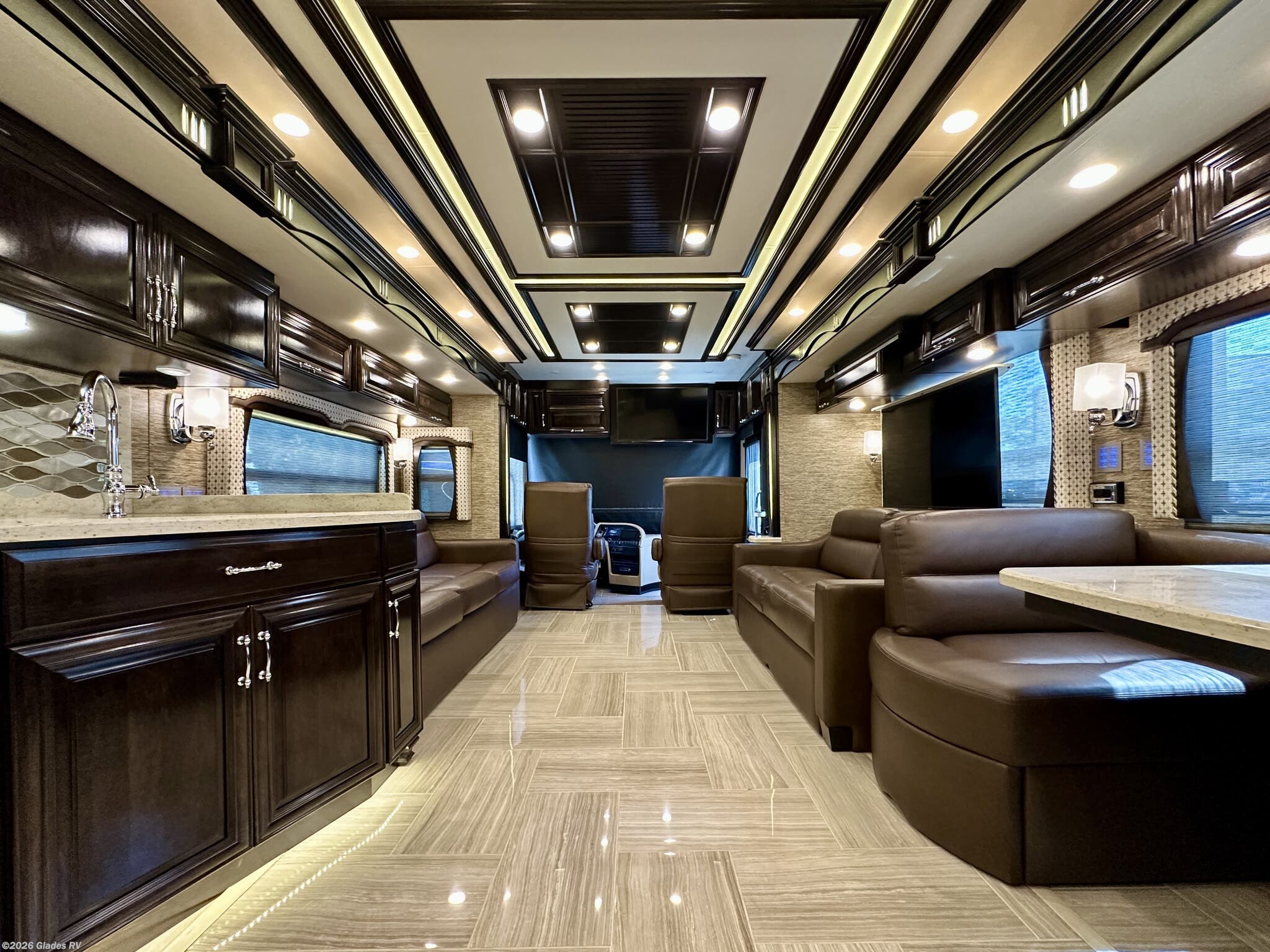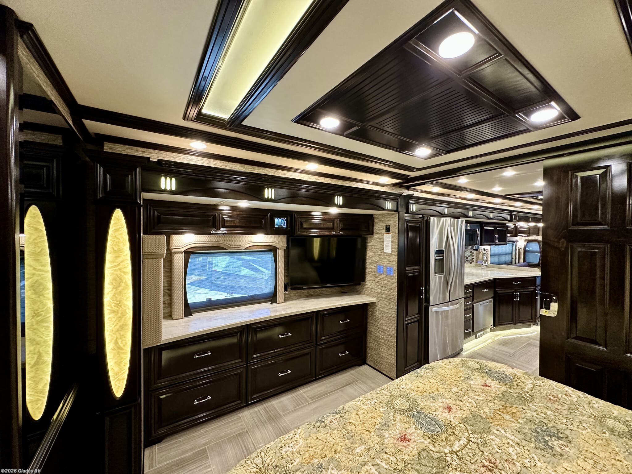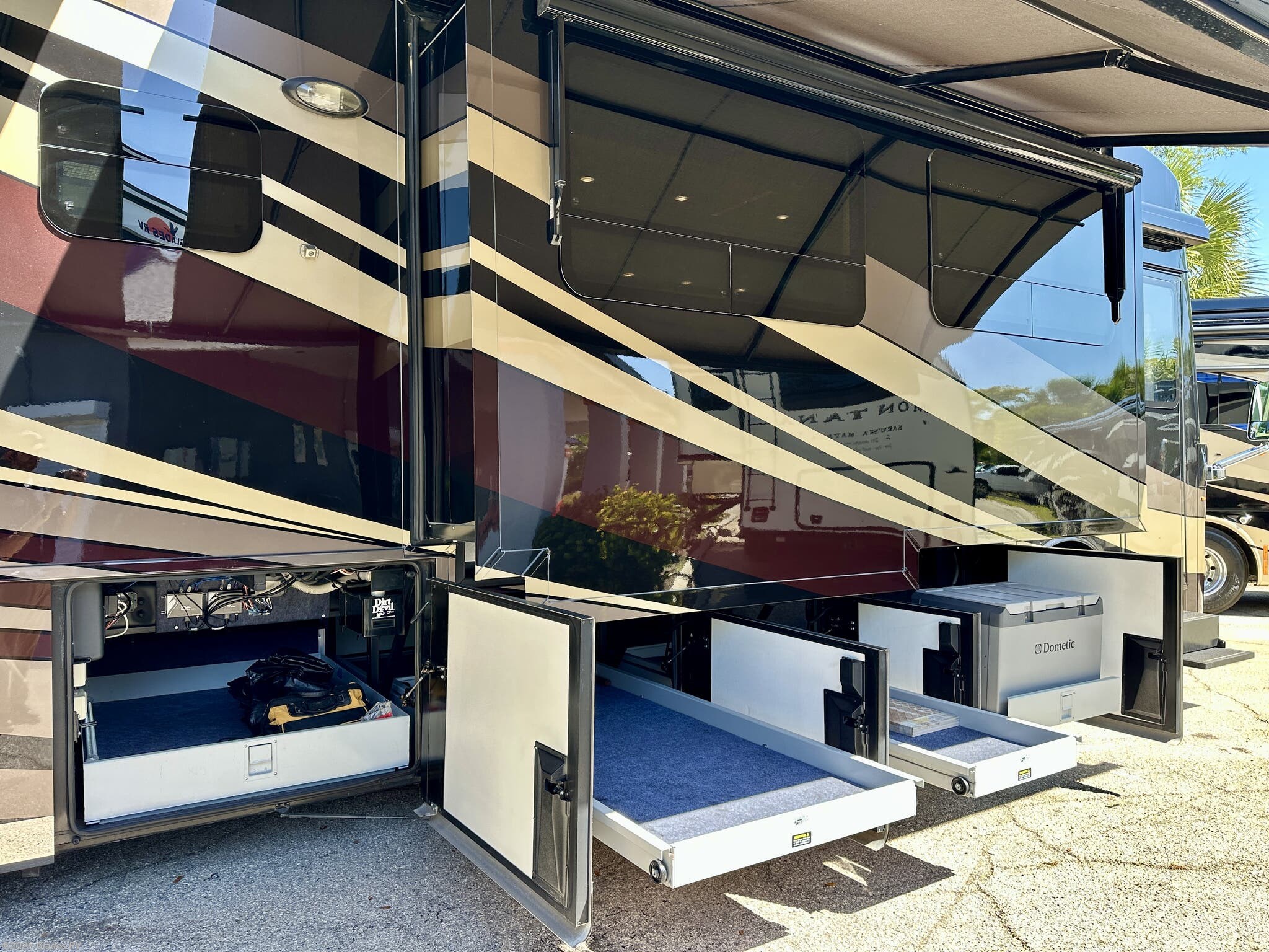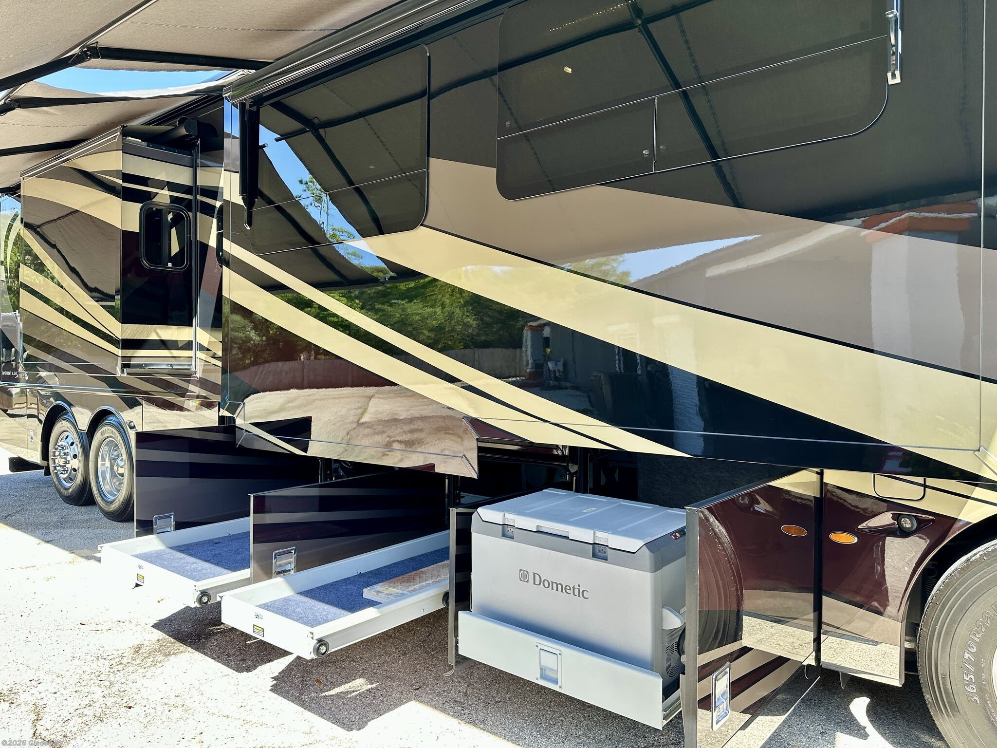 AUTO HYDRAULIC & AIR LEVELING, POWER INTEGRATED AWNINGS, SLIDE TRAYS IN BASEMENT, TELEVATOR TV, HYDRONIC HEATING, POWER DAY/NIGHT SHADES, STACKED WASHER & DRYER, HEATED FLOORS, KING BED, RESIDENTIAL REFRIGERATOR, OUTSIDE FREEZER, DISHWASHER, POWER WINDOW AWNINGS AND MUCH MORE...