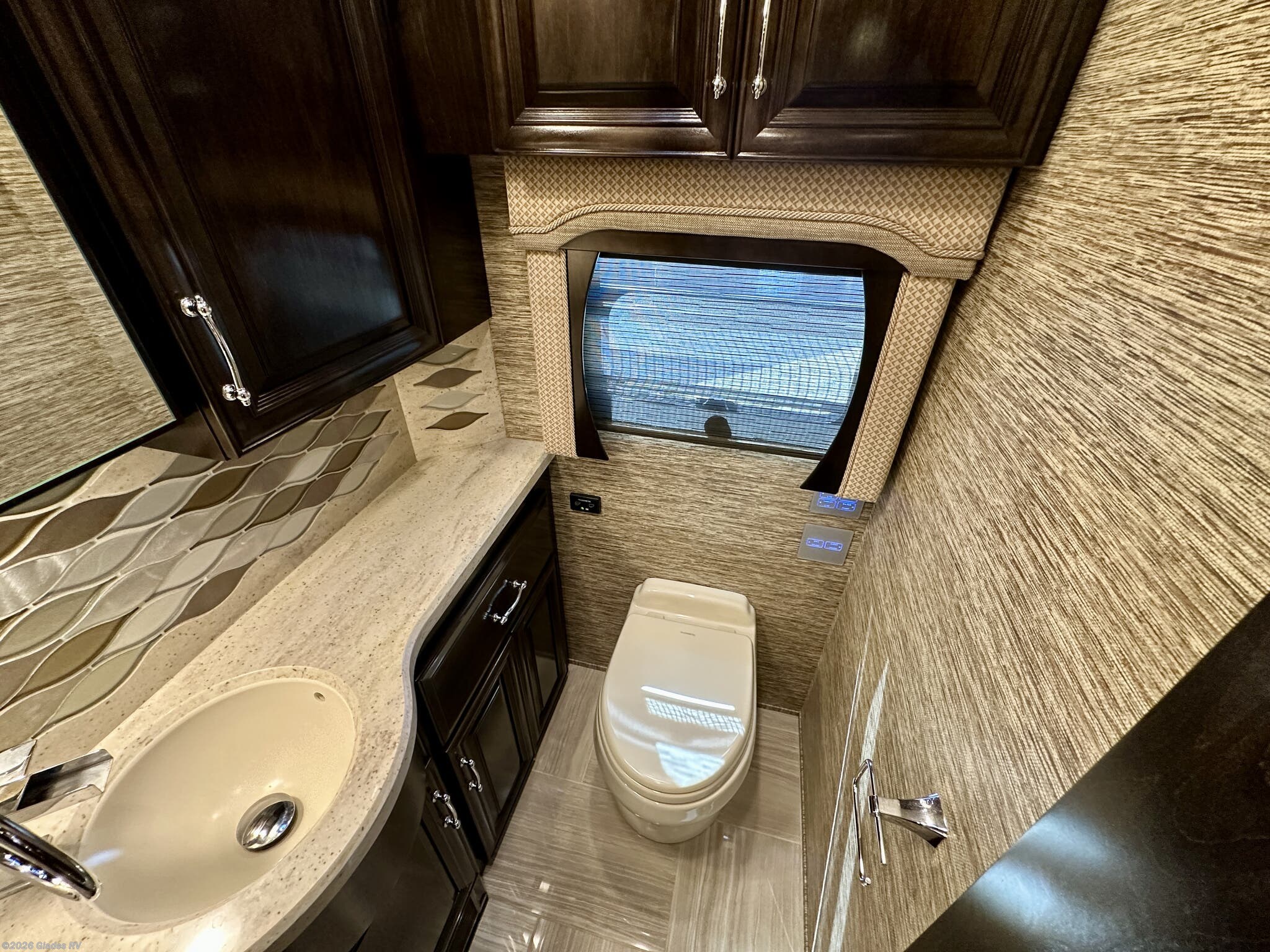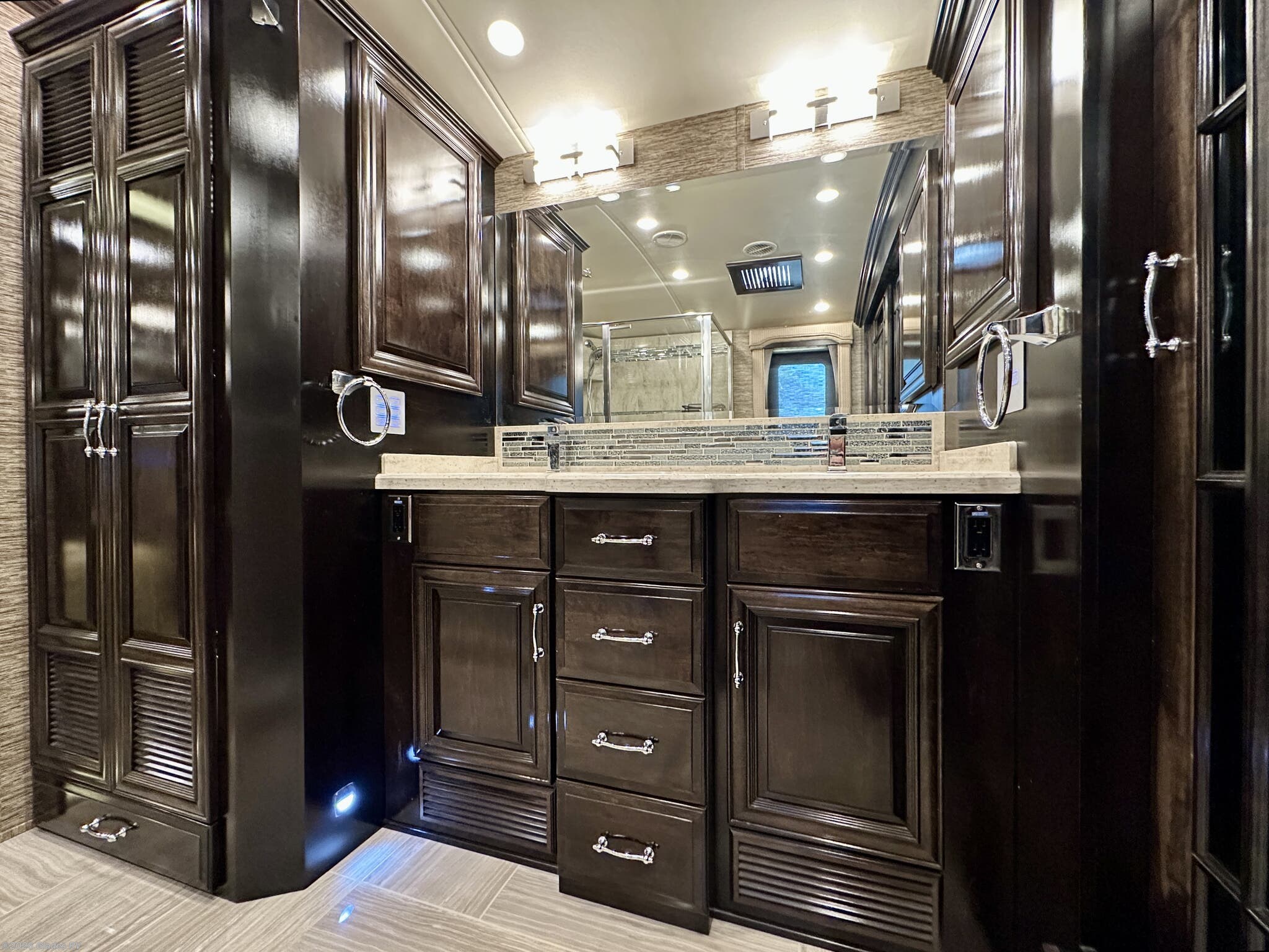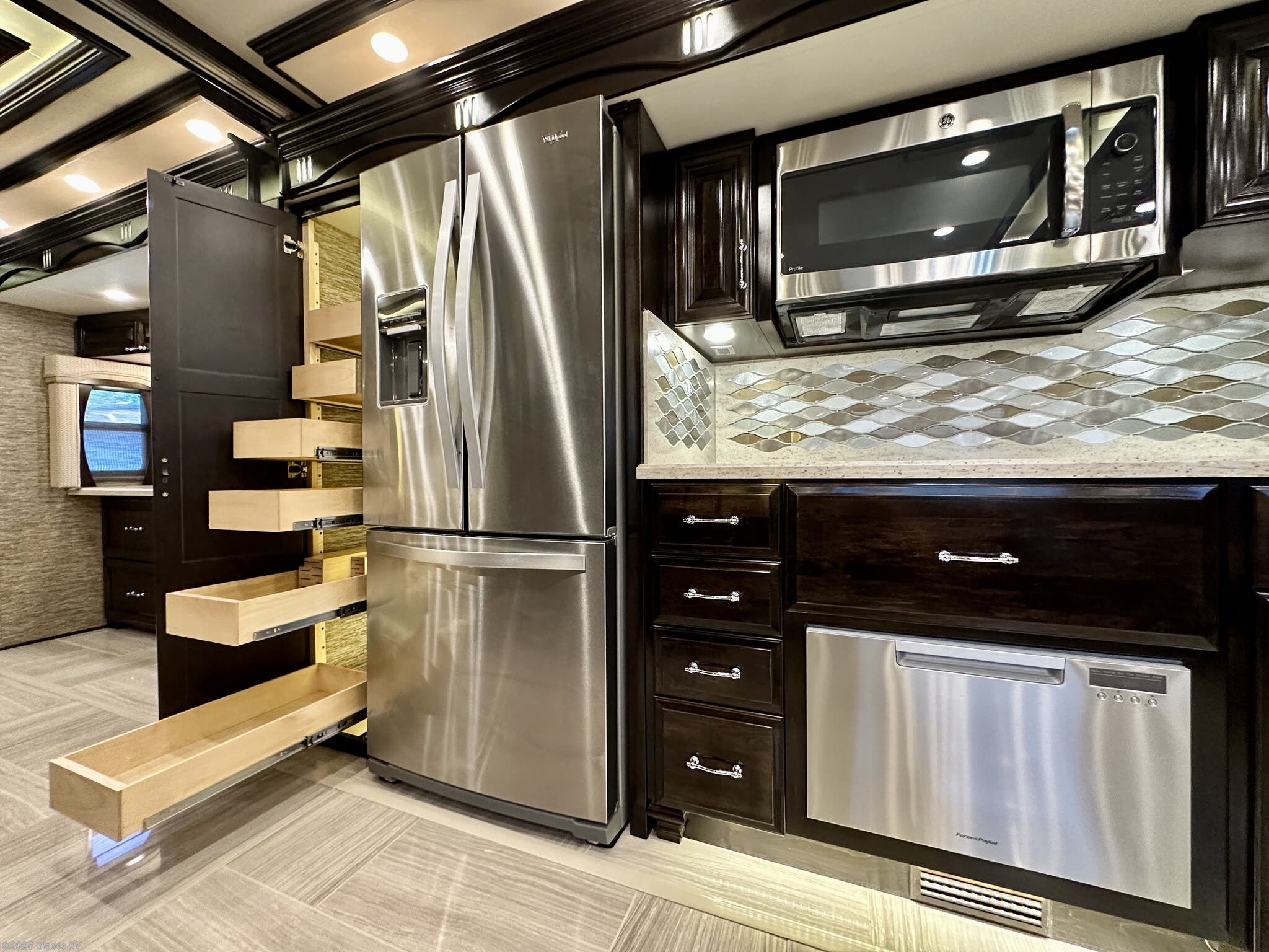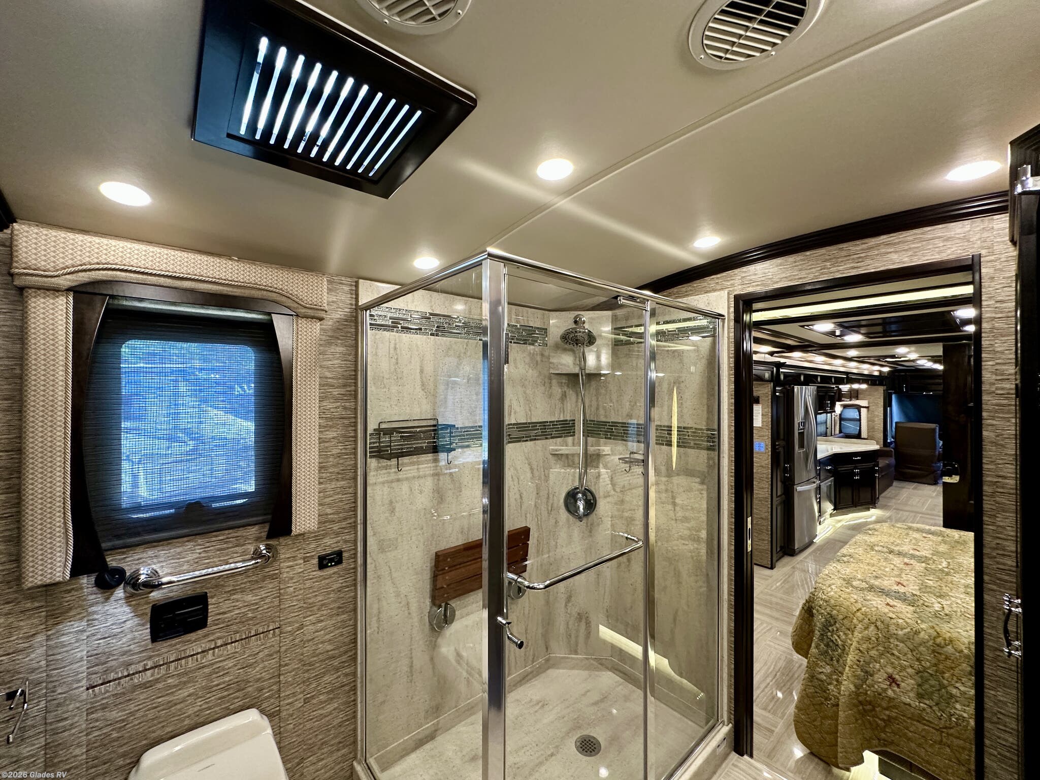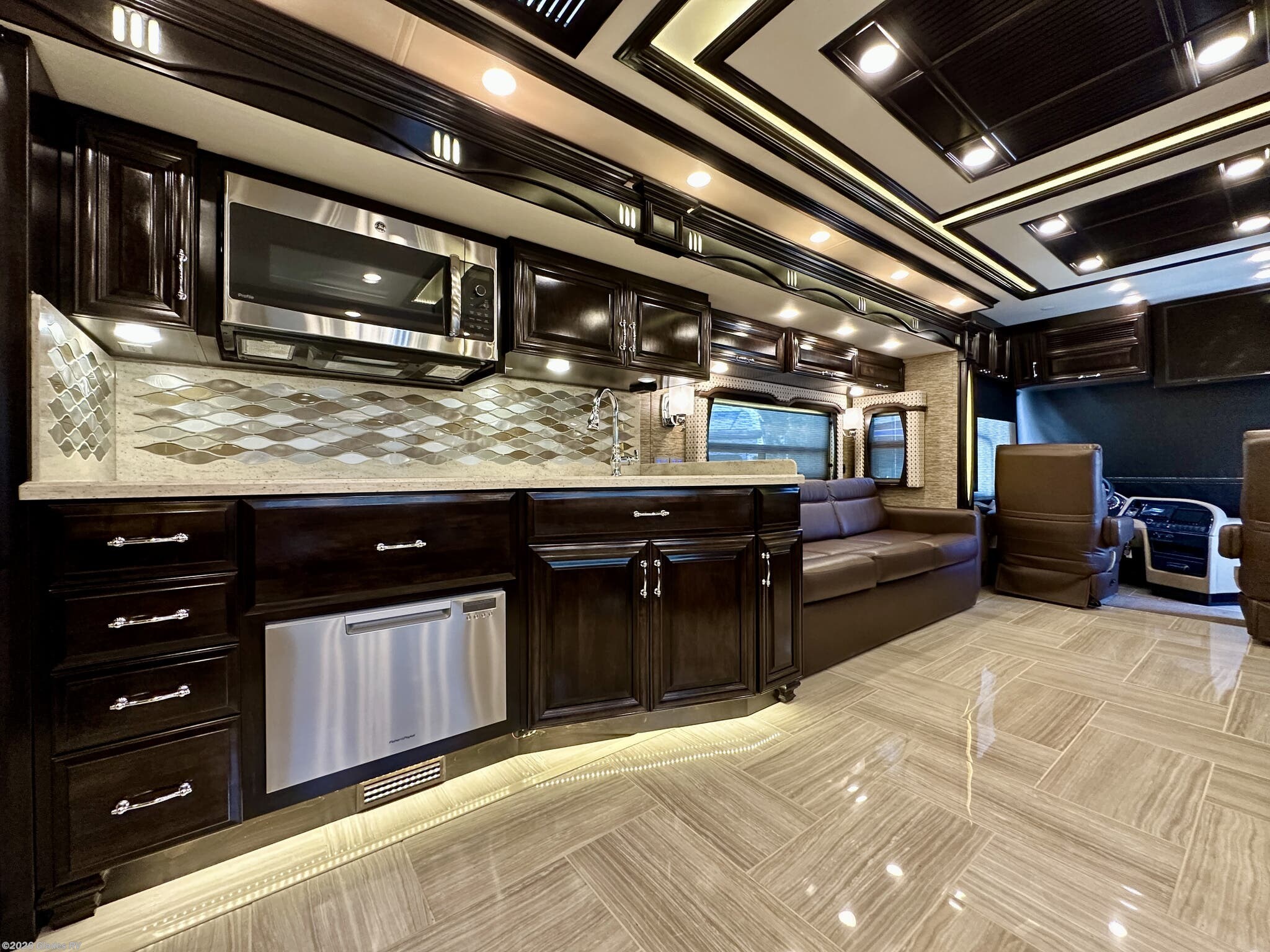 AUTO HYDRAULIC & AIR LEVELING, POWER INTEGRATED AWNINGS, SLIDE TRAYS IN BASEMENT, TELEVATOR TV, HYDRONIC HEATING, POWER DAY/NIGHT SHADES, STACKED WASHER & DRYER, HEATED FLOORS, KING BED, RESIDENTIAL REFRIGERATOR, OUTSIDE FREEZER, DISHWASHER, POWER WINDOW AWNINGS AND MUCH MORE...