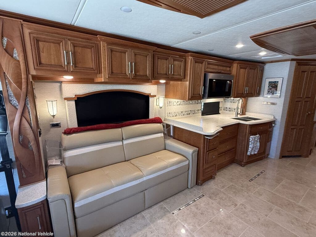 Step inside and you?re greeted by Newmar?s signature attention to detail: polished tile floors, hardwood cabinetry, and premium finishes throughout. The spacious 40-foot floorplan features three slide-outs, full wall slide out on the driver side and 2 on the passenger side creating an open-concept living area that feels more like a high-end condo than a motorhome. Relax in plush theater seating or the comfortable sofa while enjoying one of three TVs, including a statement LED TV on a power lift for a clean, modern look and optimal viewing.
