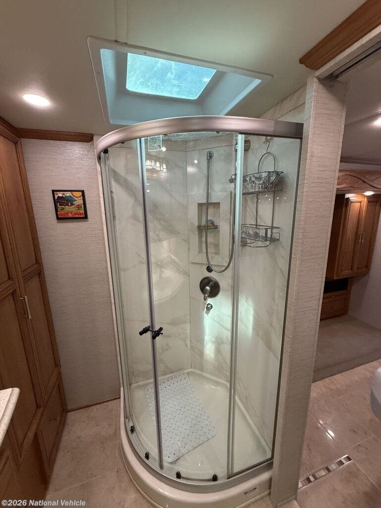 The mid-coach half bath adds convenience for guests, while the rear master suite provides a private retreat with a queen-size Tempurpedic bed, abundant wardrobe storage, and a stacked washer/dryer. The full rear bath features a large glass-enclosed shower, dual sinks, and elegant fixtures?bringing true residential luxury wherever you travel.