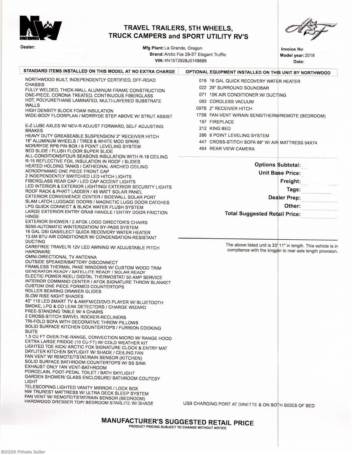 Request More Info on this 2018 Northwood Arctic Fox Grande Ronde 29-5T Offered for sale by For Sale By Owner