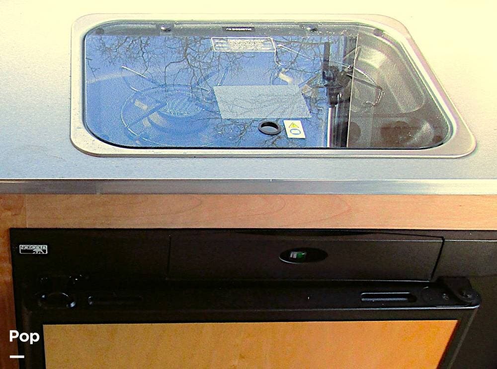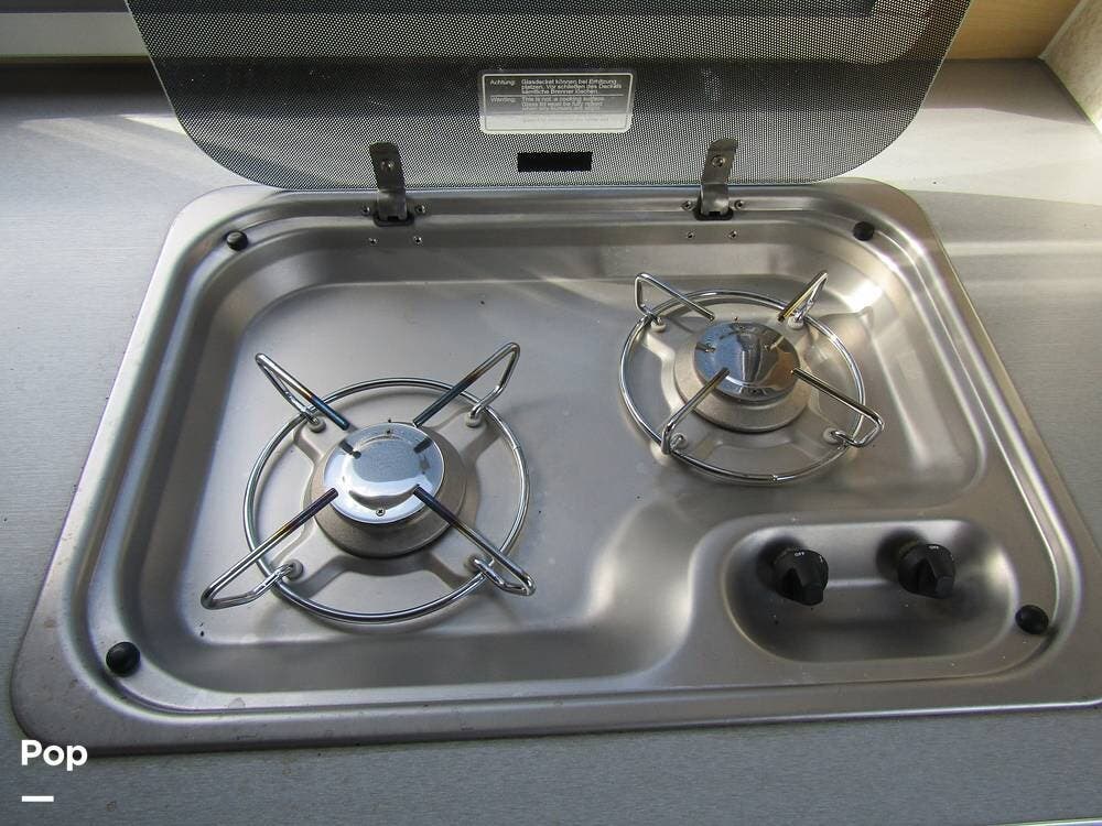 The sofa has a stowable dinette table and converts to a 70" x 73" king-size bed; a full-size wet bathroom; and a kitchen with a sink, two-burner stove top, and mini-fridge.