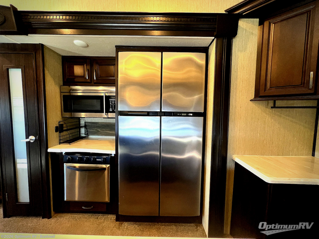 If you like to cook while away from home with the choice of being outside or inside, take a look at this Columbus 366RL fifth wheel. When it is time for breakfast, the kitchen island offers plenty of countertop and floor space thanks to the dual slide outs in this area. You might even like the cook the bacon on the outside kitchen. All the furniture including the 80" tri-fold sofa provides a place to relax and enjoy your drink while looking outside at your beautiful view or watching the 50" LED TV. After shopping in the local town square or riding your bikes on the trails, the pillowtop mattress in the master bedroom will be waiting for you. Take a look today!