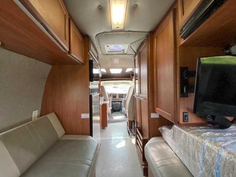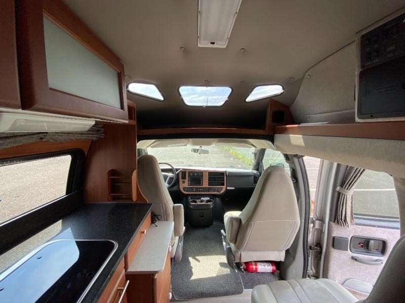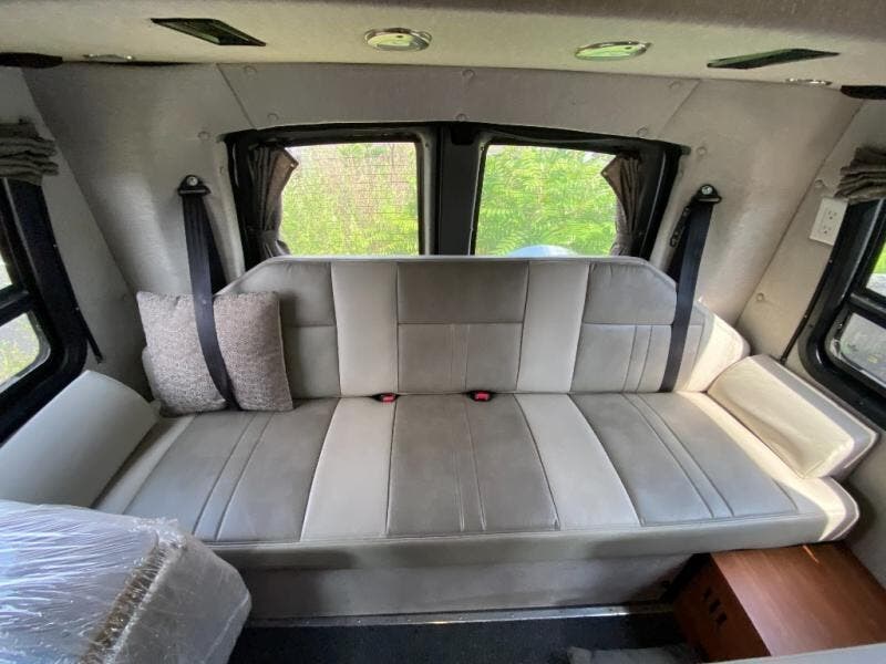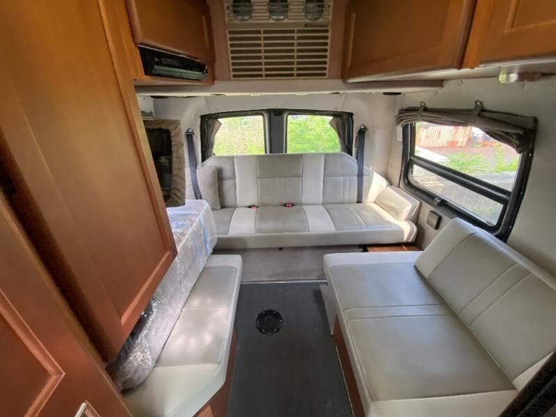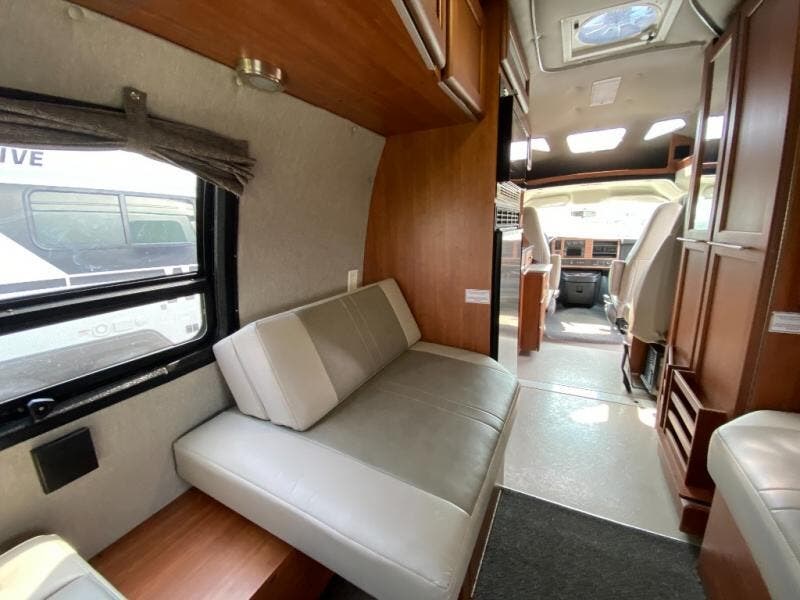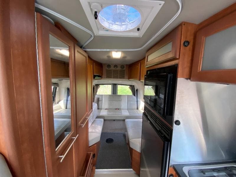 The Roadtrek 210-Popular Class B motor home features a dinette or optional power sofa and two bench seat dinette, both converting to two twin size beds or a king size bed. The passenger chairs can be converted to an additional bed. Towing up to 7,600 pounds.
