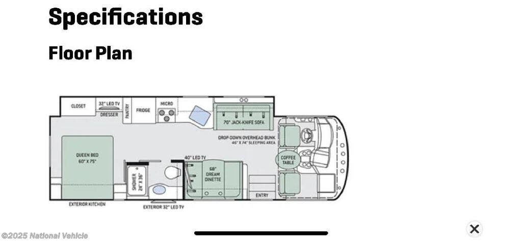 Class A motorhome built on a Ford F-53 chassis with a 6.8L Triton V10 engine. Its key features include a full-wall slide-out, a rear queen bed, a drop-down overhead bunk, and sleeping for up to eight people. The exterior boasts an electric patio awning, an exterior 32? LED TV, and an exterior kitchen with a refrigerator and sink.