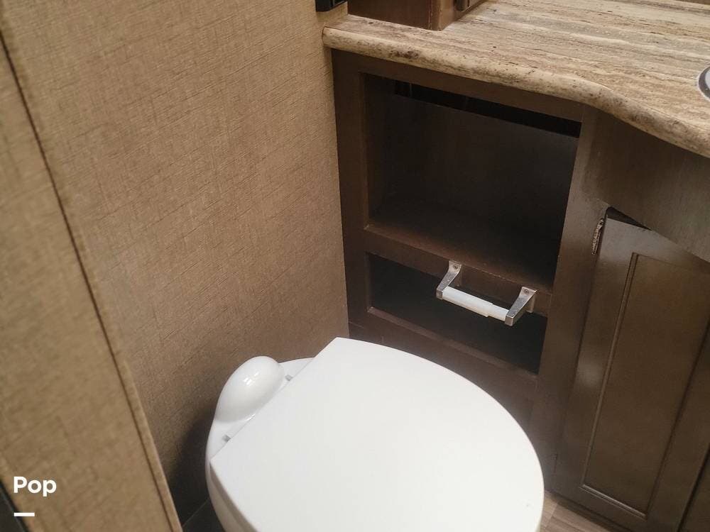 At the rear of the coach, the private bedroom features a Denver Mattress king-size bed, a dresser, generous closet space, and a 32" LED TV. The bathroom is outfitted with a 24" x 36" shower, an upgraded porcelain foot-flush toilet, and a vanity with storage, offering both comfort and convenience.
