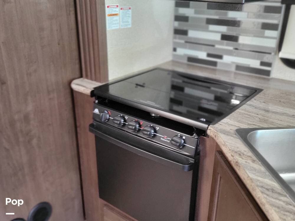 Inside, the spacious living area includes a jack-knife sofa, a Dream Dinette, and a power drop-down overhead bunk, providing flexible sleeping arrangements for up to eight. A 40" LED TV completes the space, making it ideal for relaxing after a day of exploring. The kitchen is fully equipped with a three-burner cooktop, oven, microwave, refrigerator, pantry, and a stainless-steel sink with a pull-down sprayer -- everything you need to prepare meals on the go.