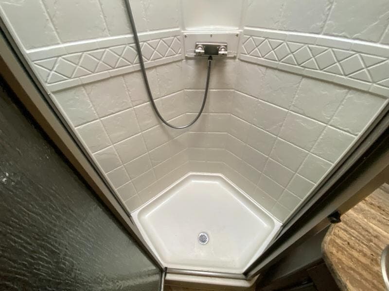 Heading towards the rear of the coach there is a full bath with angled shower, toilet and sink. The bath features dual entry doors which allows easy access from the living area and from the rear bedroom too.