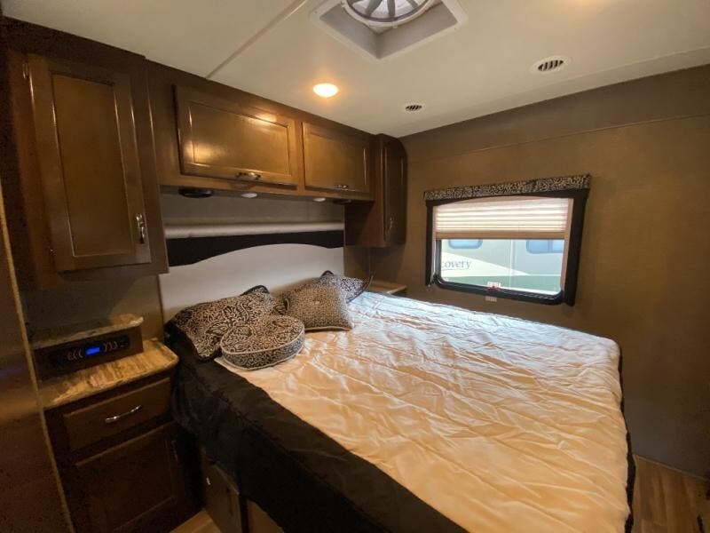 The rear bedroom features a queen bed with nightstands and overhead cabinets. There is also a closet and dresser along the full wall slide. Above the dresser there is a 32" LED TV for your enjoyment.