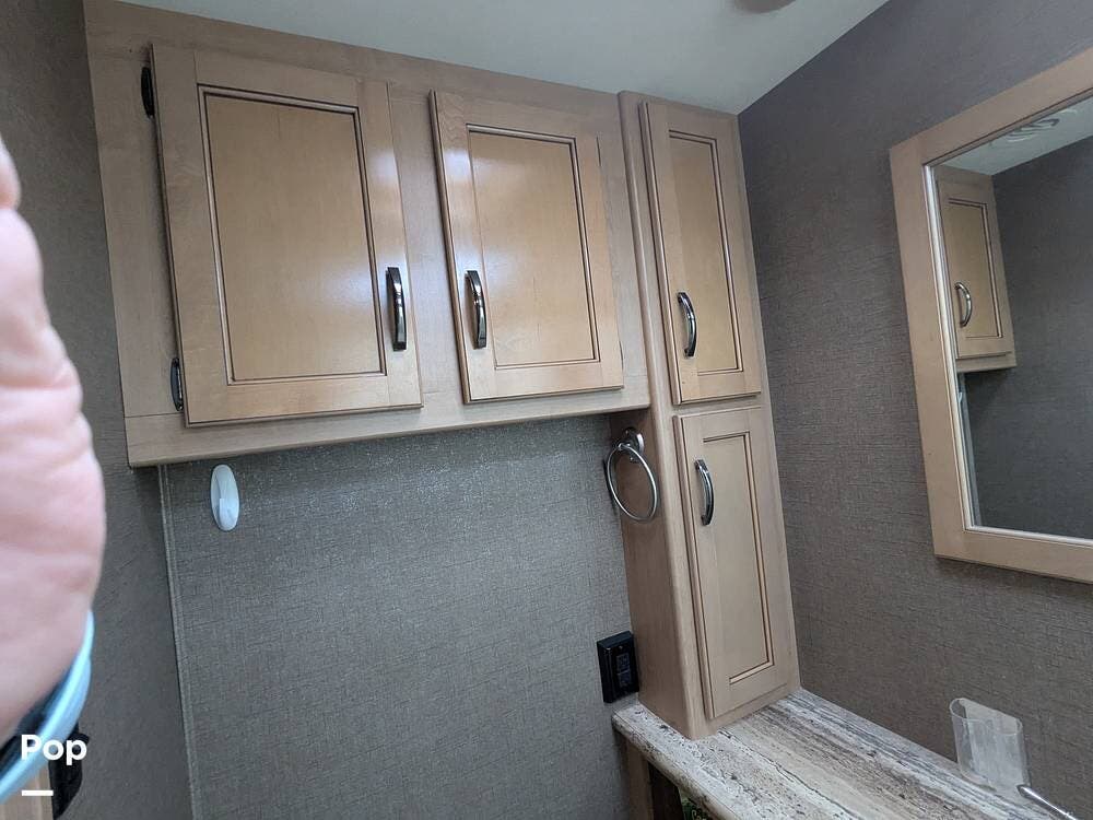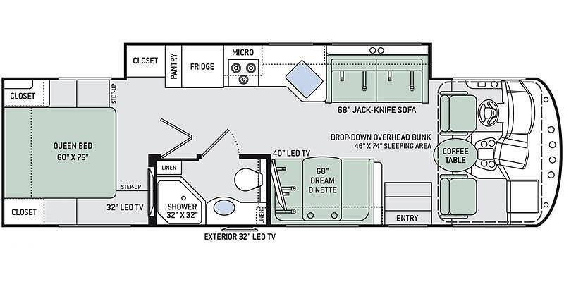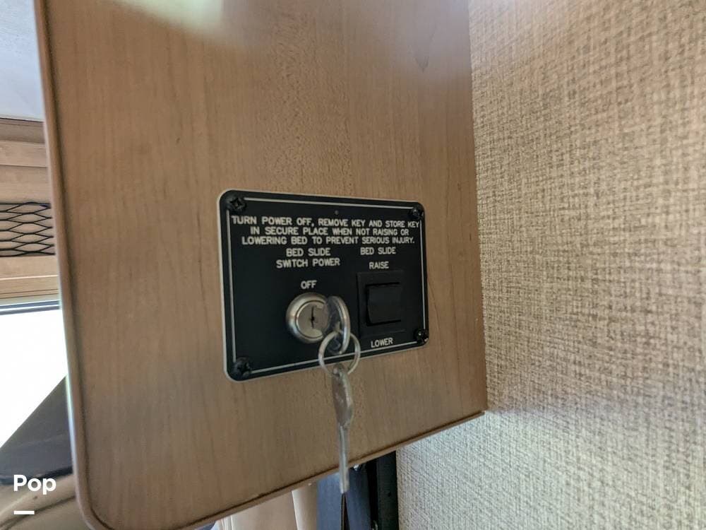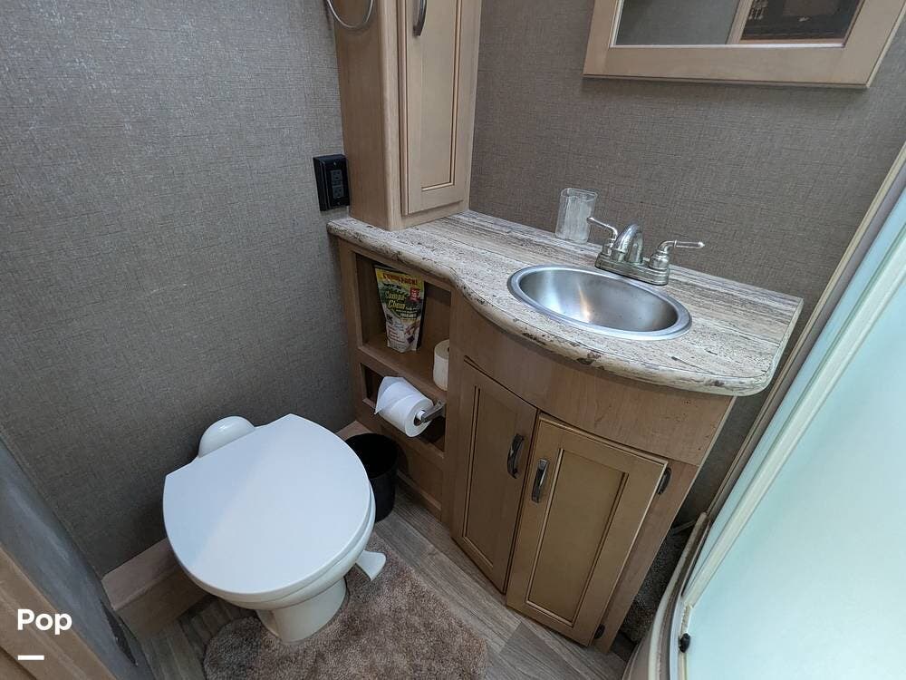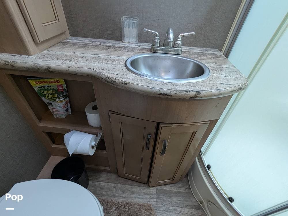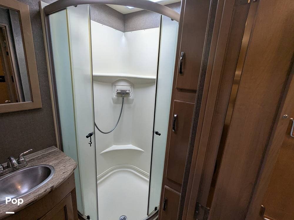 Additionally, there is an electric drop-down overhead bunk, a coffee table situated beneath the bunk between the two captain's seats, and a very large bathroom that includes a spacious corner shower, a vanity with a sink, linen storage, and overhead cabinets.