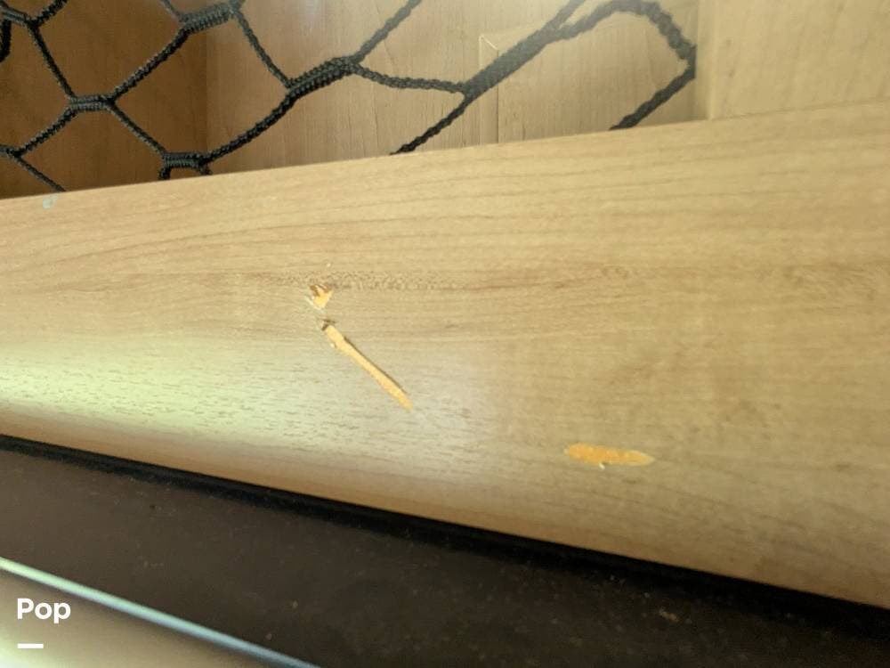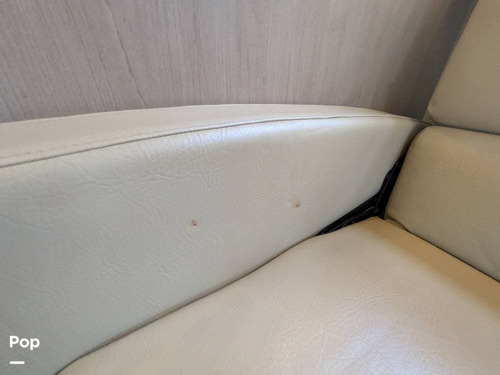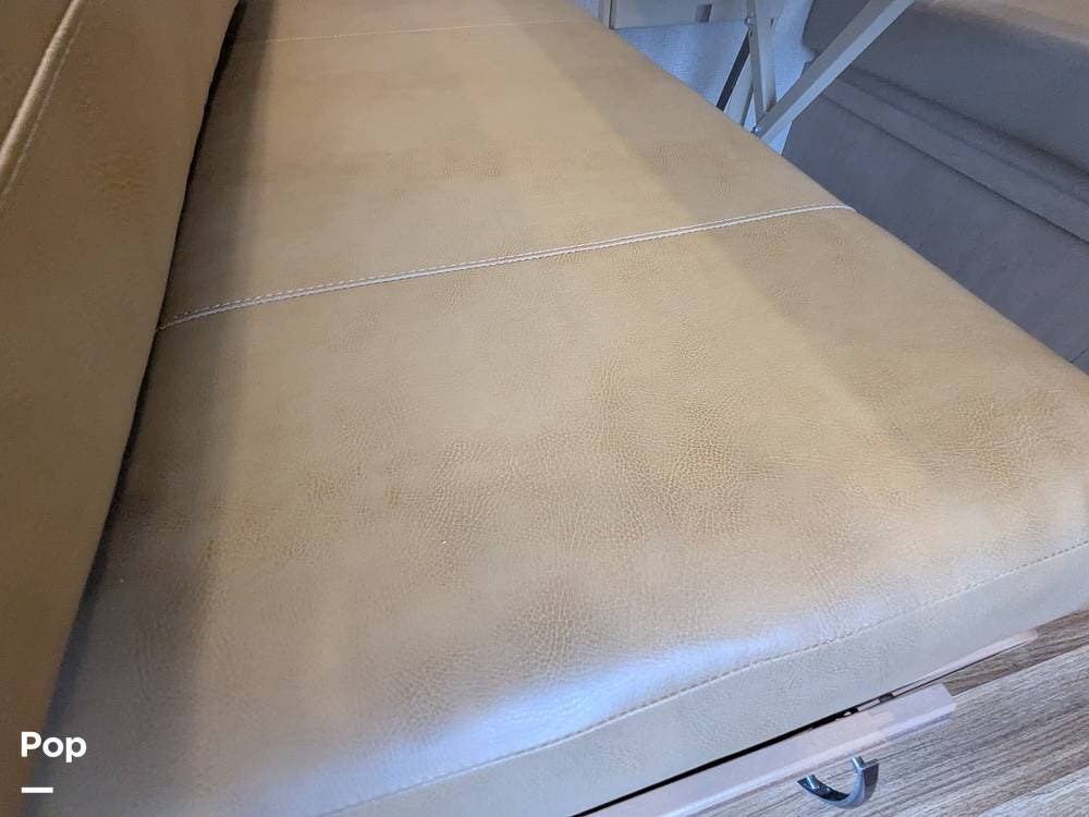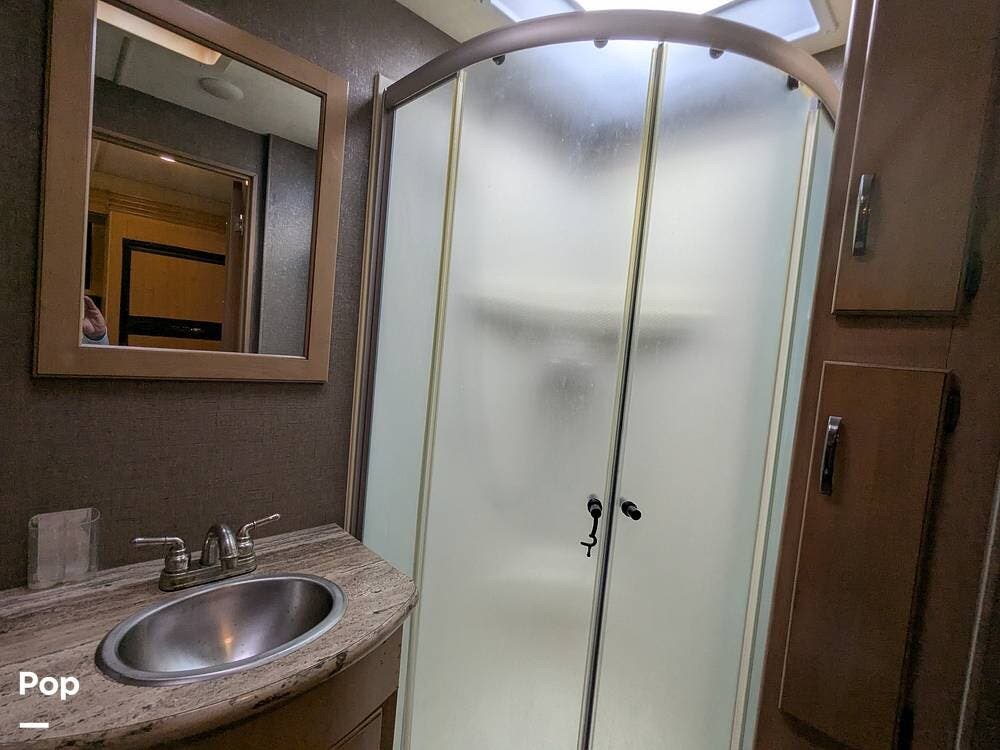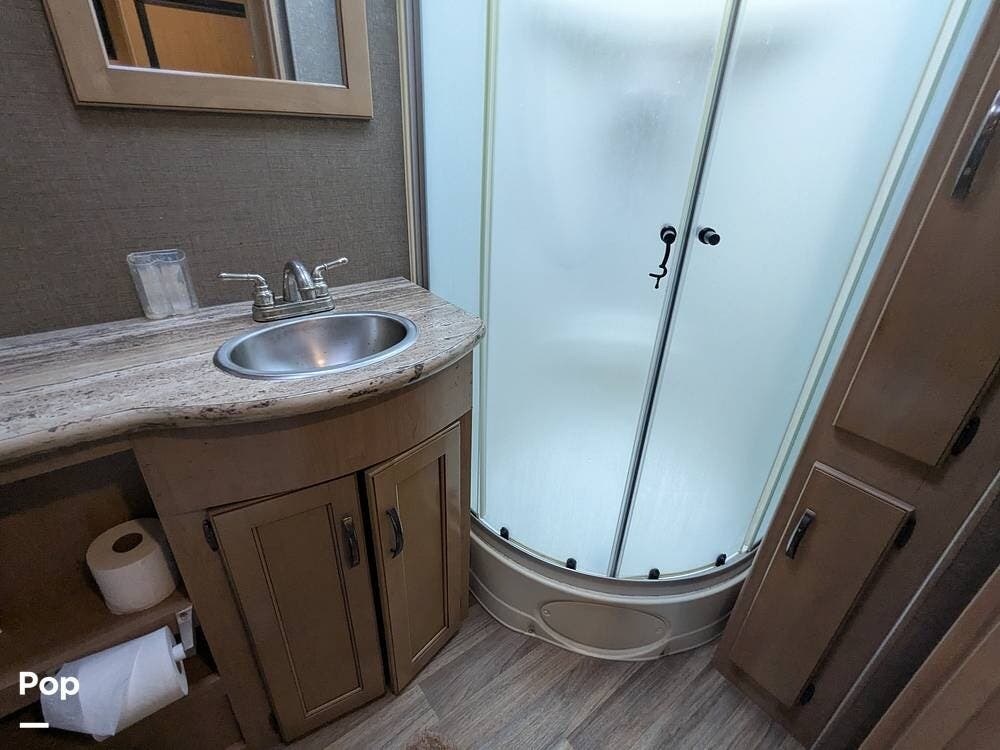 Additionally, there is an electric drop-down overhead bunk, a coffee table situated beneath the bunk between the two captain's seats, and a very large bathroom that includes a spacious corner shower, a vanity with a sink, linen storage, and overhead cabinets.