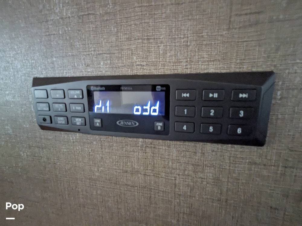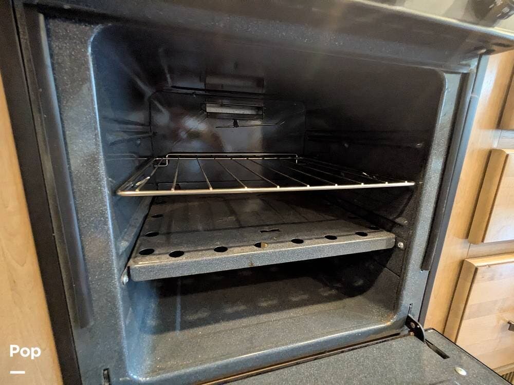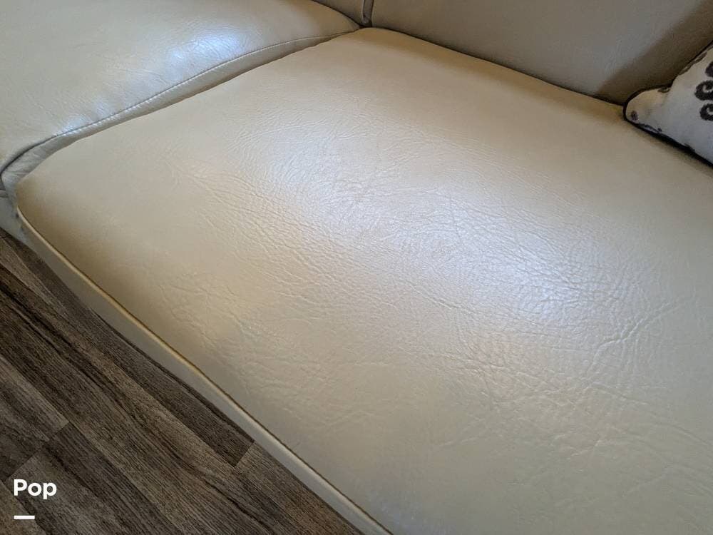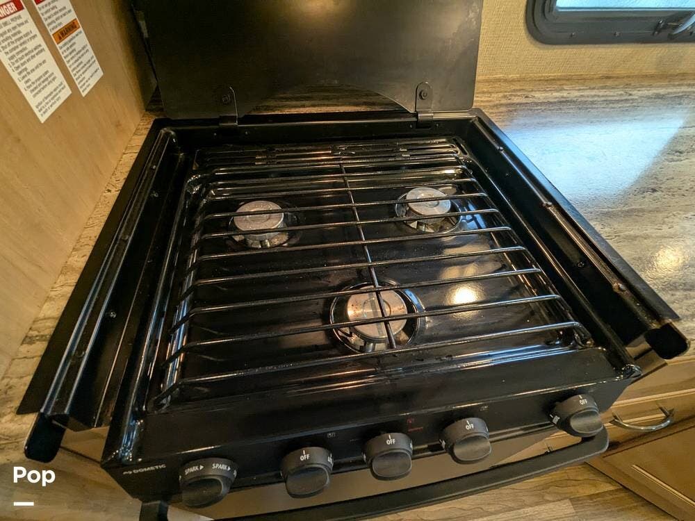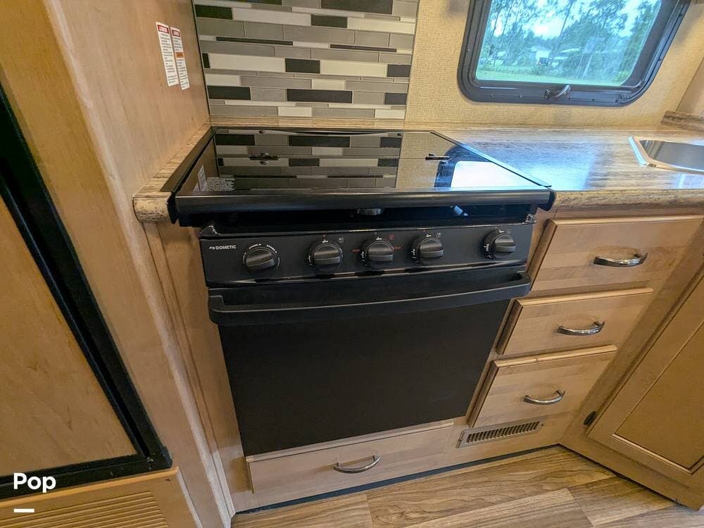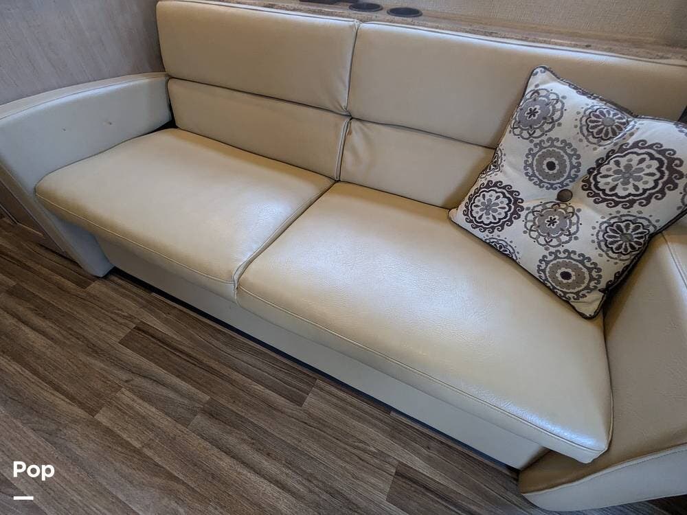 It comfortably sleeps 5 to 7 people and features a large super slide-out, making the interior very spacious. Notable amenities include a jack-knife sleeper sofa, a large stainless steel sink, a three-burner stove with an oven, an overhead microwave, a pantry with pull-out drawers, and a booth dinette with a 40" LED TV overhead.