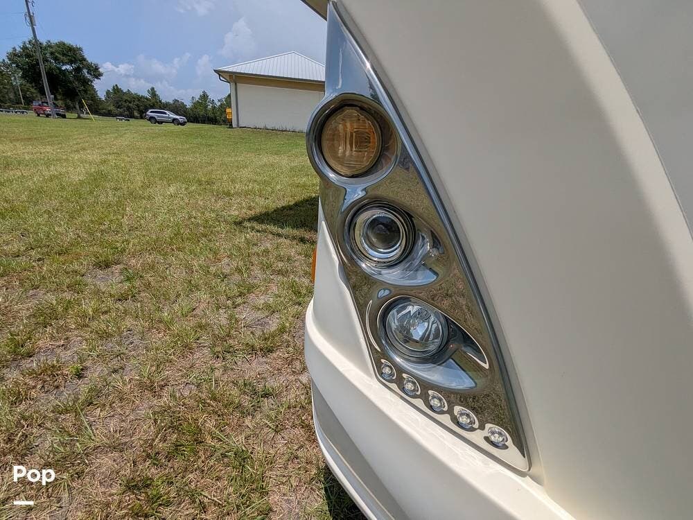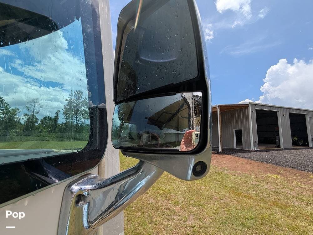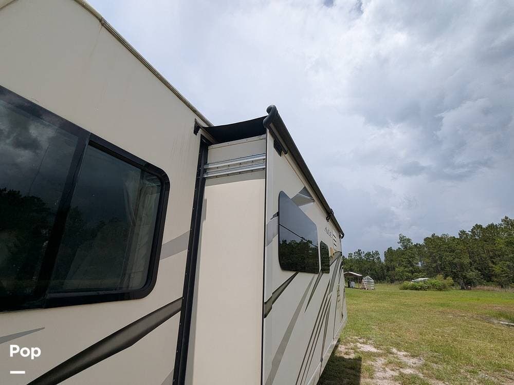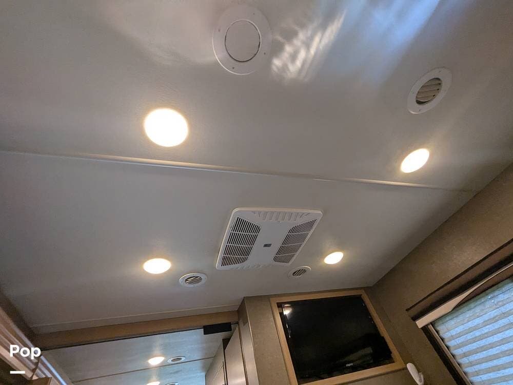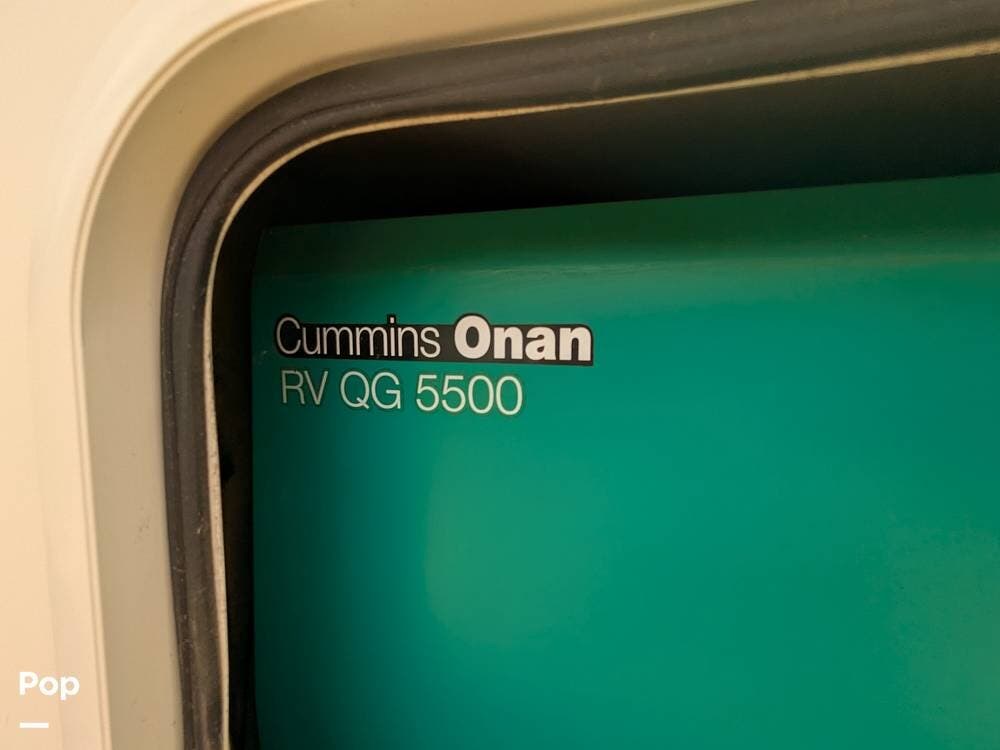 Other highlights include an exterior 32" LED TV, ample storage compartments, an electric awning, backup and side view cameras, a Bluetooth entertainment center with indoor and outdoor speakers, two A/C units, automatic leveling jacks, and a Cummins Onan generator.