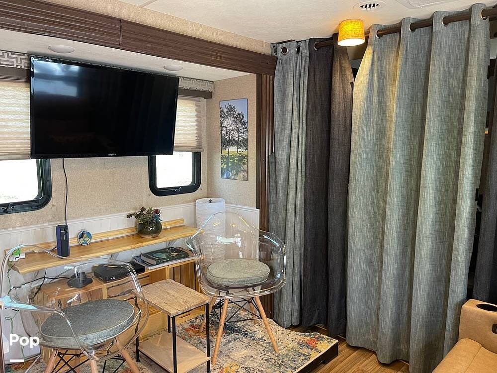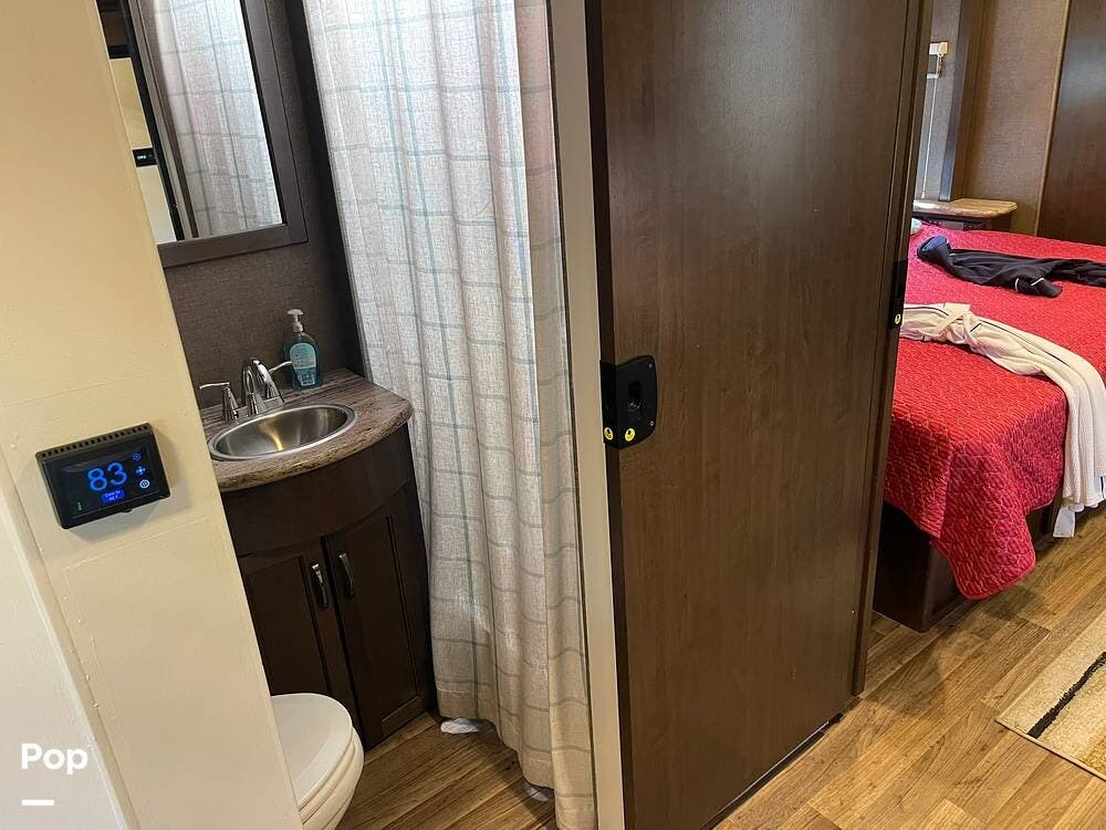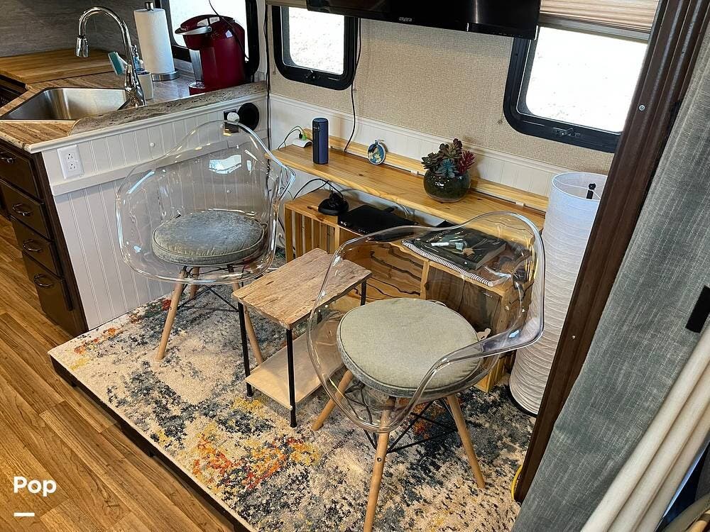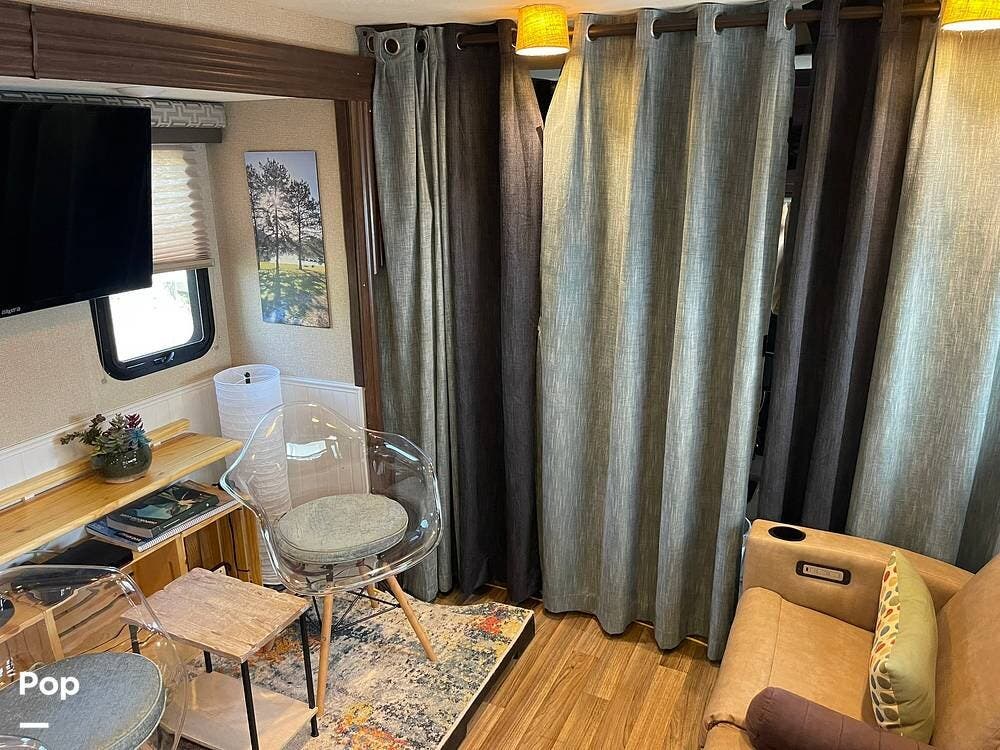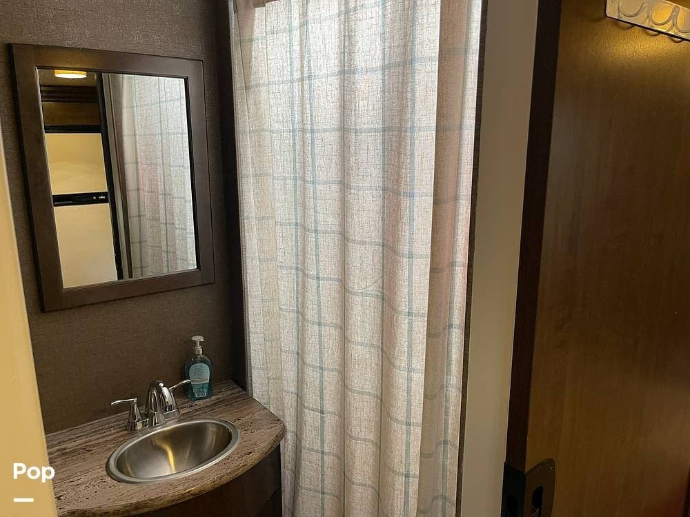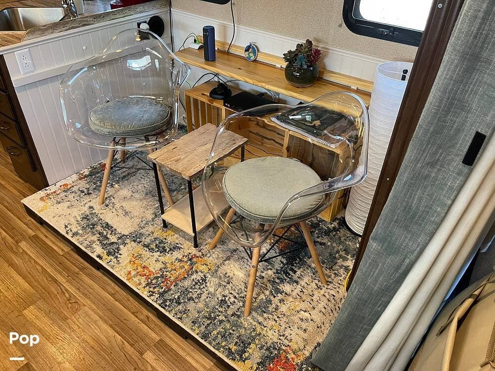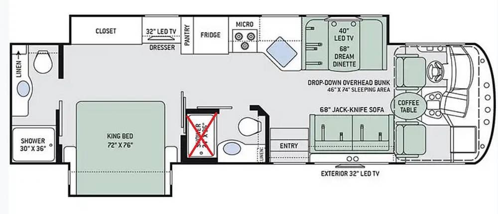 Upon entering, the guest full bath is to your left on the patio side, allowing for easy access. To your right is the living area, with a sofa on the patio side, and the booth dinette has been removed, making room for two chairs in the forward portion of the XL far wall slide.
