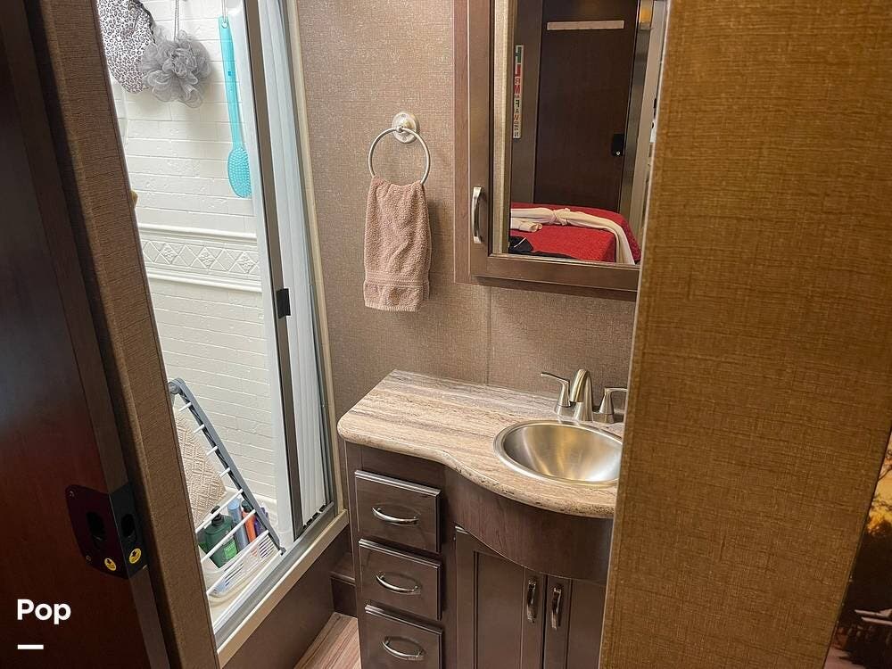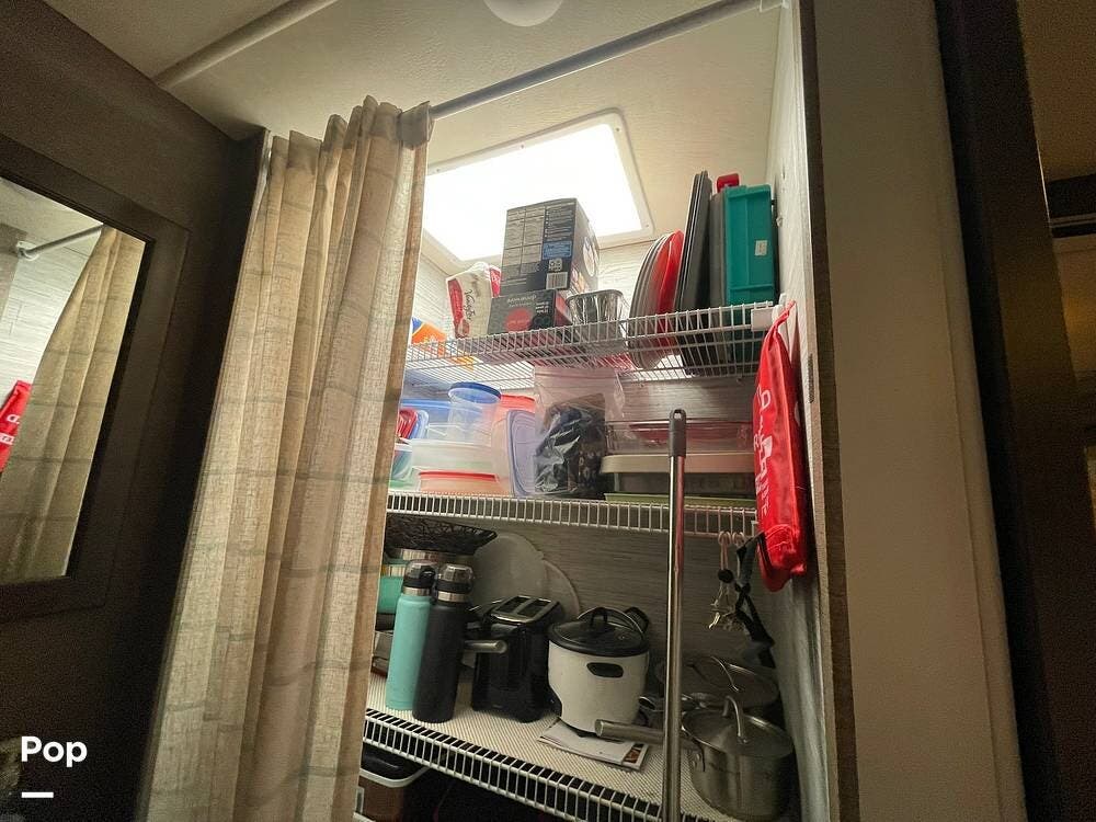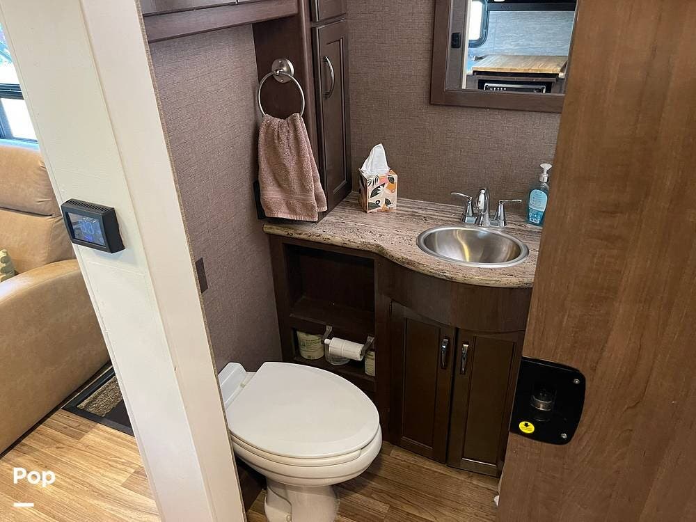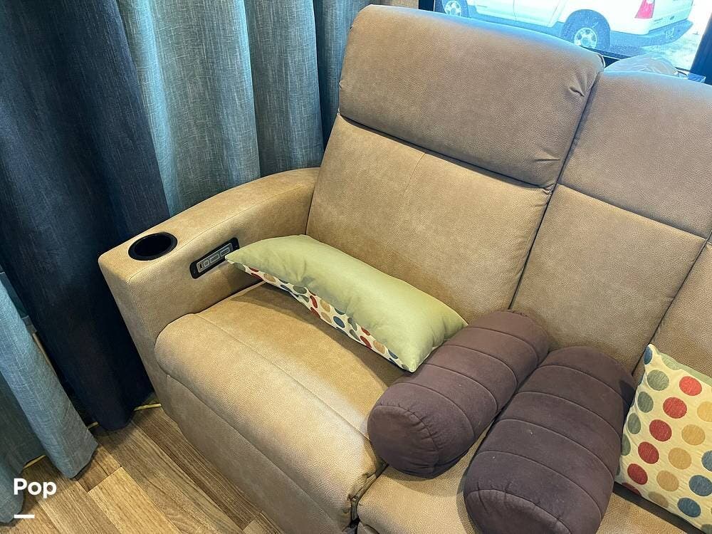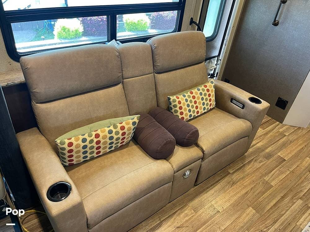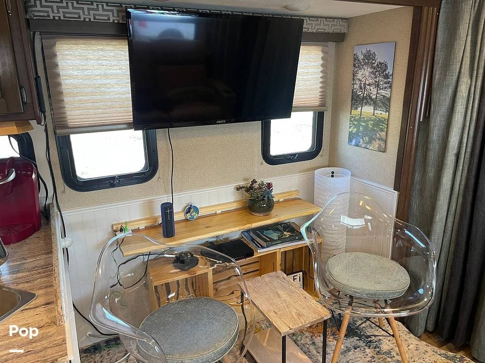 Upon entering, the guest full bath is to your left on the patio side, allowing for easy access. To your right is the living area, with a sofa on the patio side, and the booth dinette has been removed, making room for two chairs in the forward portion of the XL far wall slide.