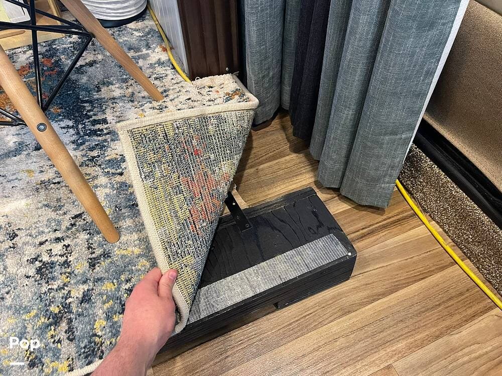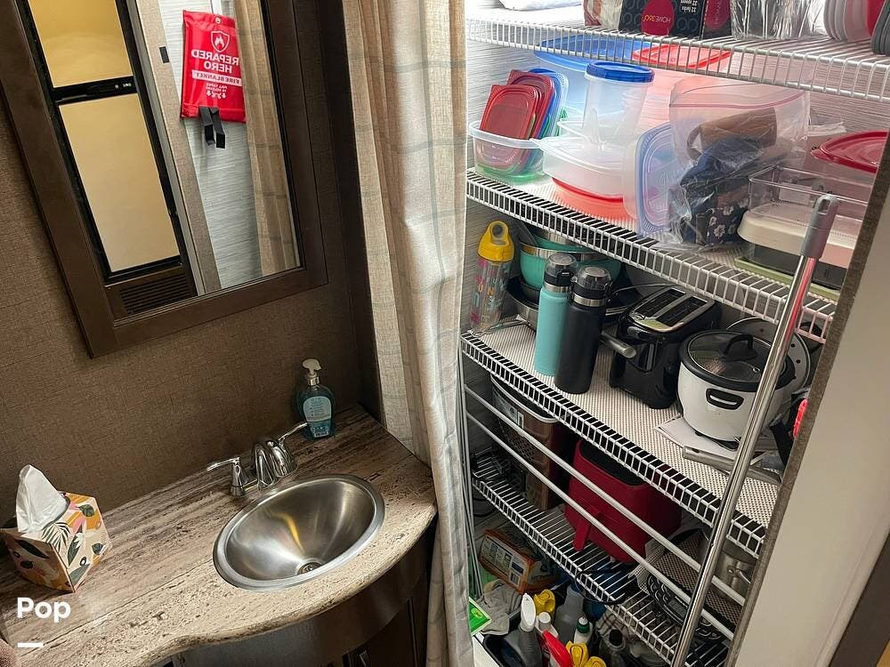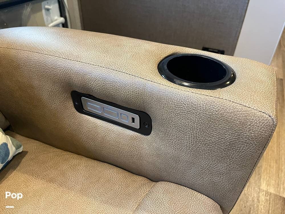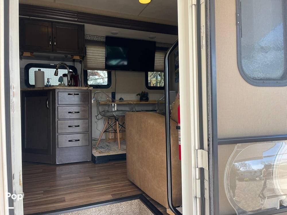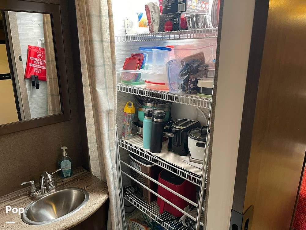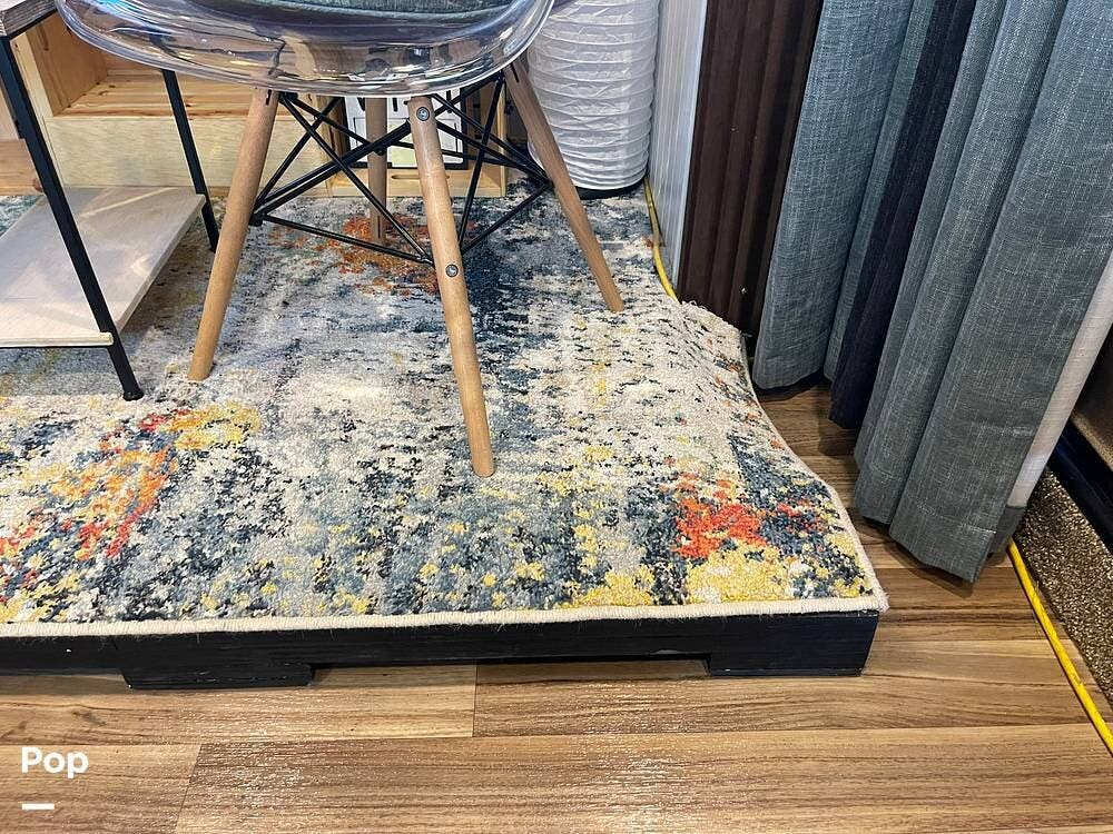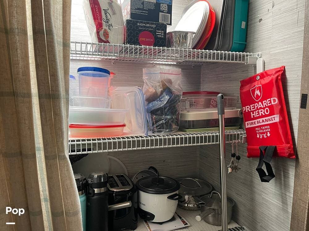 Upon entering, the guest full bath is to your left on the patio side, allowing for easy access. To your right is the living area, with a sofa on the patio side, and the booth dinette has been removed, making room for two chairs in the forward portion of the XL far wall slide.