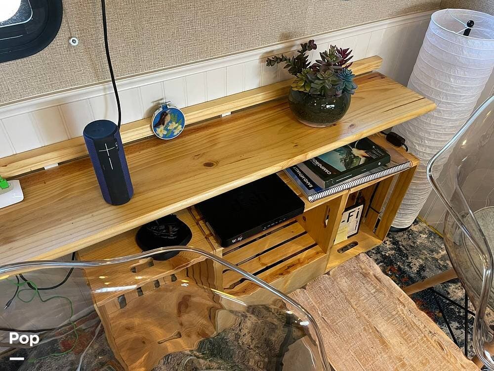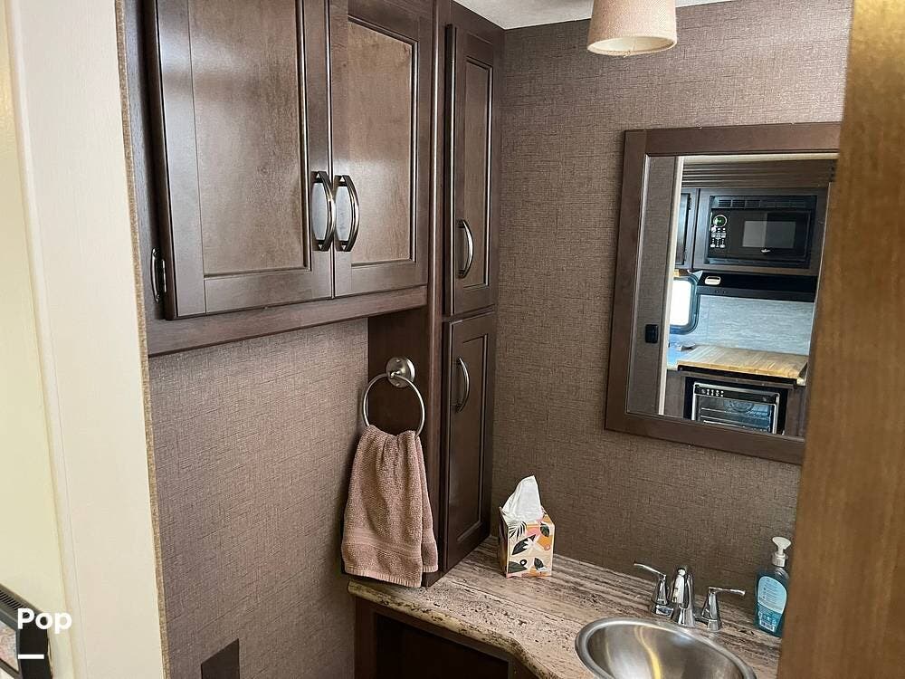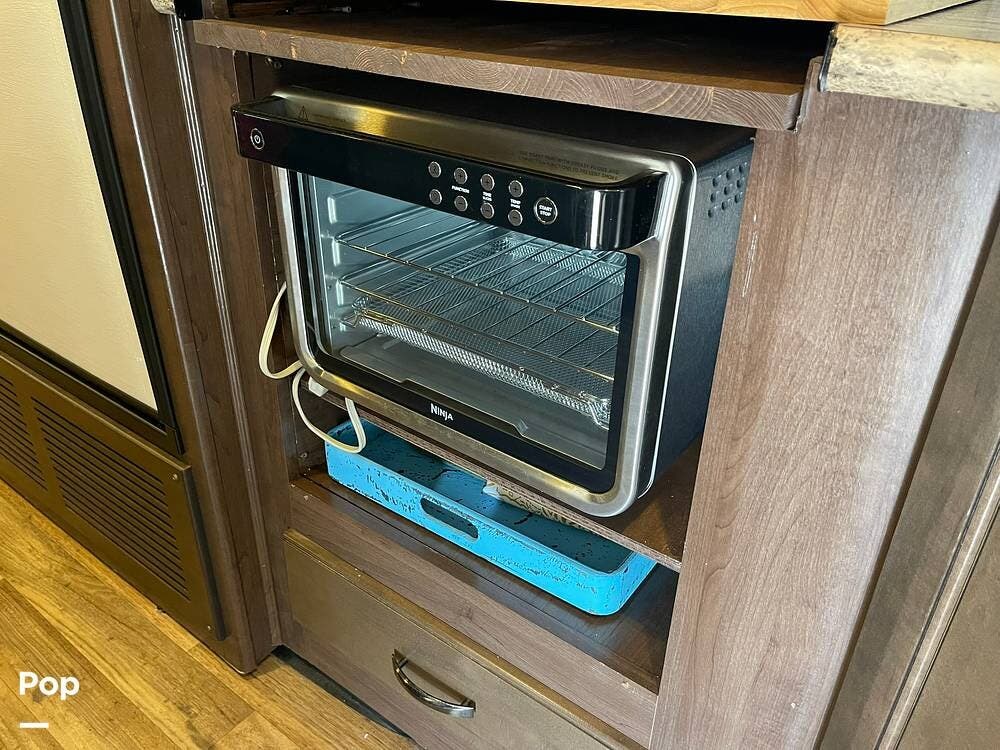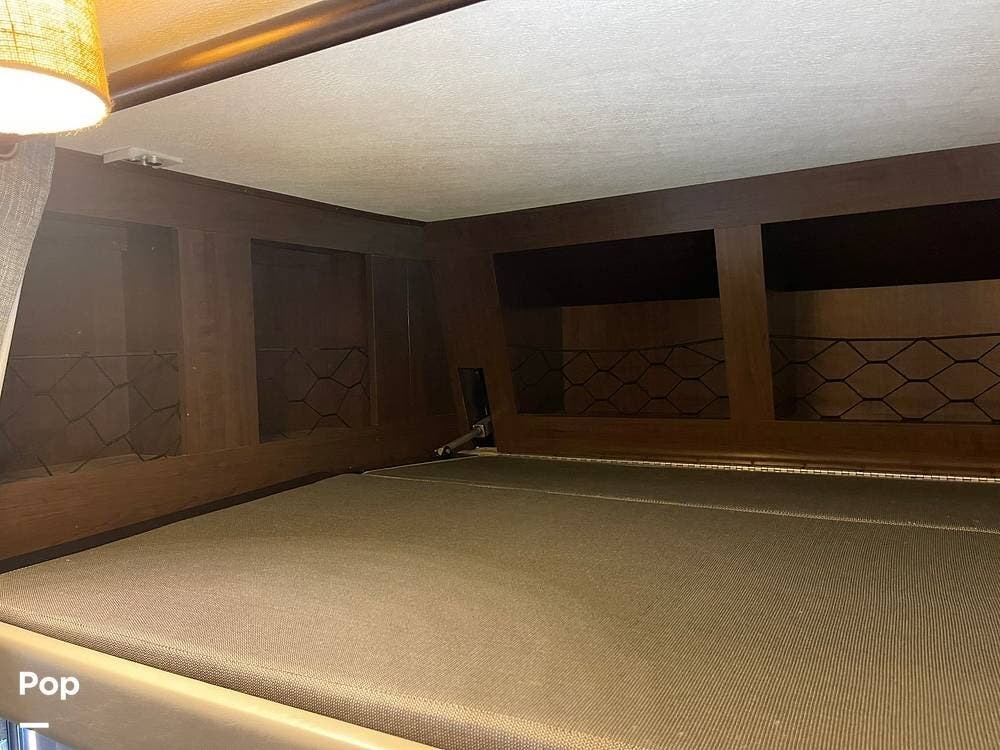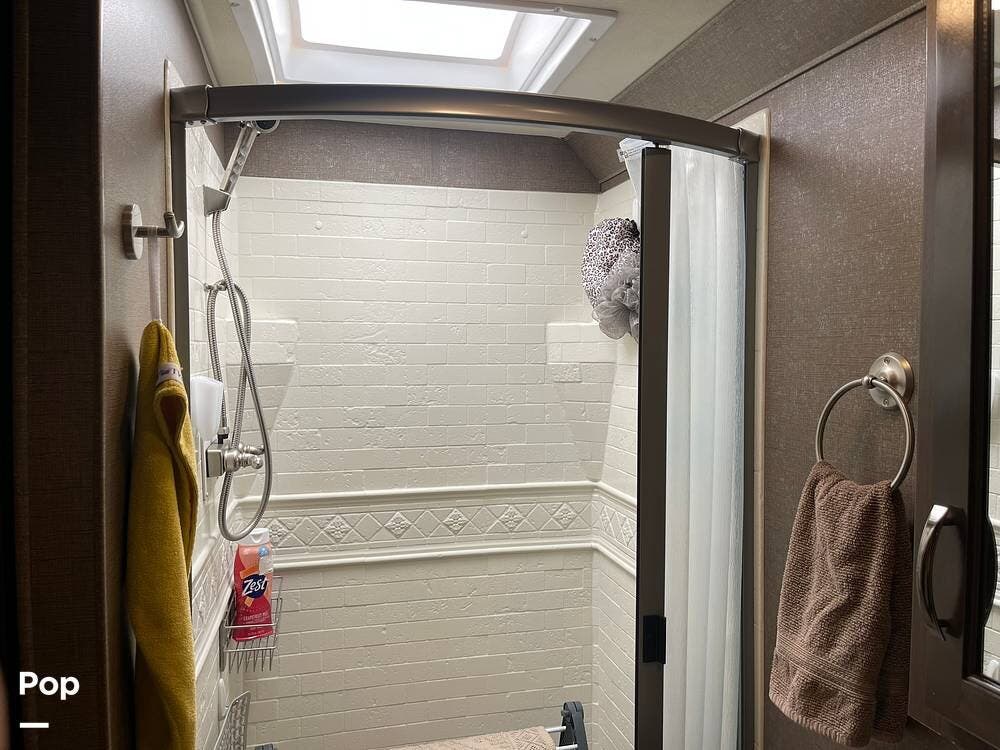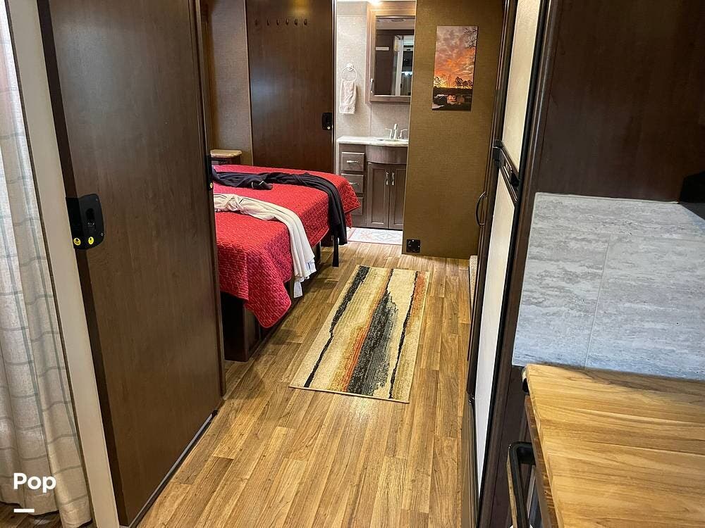 Upon entering, the guest full bath is to your left on the patio side, allowing for easy access. To your right is the living area, with a sofa on the patio side, and the booth dinette has been removed, making room for two chairs in the forward portion of the XL far wall slide.