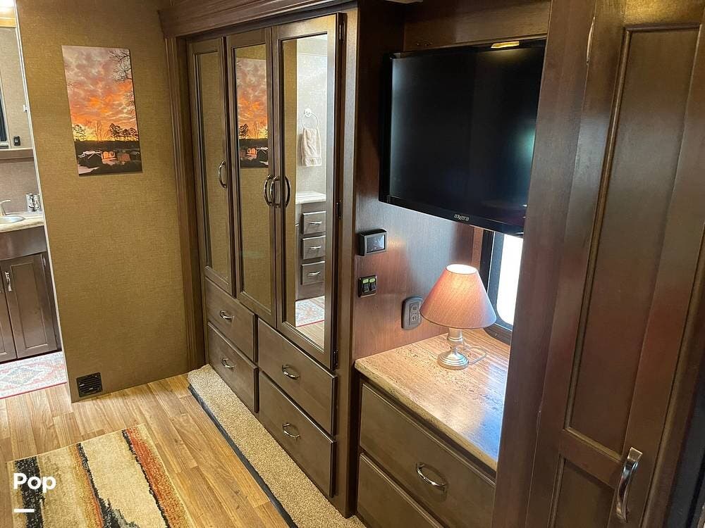 The kitchen is fully contained within the midsection of the XL far wall slide, and upon entering the rear bedroom, the slide ends with an entertainment center and closet. The slide-out king bed is on the patio slide with access on both sides, and the bedroom's second full bath is in the width of the rear of the RV.