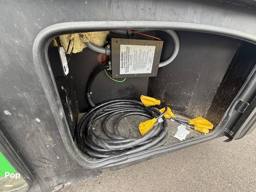 Safety and convenience features include a backup monitor, auto-start generator, side-view cameras, automatic leveling jacks, and a 2000-watt inverter with 100-watt solar charging.