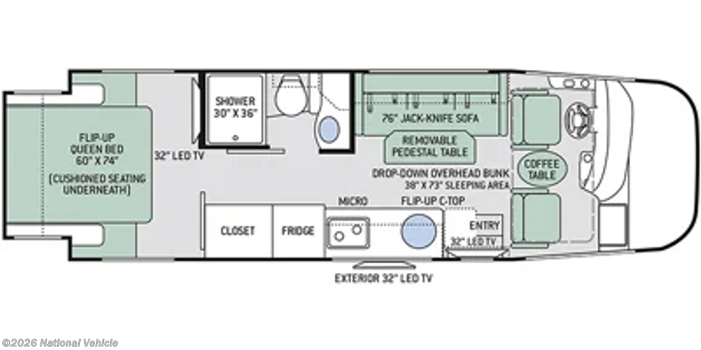 If you want a vehicle that is going to enhance your traveling experience but won't burden you down, then you need this Axis Class A gas motorhome. The flip-up queen bed and powered drop-down bunk over the cab are two perfect examples of the multi-purpose opportunities this motorhome provides. Whether you're lounging on the jackknife sofa while enjoying your favorite movie on the 32" LED TV, or you're seated in one of the reclining/swivel chairs in the cockpit, you will feel the comfort throughout.
