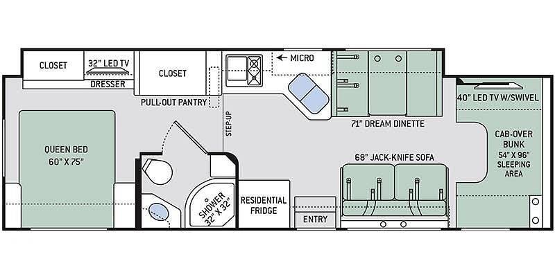 This RV is powered by a Ford Triton 6.8L V10 powerhouse with 8000 lb towing capacity. There is a 4.0kW generator that powers all electrical requirements if you decide to boondock.