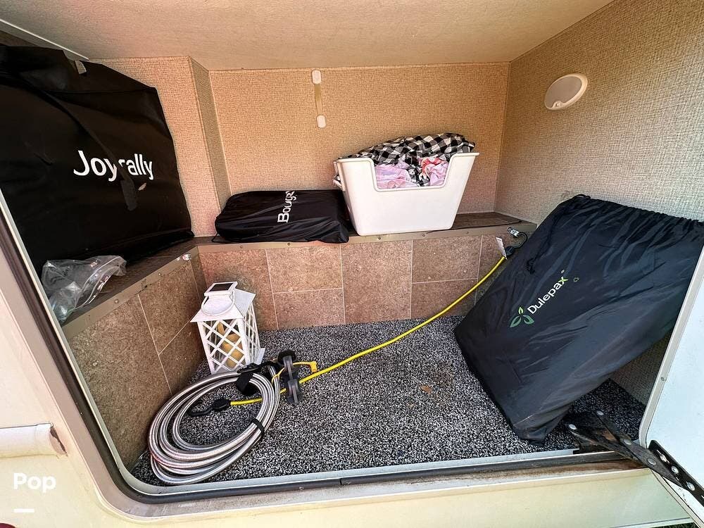 On the exterior, you have all the normal utility hookups, leveling jacks, a 16' patio awning with an exterior TV, a roof access ladder, a tire pressure monitoring system, plus lots of built-in storage.
