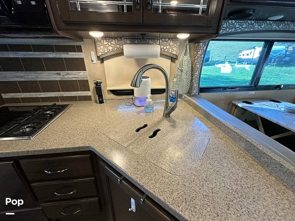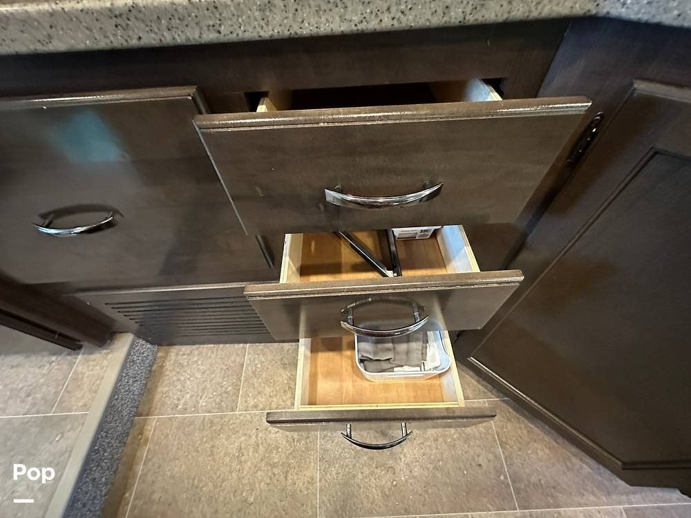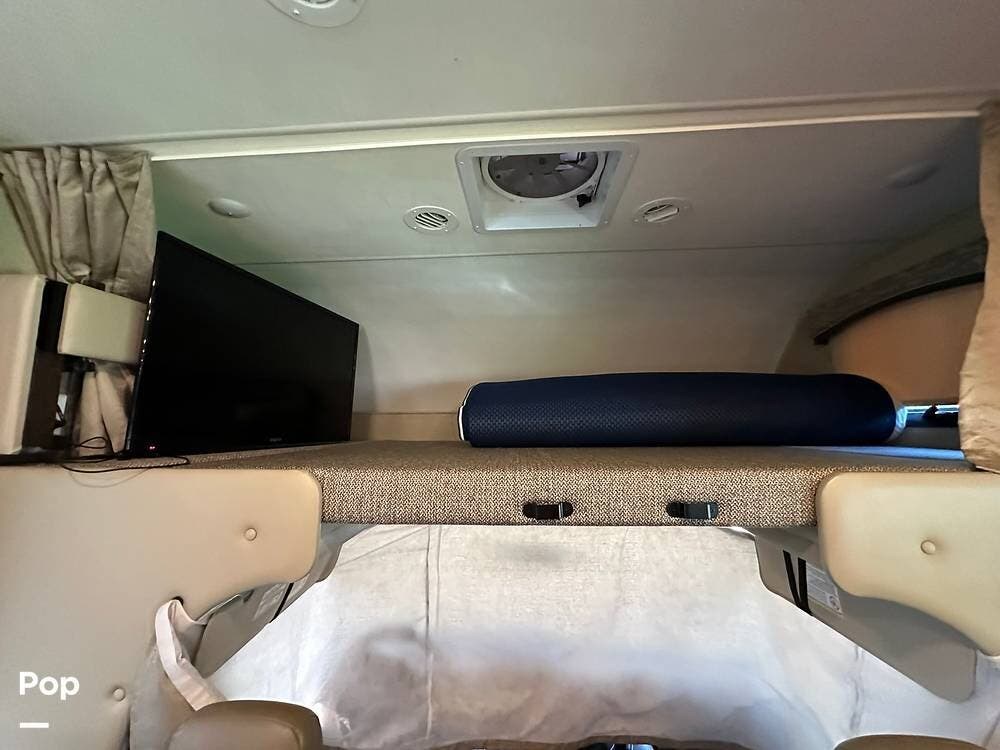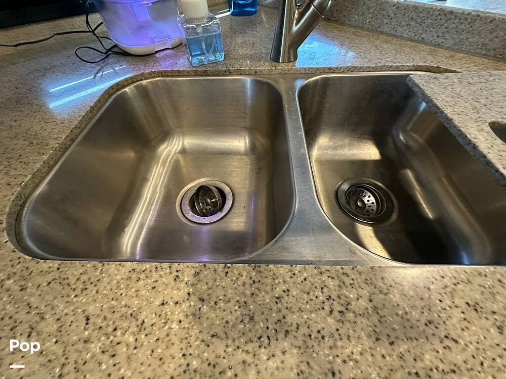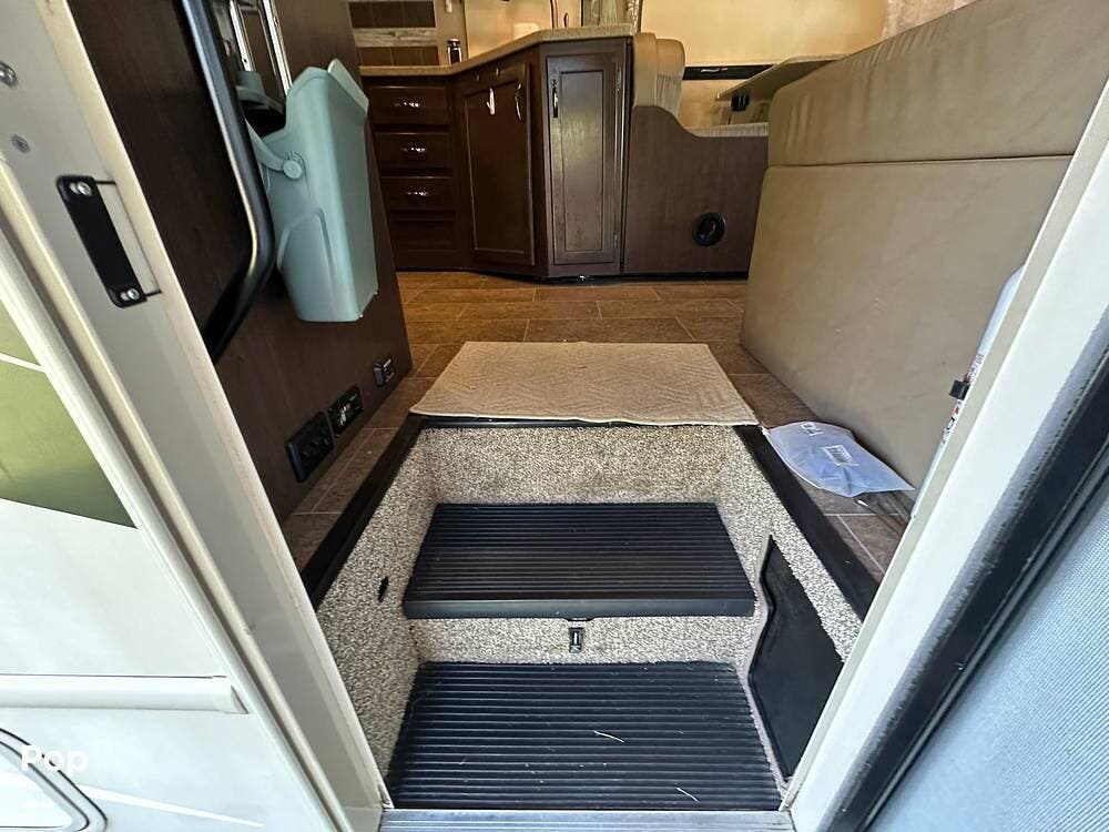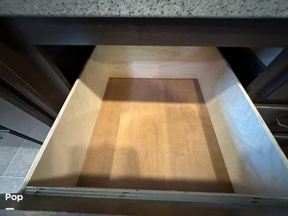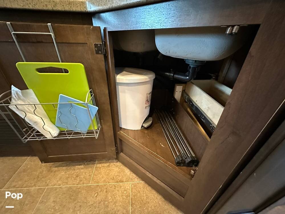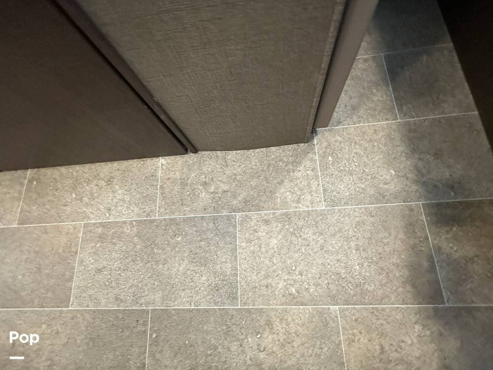 Stepping inside, you will notice the popular white, tan, and wood colors, along with light-colored flooring, a large countertop, cabinets, and large windows, which make every day onboard extra comfortable.