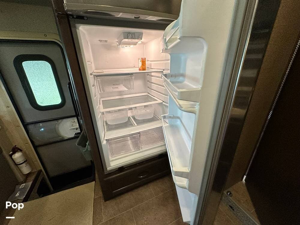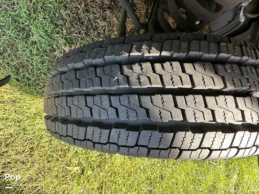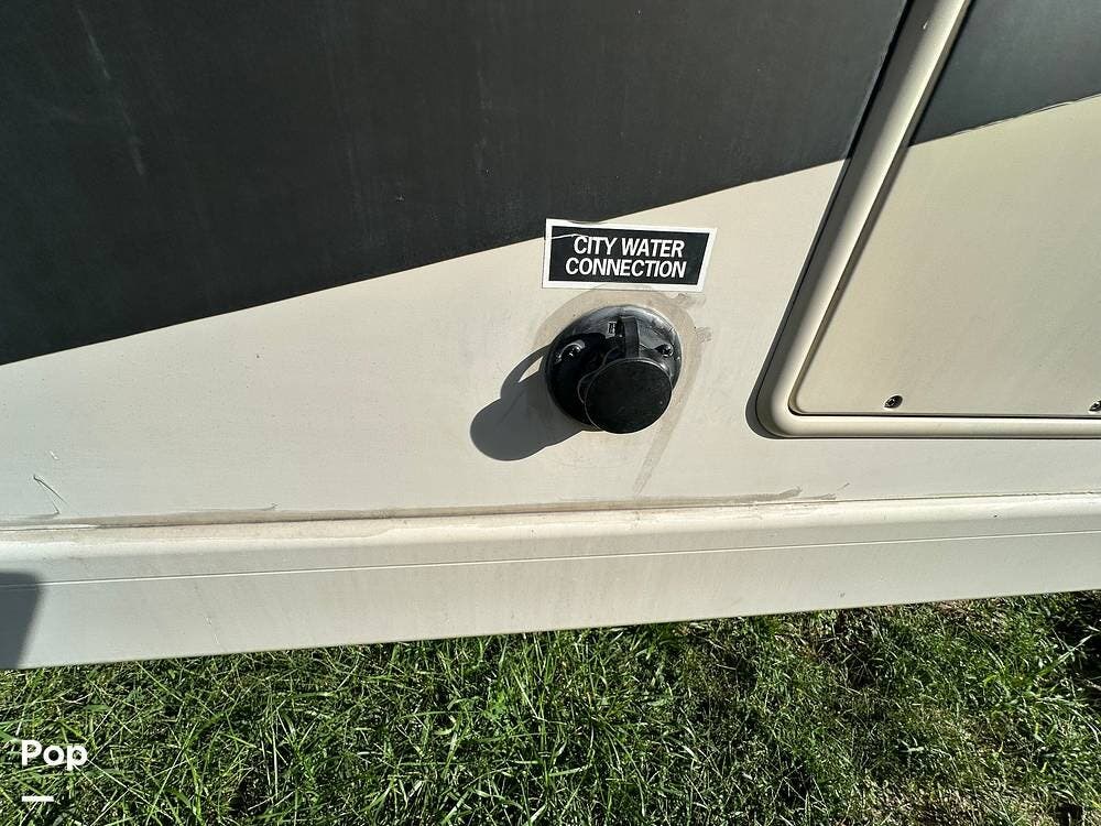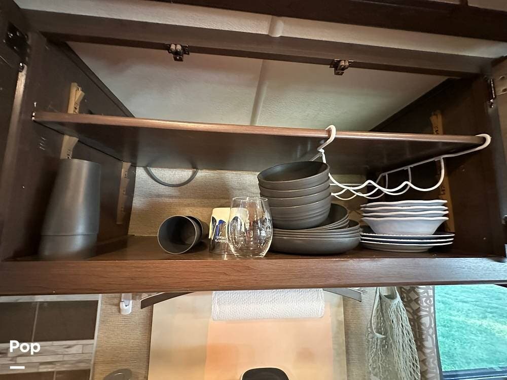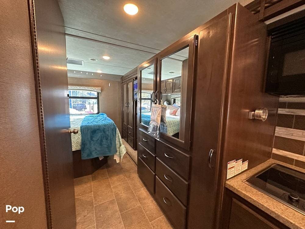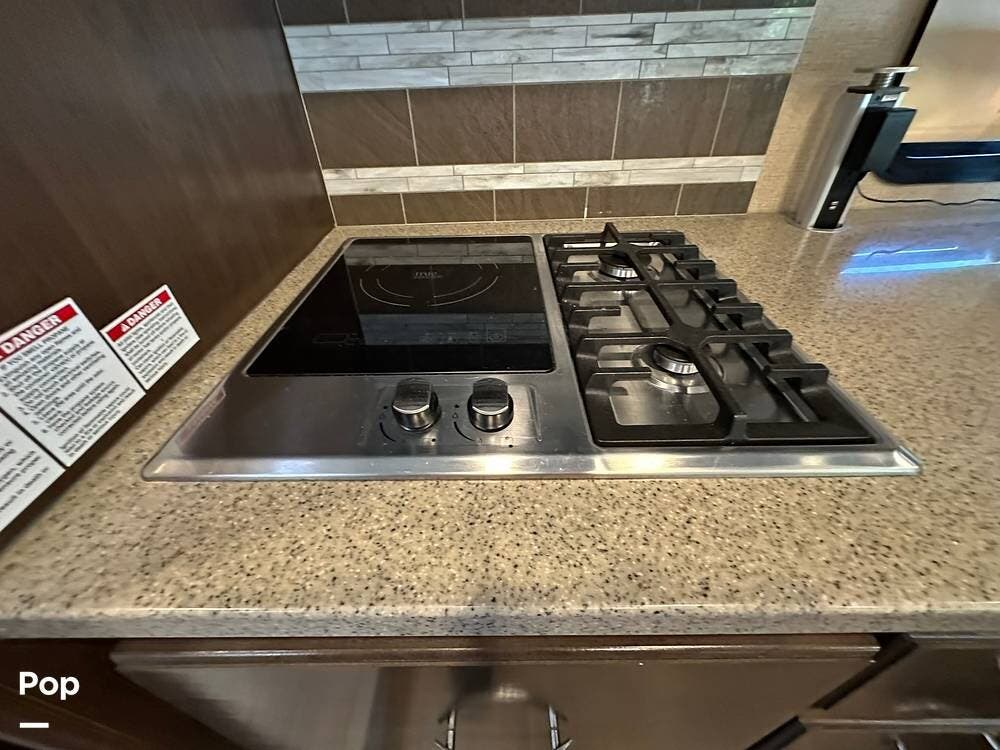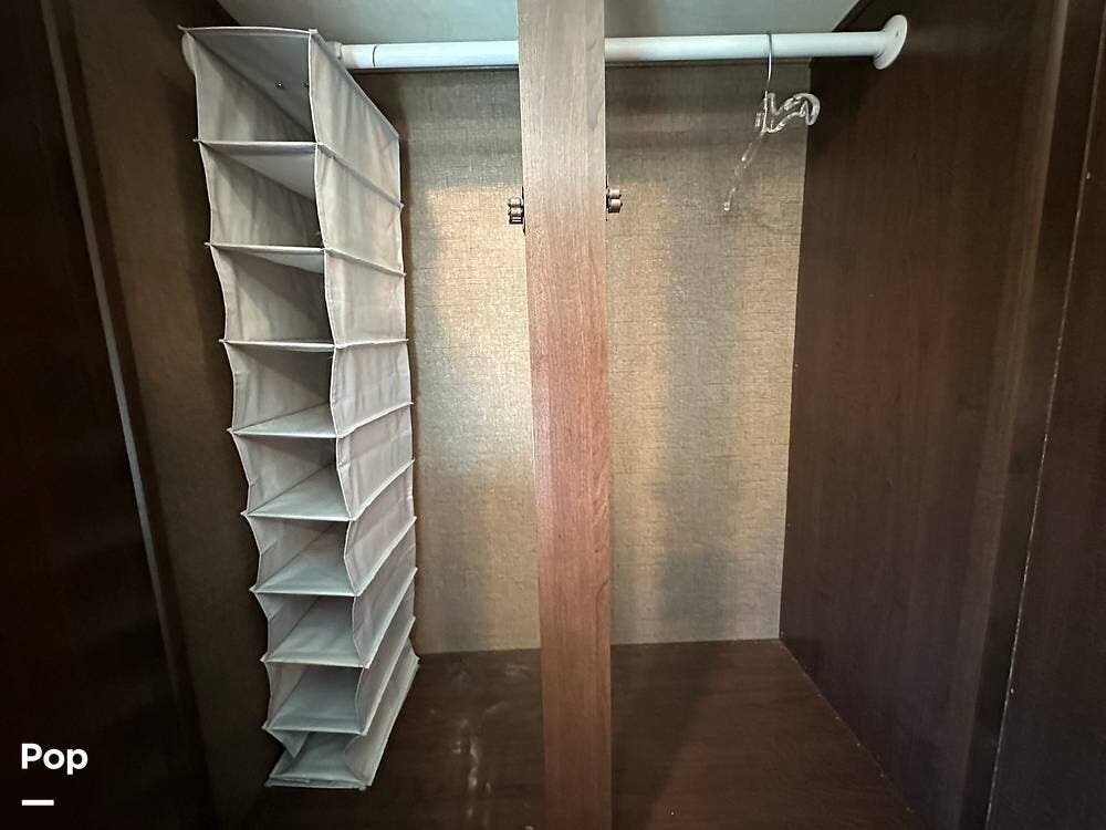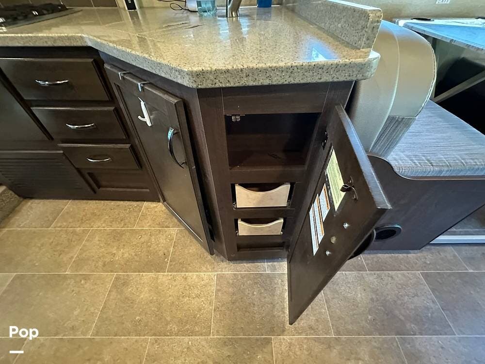 Stepping inside, you will notice the popular white, tan, and wood colors, along with light-colored flooring, a large countertop, cabinets, and large windows, which make every day onboard extra comfortable.