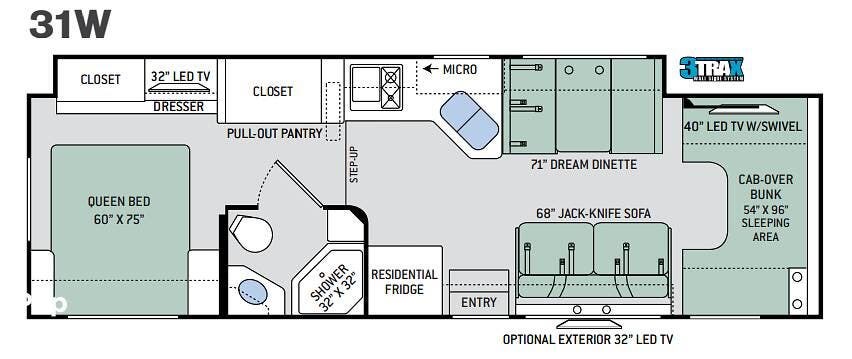 On the exterior, you have all the normal utility hookups, leveling jacks, and a 16' patio awning. There is an external coax hookup for an external TV. The outer storage compartments are huge for whatever you need to take on your travels.